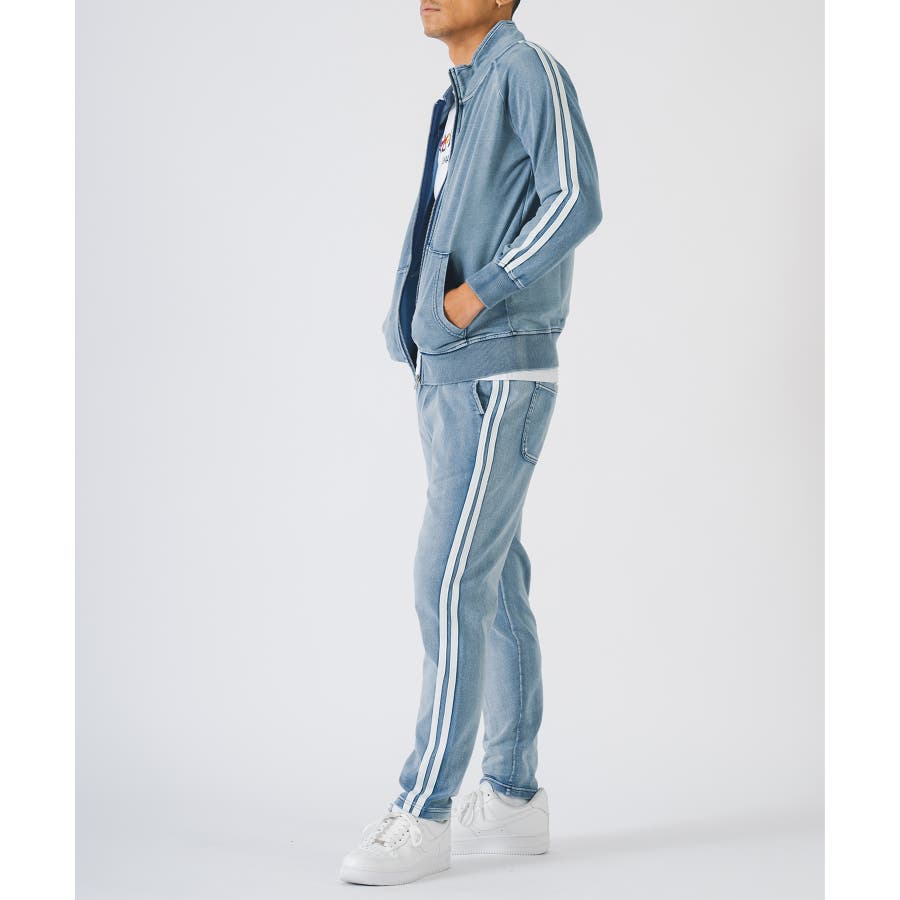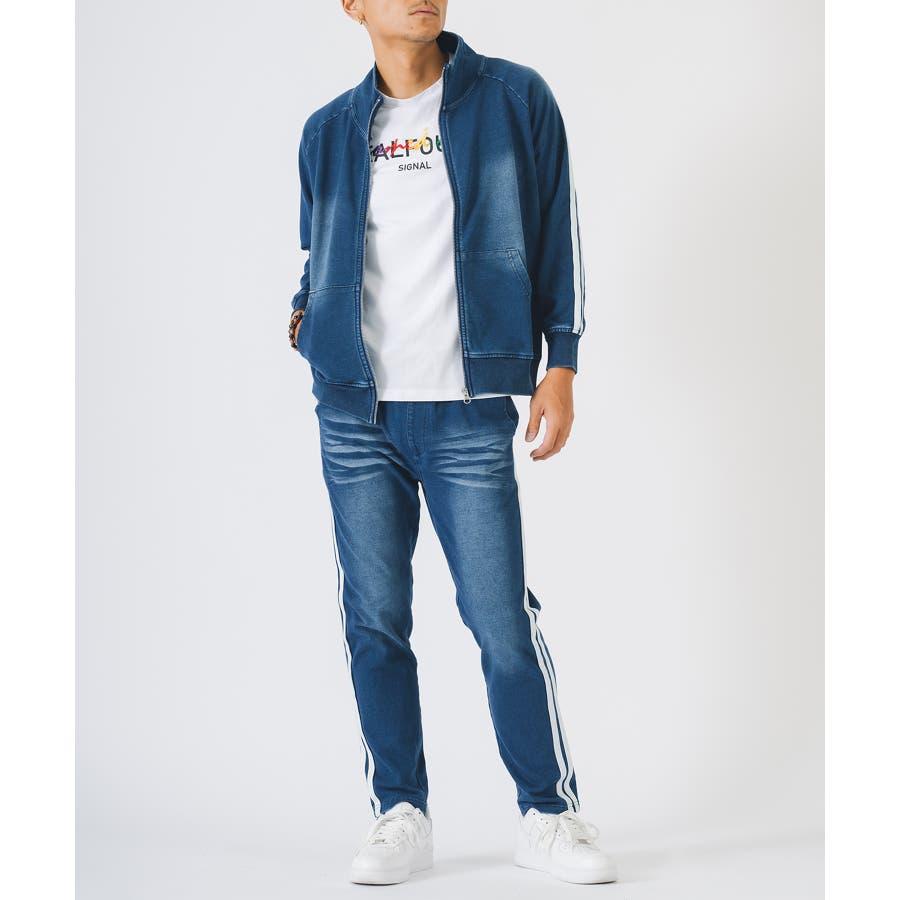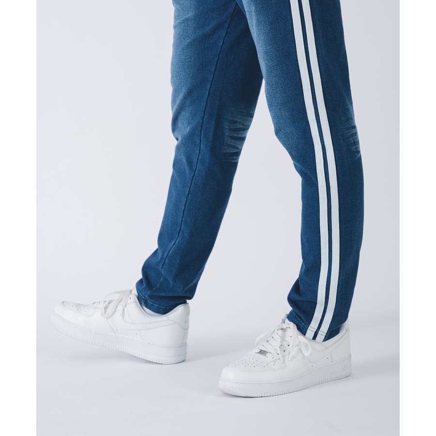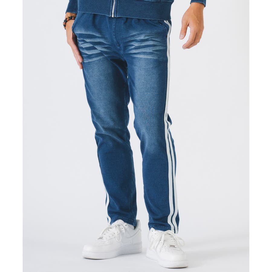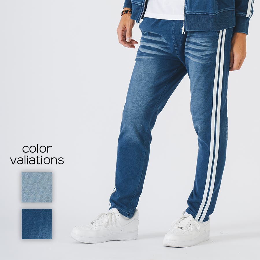 スウェット素材なのでストレッチ性も高く着やすくてイージーケア。リアルなデニムの様な色合いと穿き込んだ様な色落ち感の仕上がりが絶妙です。特に濃色のネイビーの方はよりその濃淡が味わえます。