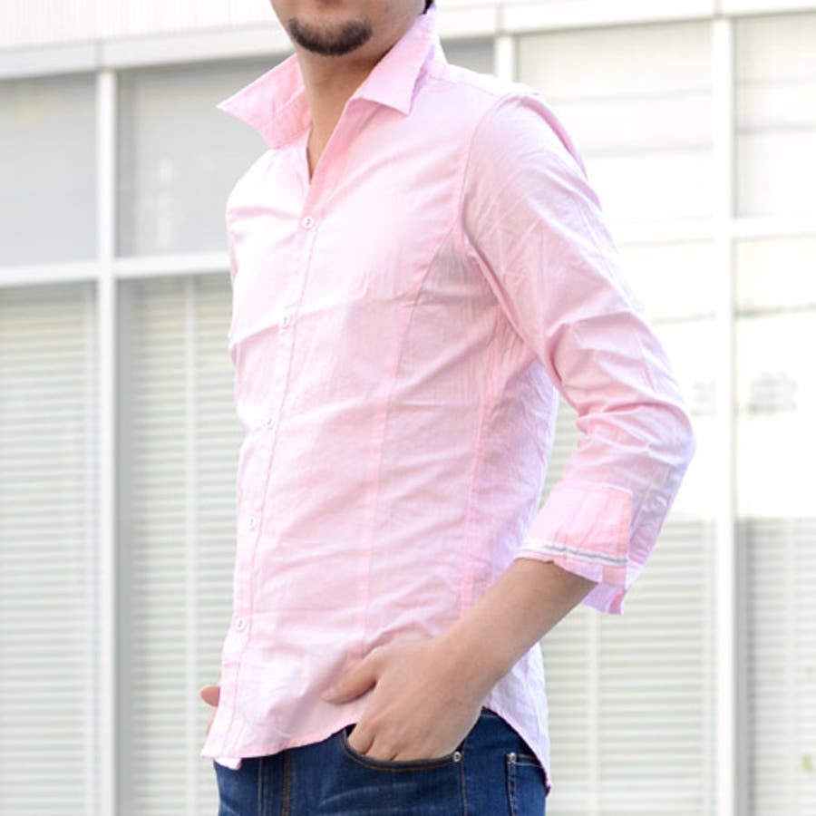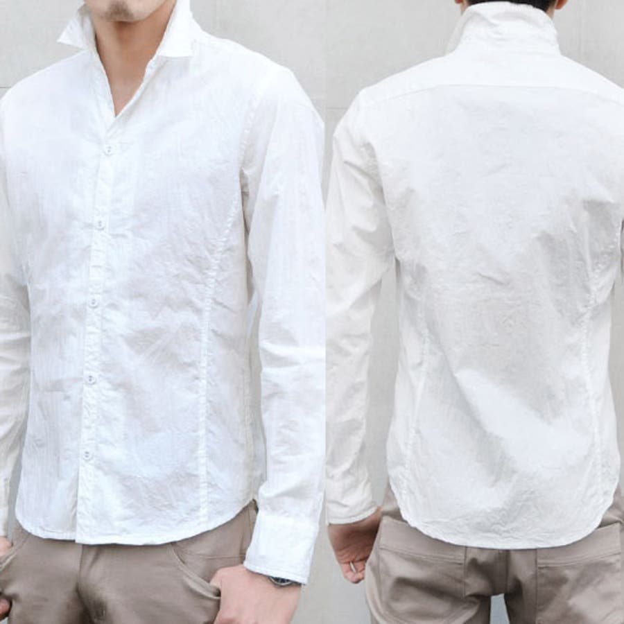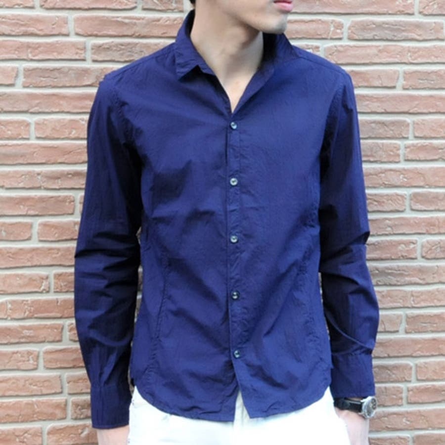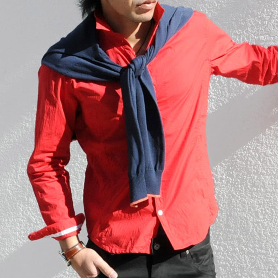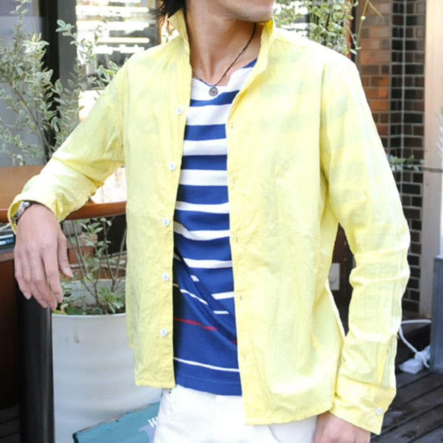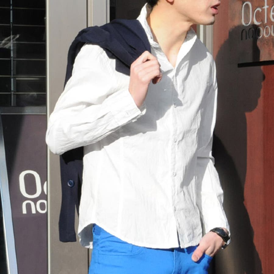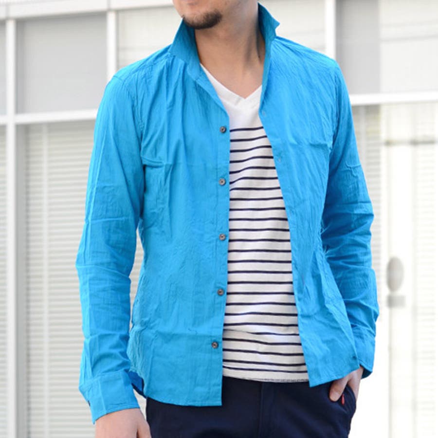 無地の綿100%生地にしわ加工を施した、シンプルなカラーシャツで、単体で着用しても、アウターやTシャツ等のインナーとのコーディネートで着用してもよくマッチします。