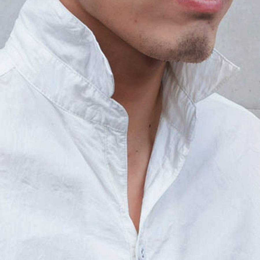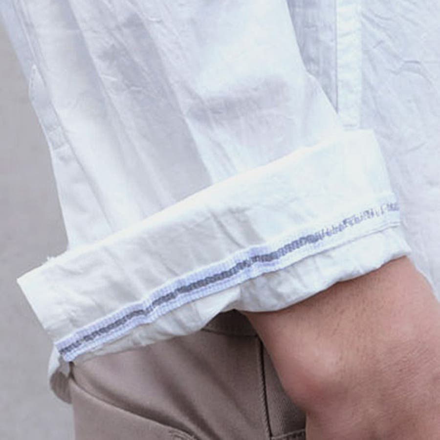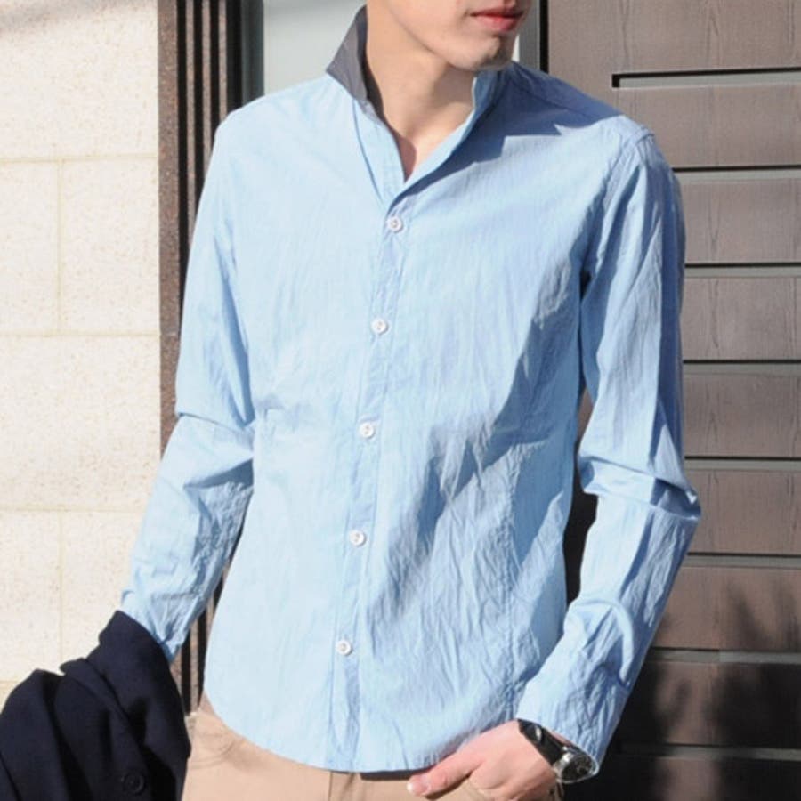衿の第一ボタンを付けていない仕様で、立衿での着用も楽しめます。コーディネイトに困った時の必須アイテムとして活躍します。