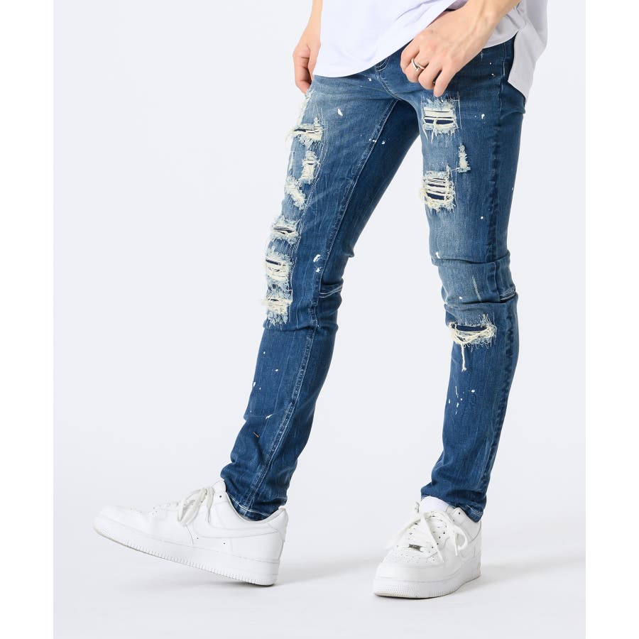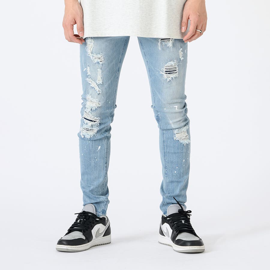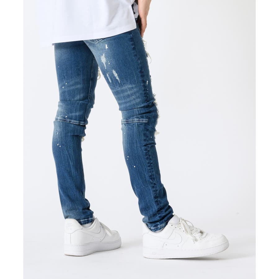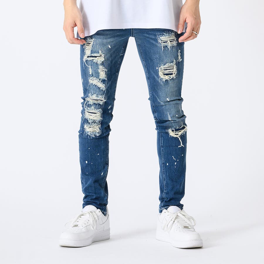 タイトなスキニ―デニムはこれからのトレンド。太いシルエットに飽き飽きした人には新鮮なシルエット。12オンスのしっかりとした高級デニムに、ペンキのペインティング加工古着風のダメージリペアー加工履きこなしたダメージ感を演出するブラスト加工折りシワ、履きシワを演出したひげ加工を1本1本手作業で作成したこだわりの1本です。ストレッチも効いていて、履き心地は抜群で、脚長効果もGOOD.ビッグなゆるーいトップスと合わせて今風に着こなしてほしい。