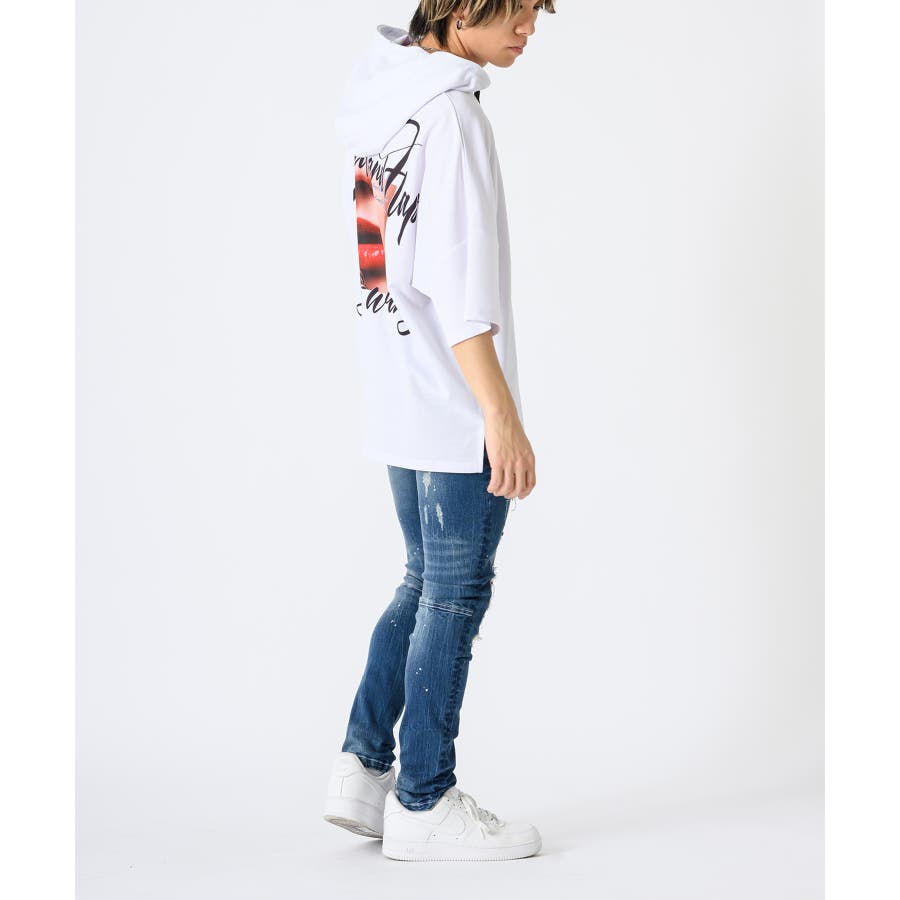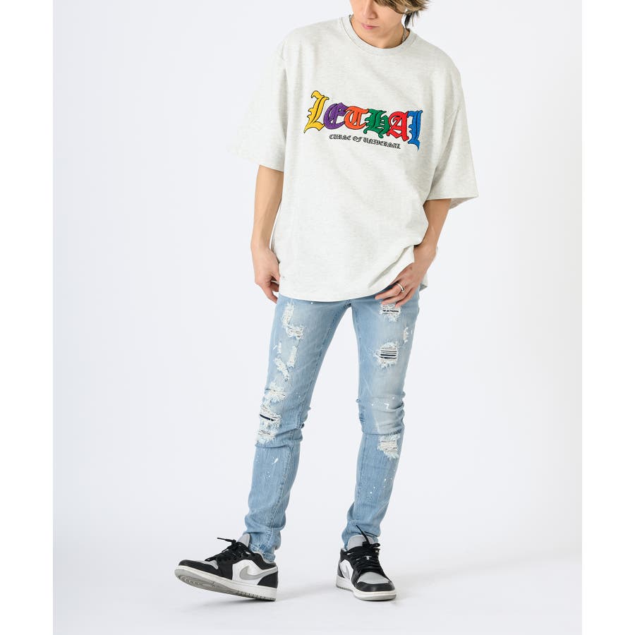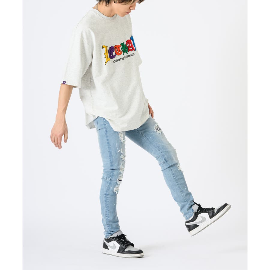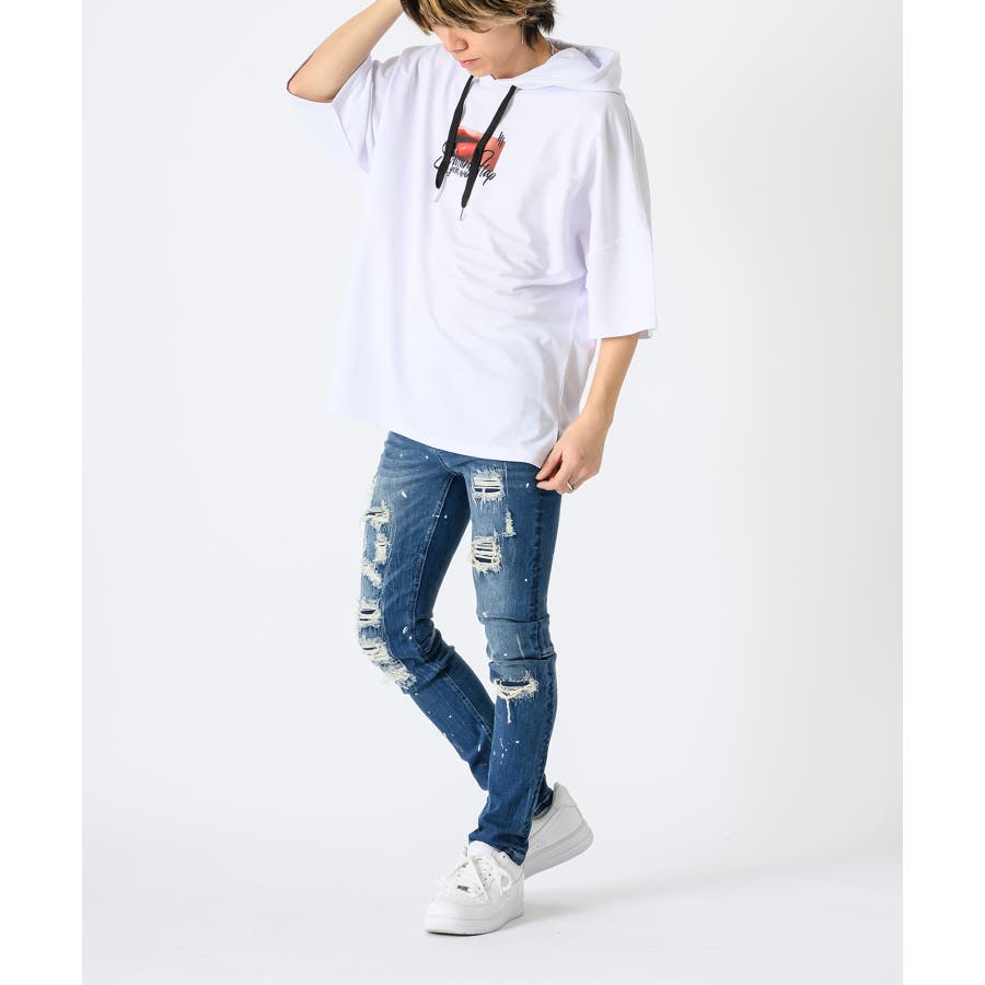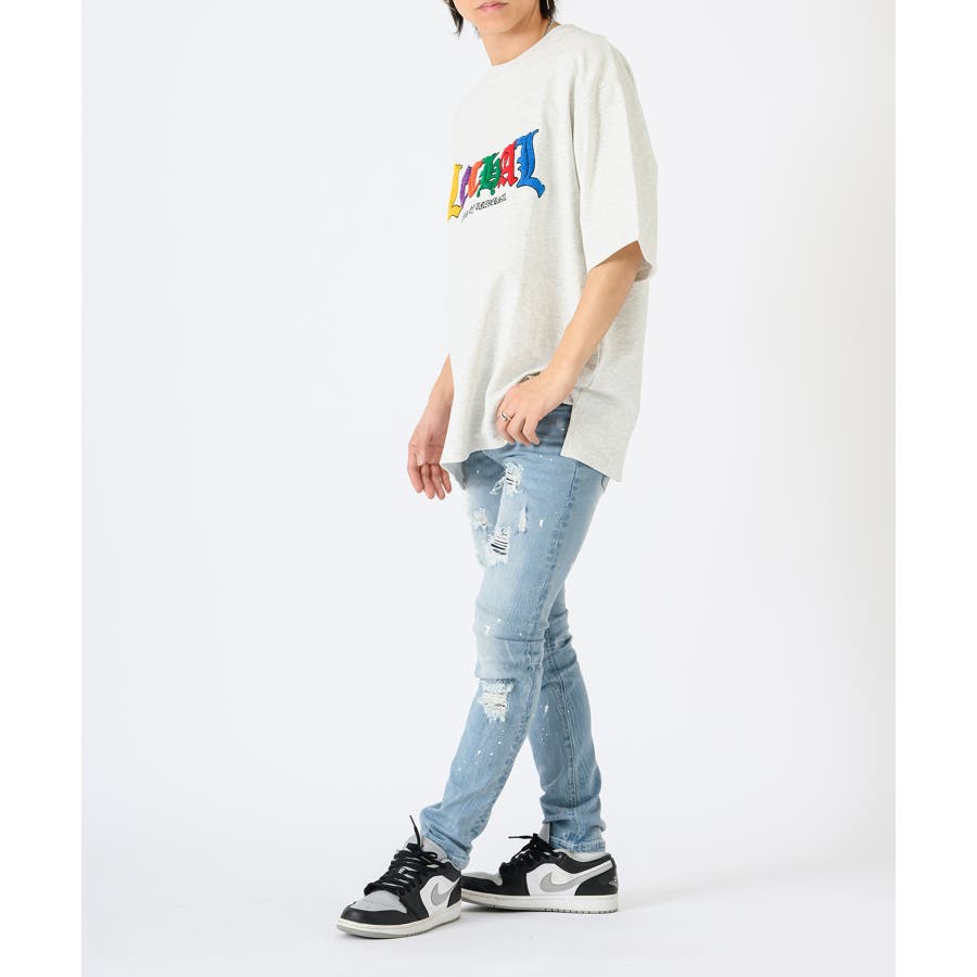 タイトなスキニ―デニムはこれからのトレンド。太いシルエットに飽き飽きした人には新鮮なシルエット。12オンスのしっかりとした高級デニムに、ペンキのペインティング加工古着風のダメージリペアー加工履きこなしたダメージ感を演出するブラスト加工折りシワ、履きシワを演出したひげ加工を1本1本手作業で作成したこだわりの1本です。ストレッチも効いていて、履き心地は抜群で、脚長効果もGOOD.ビッグなゆるーいトップスと合わせて今風に着こなしてほしい。