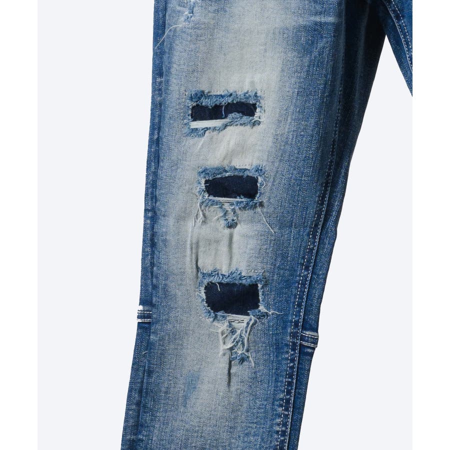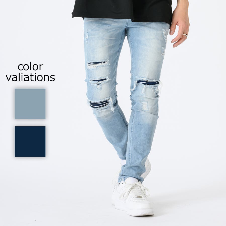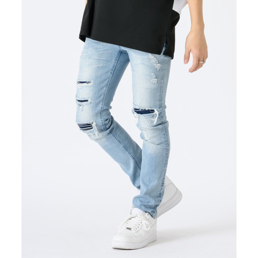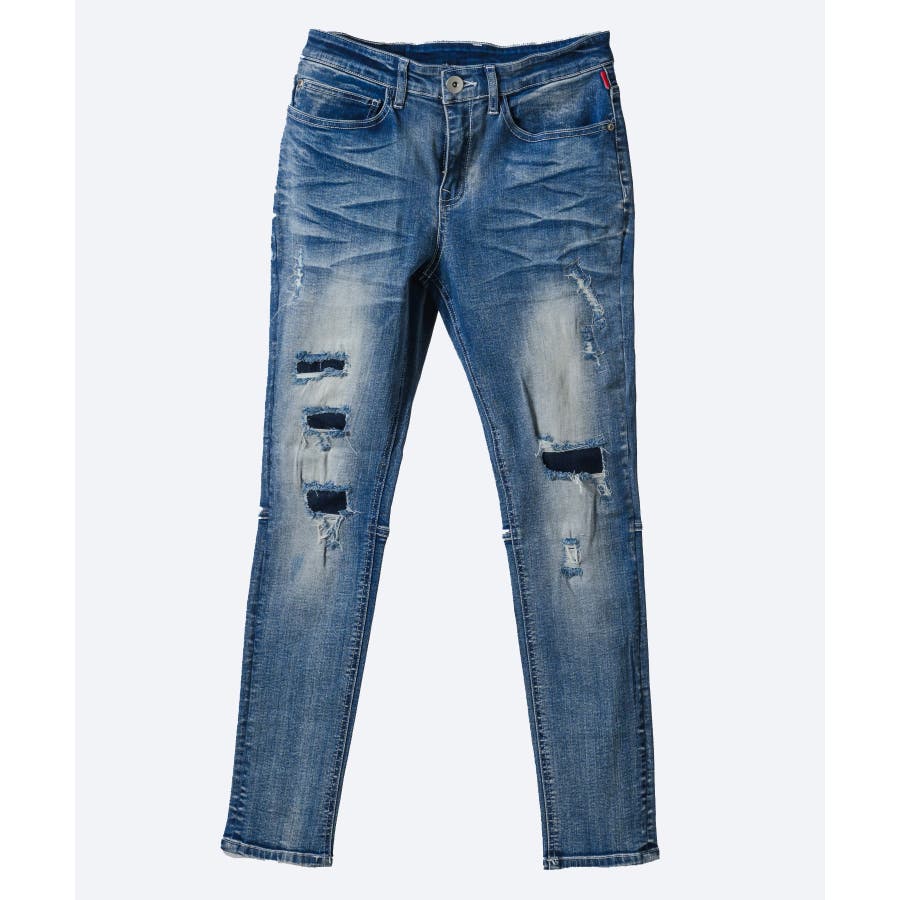 ストレッチデニムリペア立体ヒゲスキニーパンツ