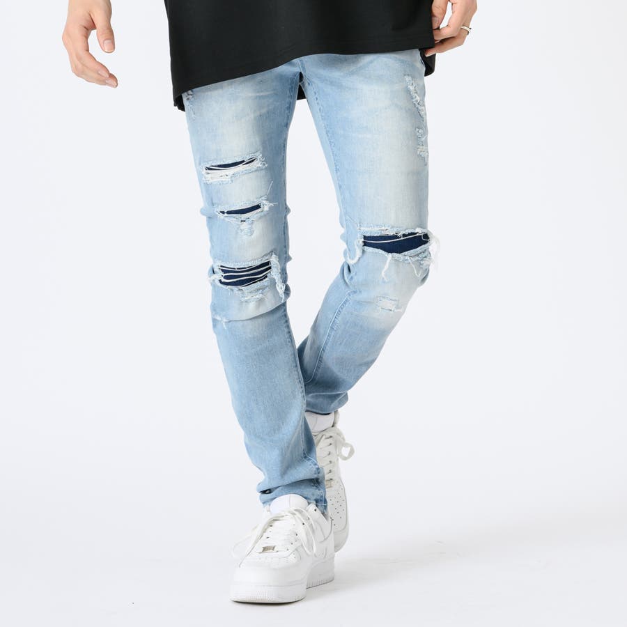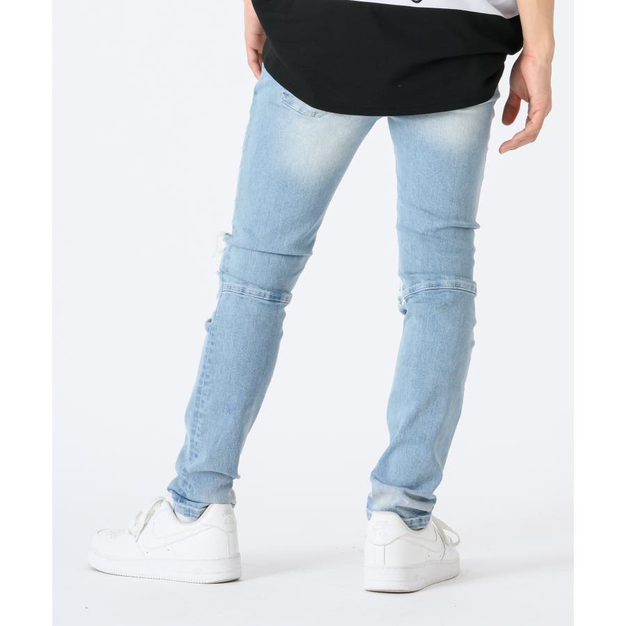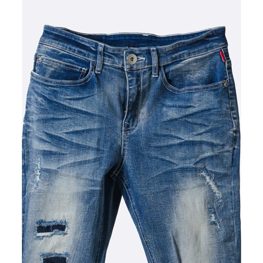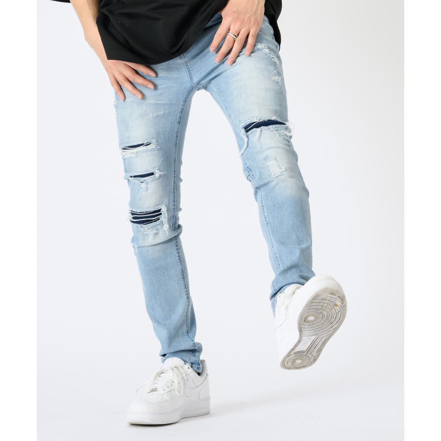 ストレッチデニムリペア立体ヒゲスキニーパンツ