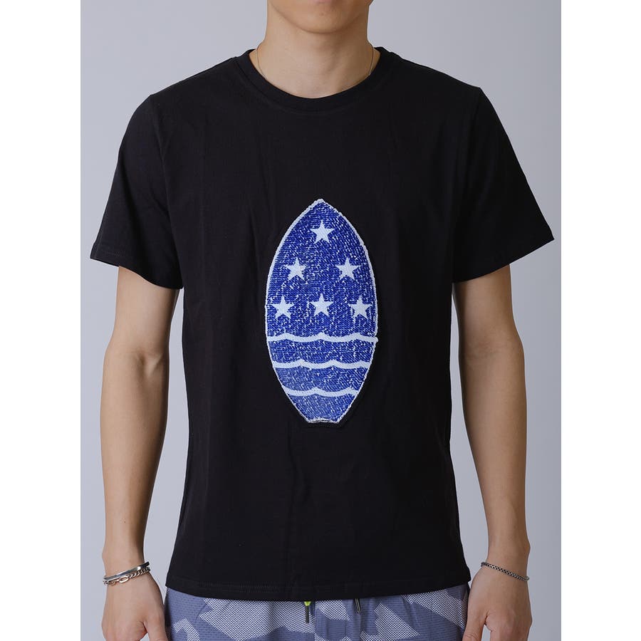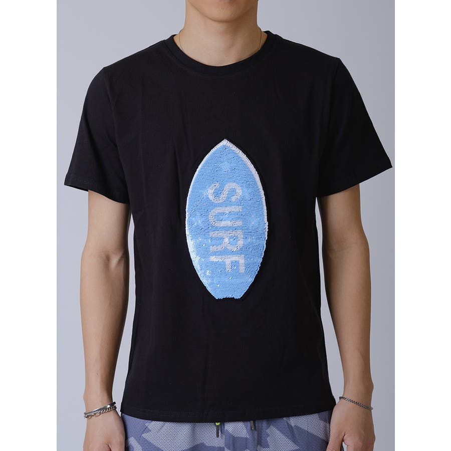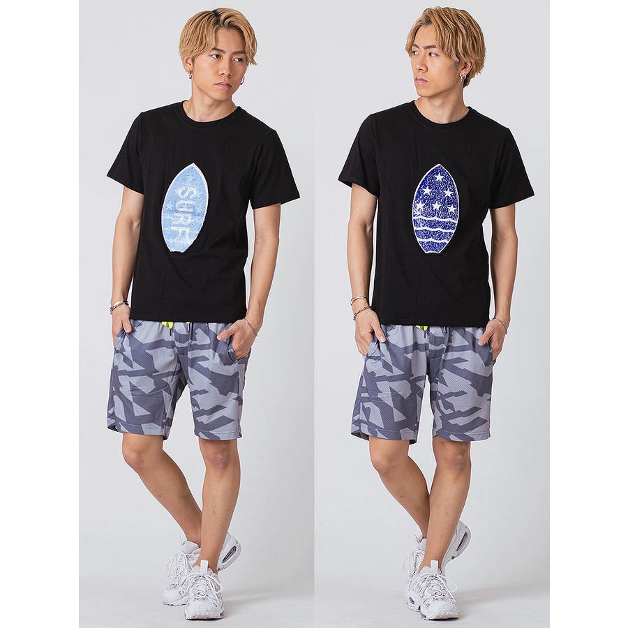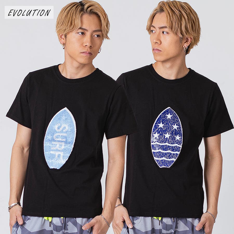 サーフボードをモチーフにしたフロントのデザインは、スパンコールを使用しており、上下になでるとスパンコールがリバーシブルに反転して2つの柄が現れる、1着で2パターン楽しめるアイテムです。