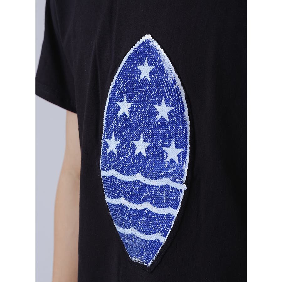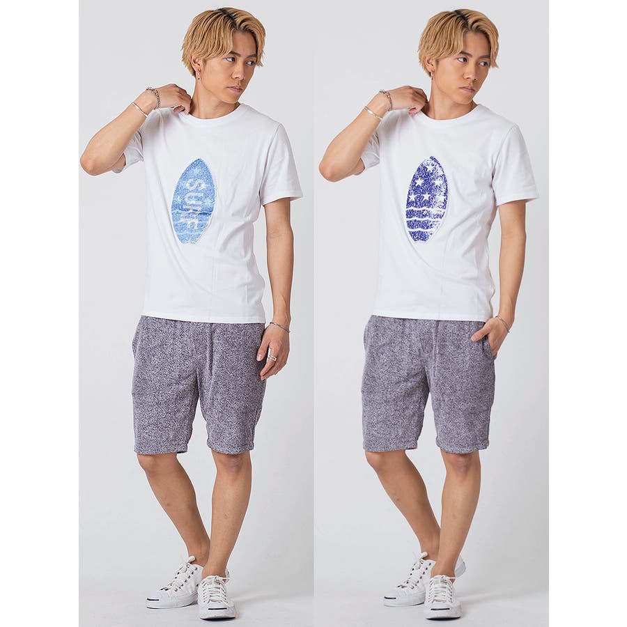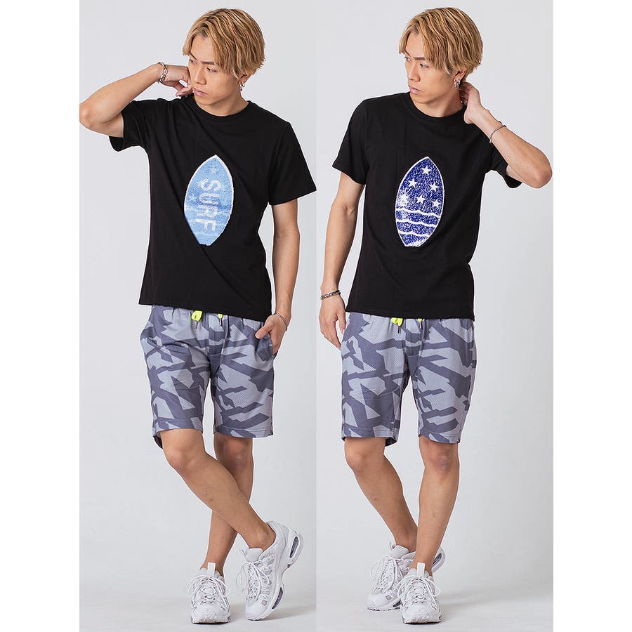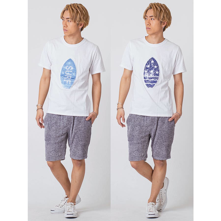サーフボードをモチーフにしたフロントのデザインは、スパンコールを使用しており、上下になでるとスパンコールがリバーシブルに反転して2つの柄が現れる、1着で2パターン楽しめるアイテムです。