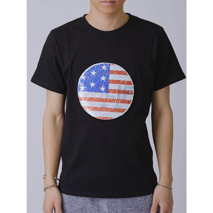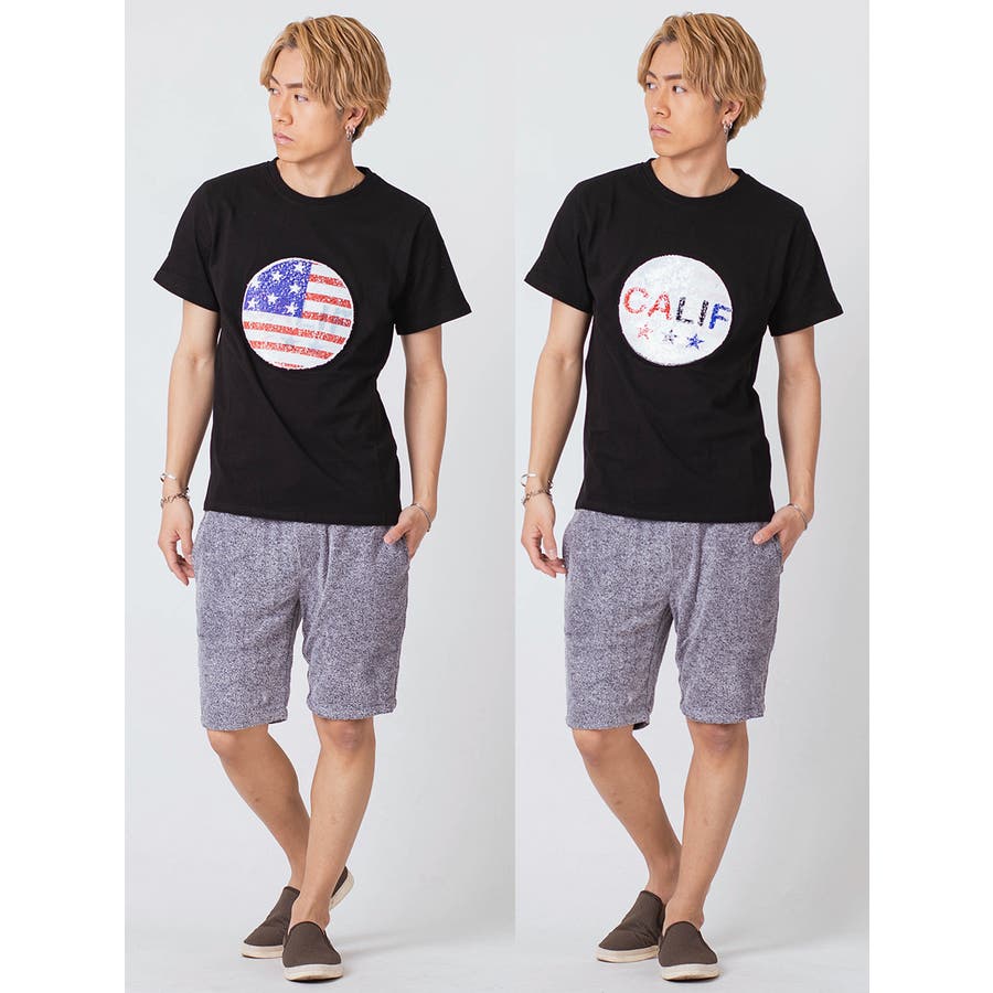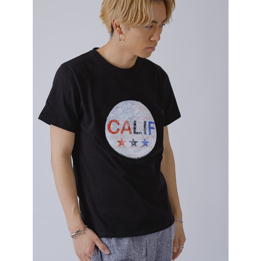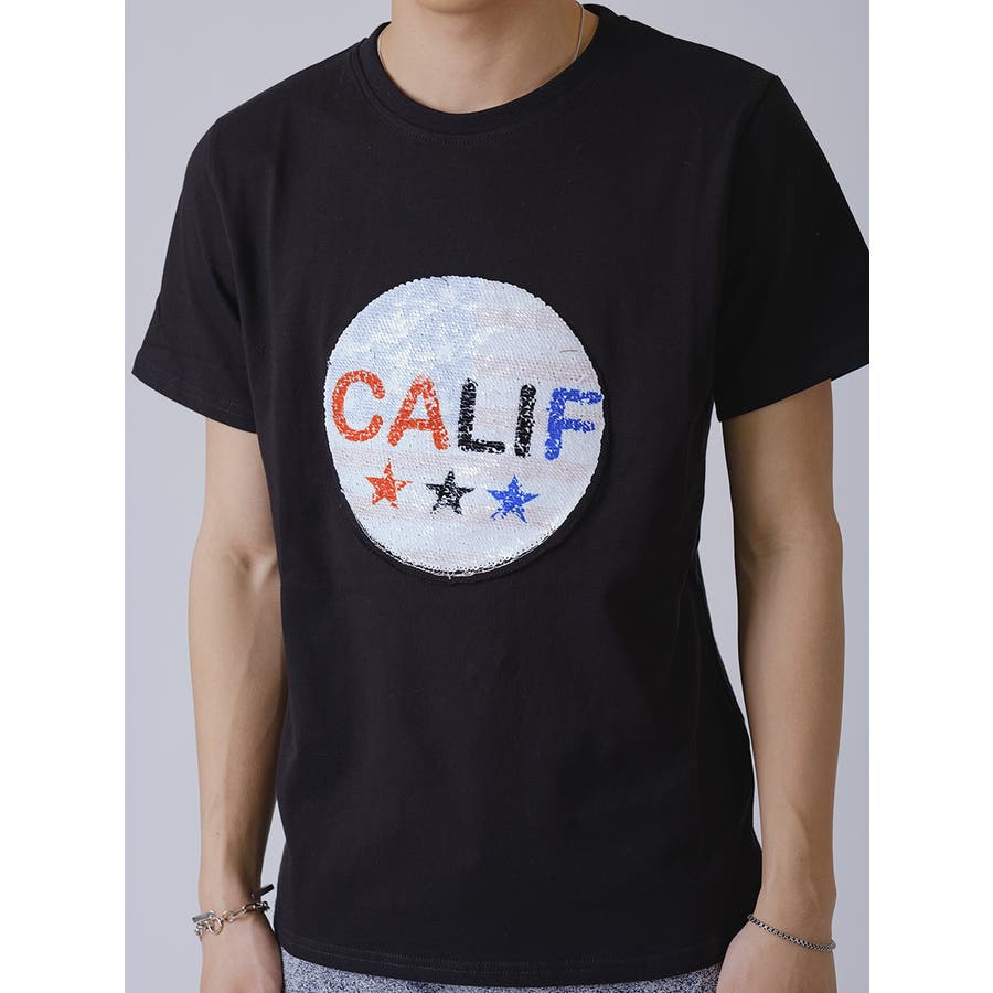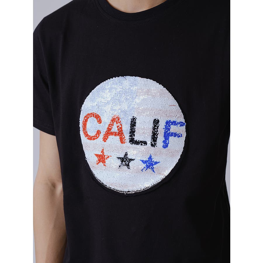 フロントのサークルは、スパンコールで表現されており、上下に撫でる事で、星条旗とCALIF.のロゴが入れ替わる2つの柄が楽しめるデザインです。