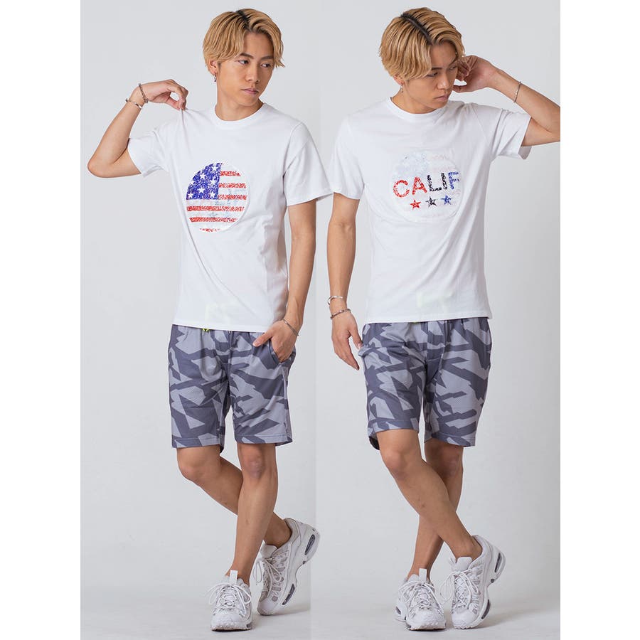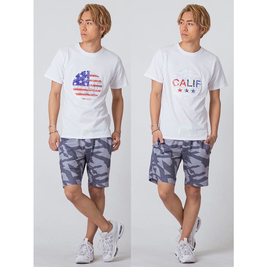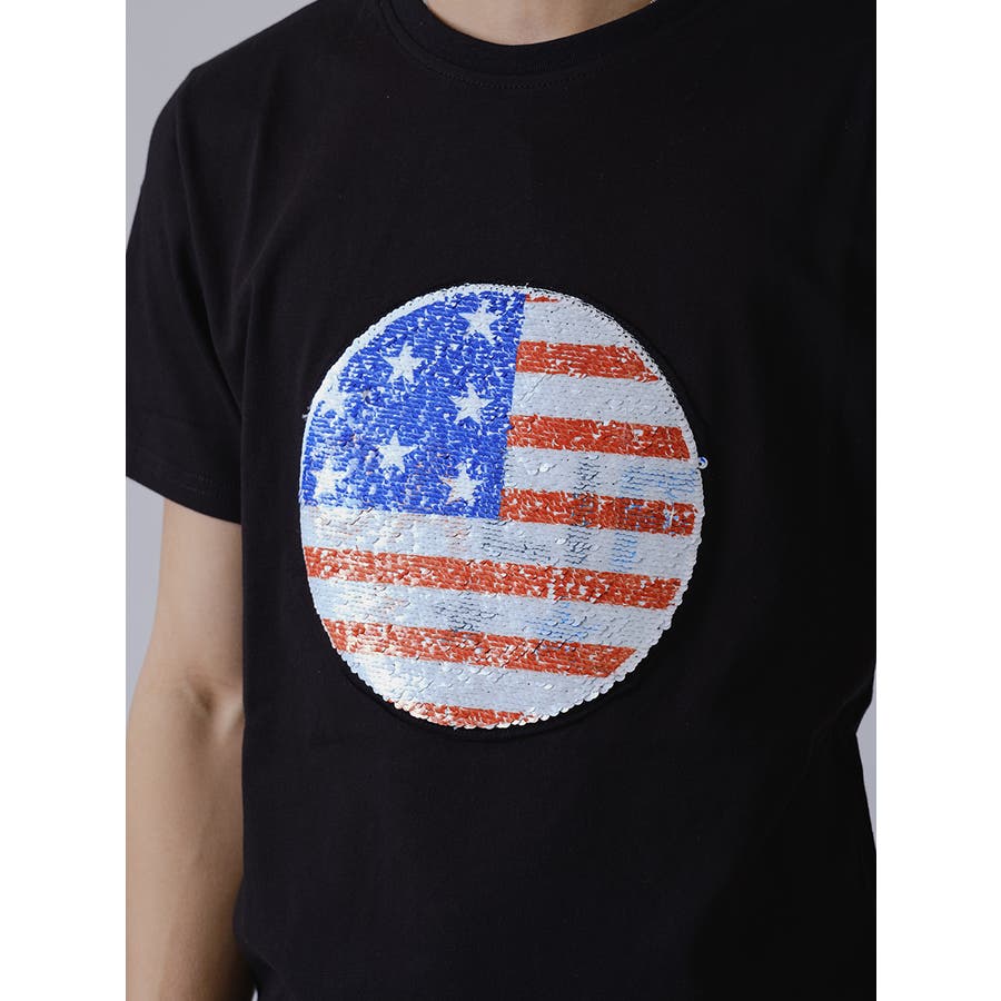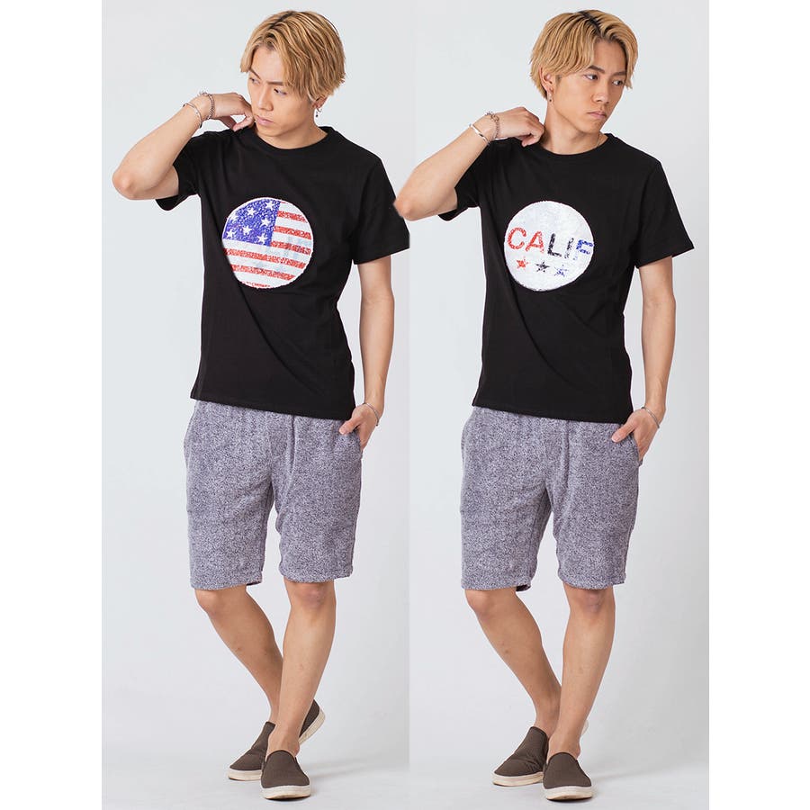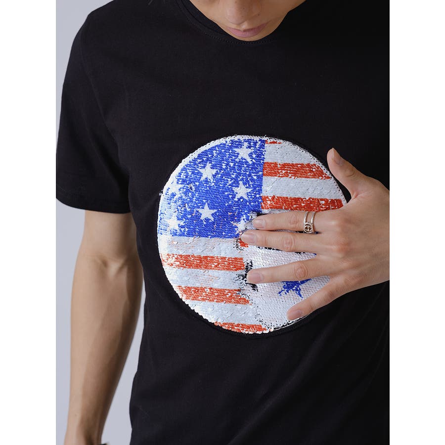 フロントのサークルは、スパンコールで表現されており、上下に撫でる事で、星条旗とCALIF.のロゴが入れ替わる2つの柄が楽しめるデザインです。