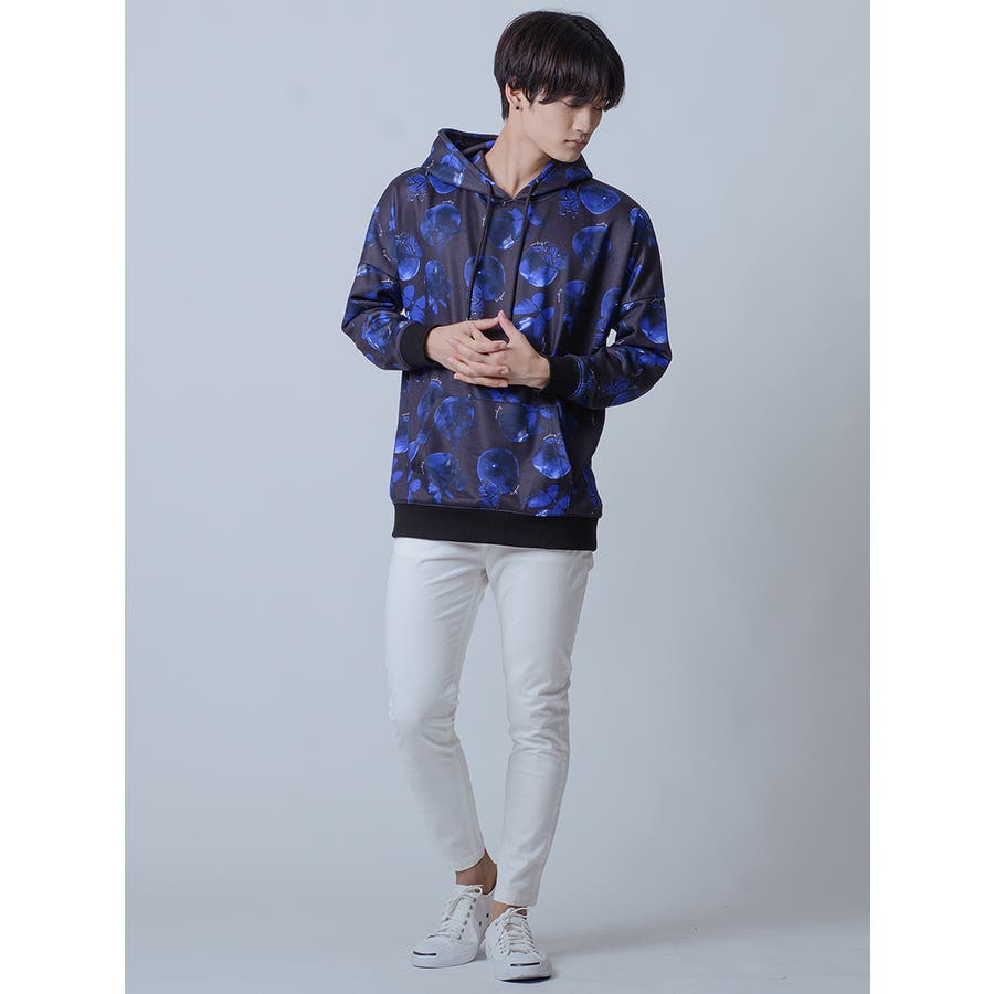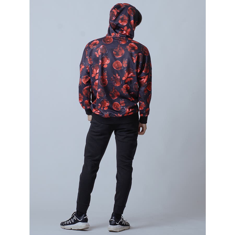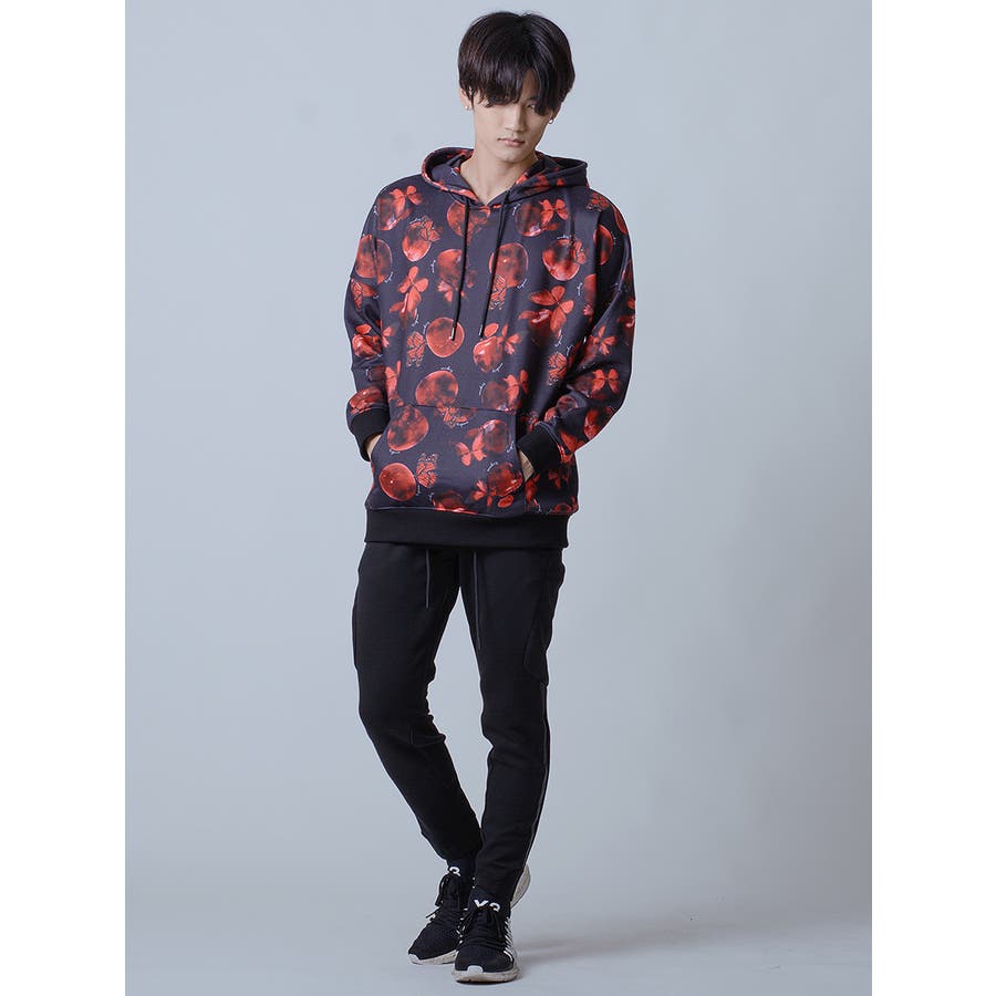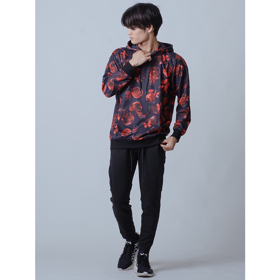 黒ベースに印象的なレッドとブルーのプリント柄は、モードなスタイリングができる存在感のあるパーカーです。