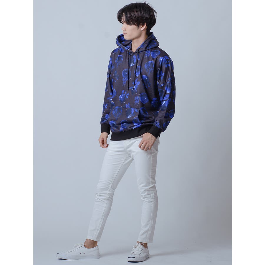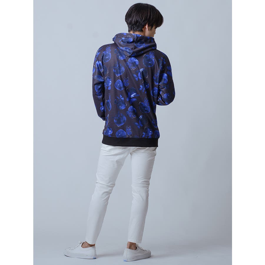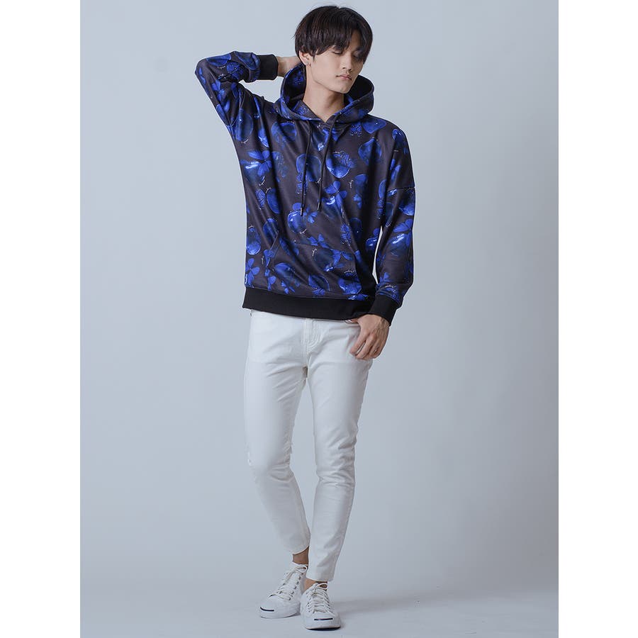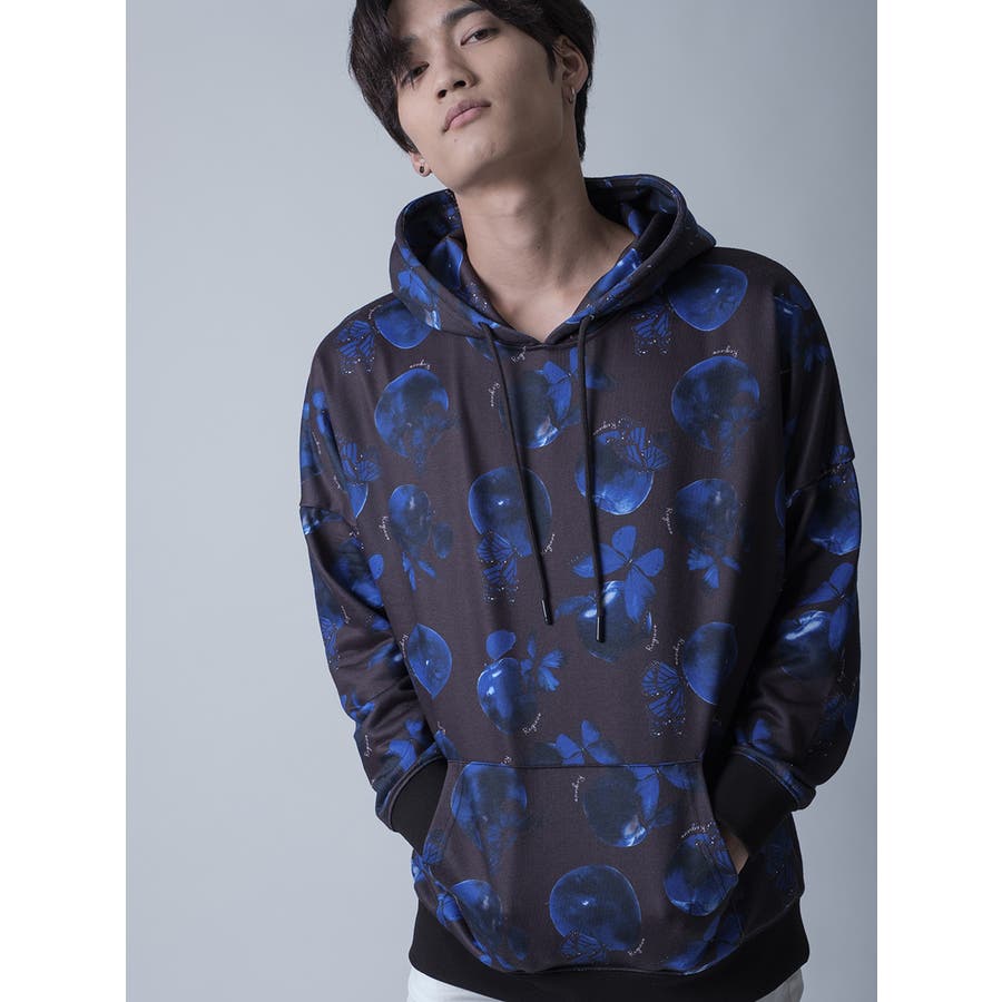 黒ベースに印象的なレッドとブルーのプリント柄は、モードなスタイリングができる存在感のあるパーカーです。