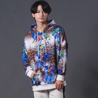 ボタニカル柄とレオパード柄をMIXさせた総柄にREGIEVOのロゴを胸と袖にもプリントしています。