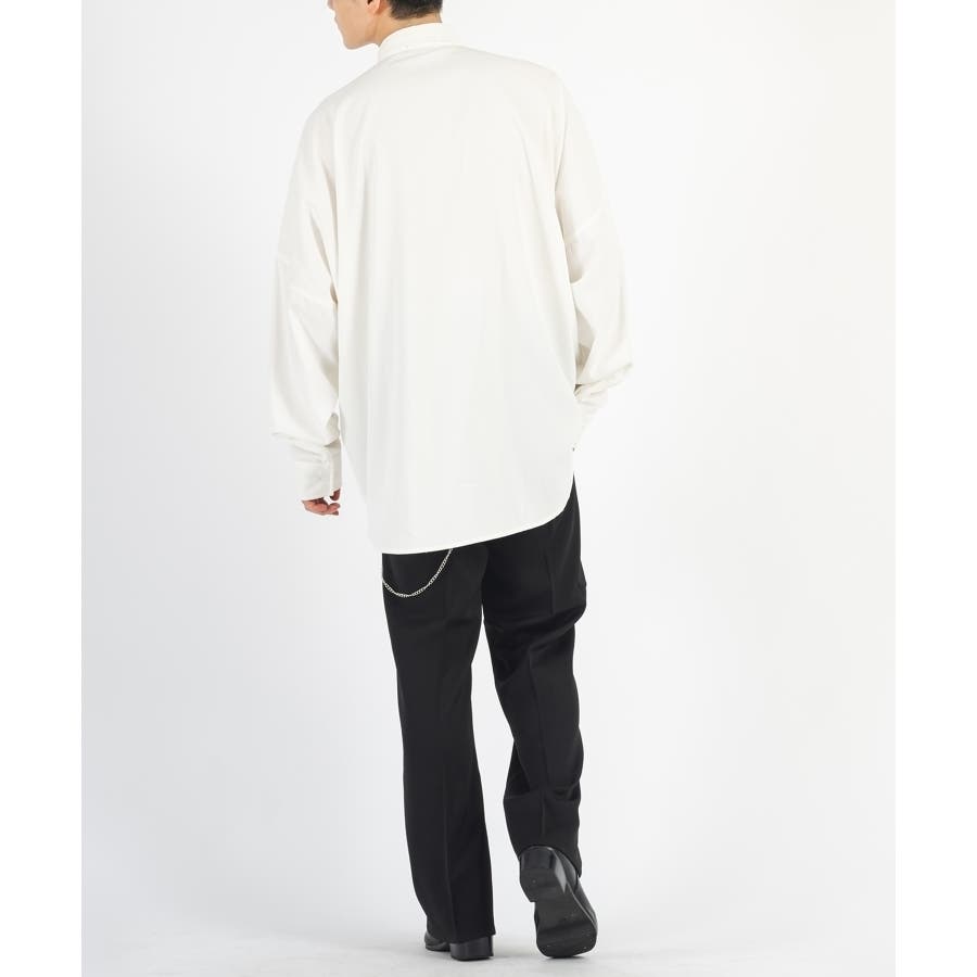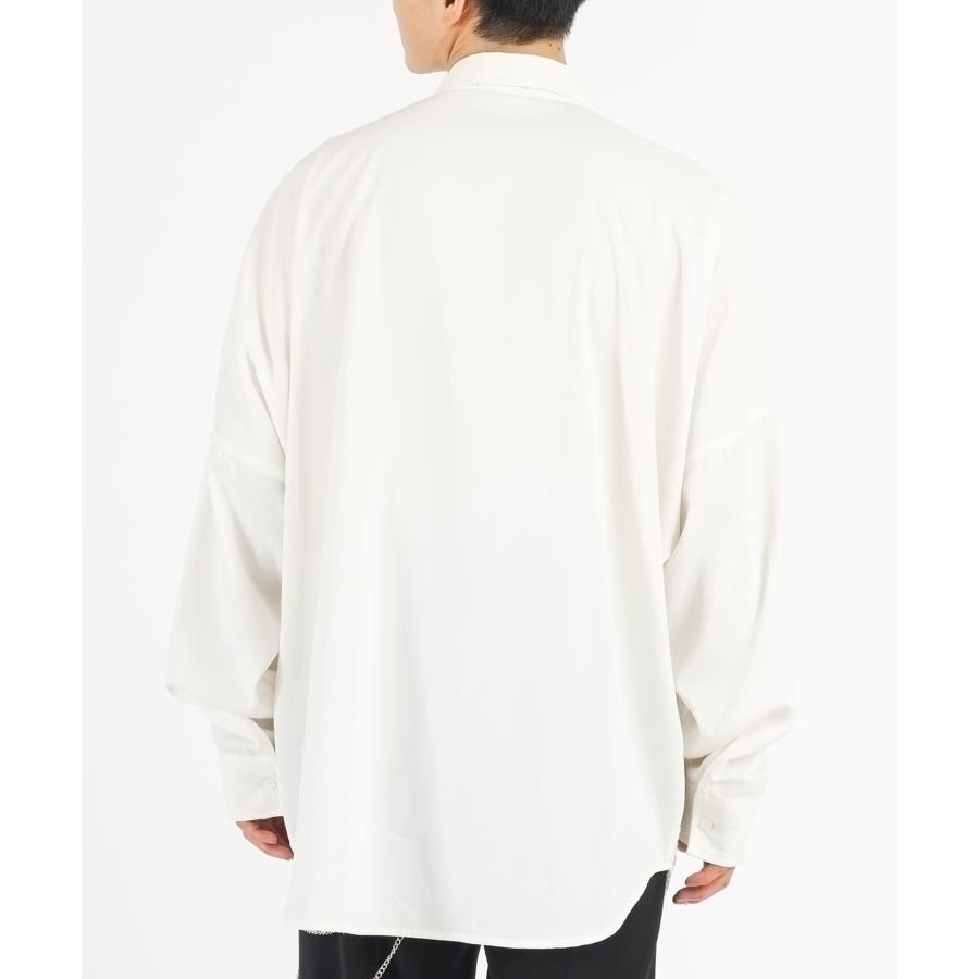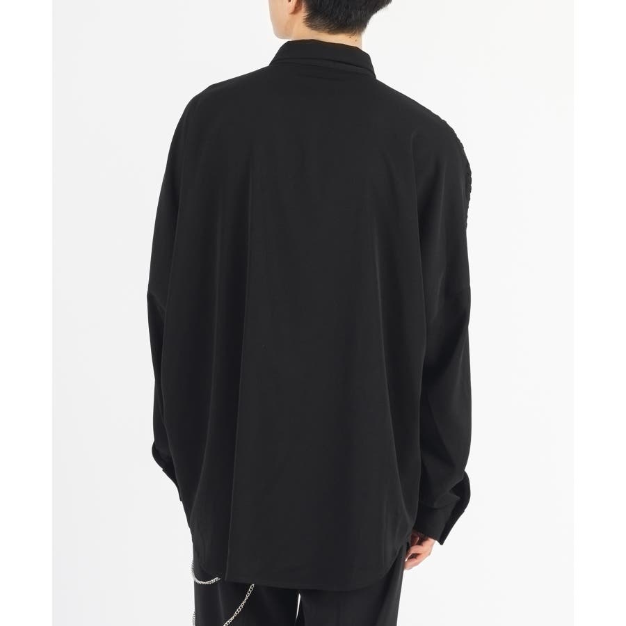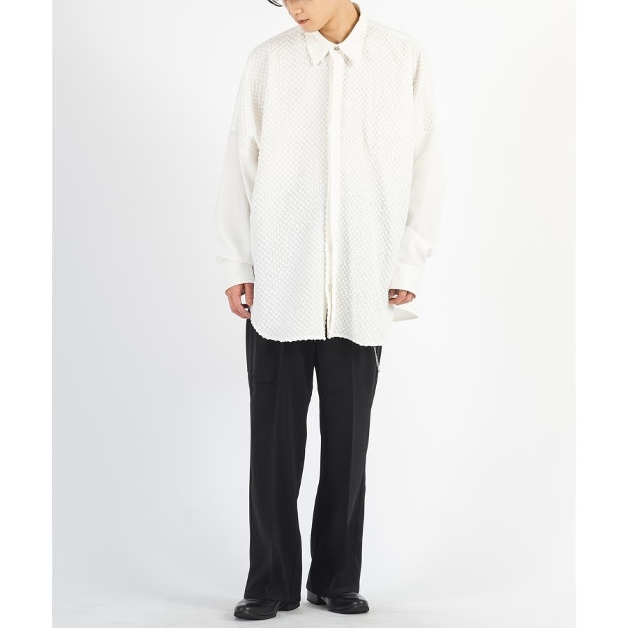 胸ポケットを省き、フロント釦を隠すフライフロント仕様のミニマルなデザインです。ゆとりのあるオーバーサイズなシルエットです。