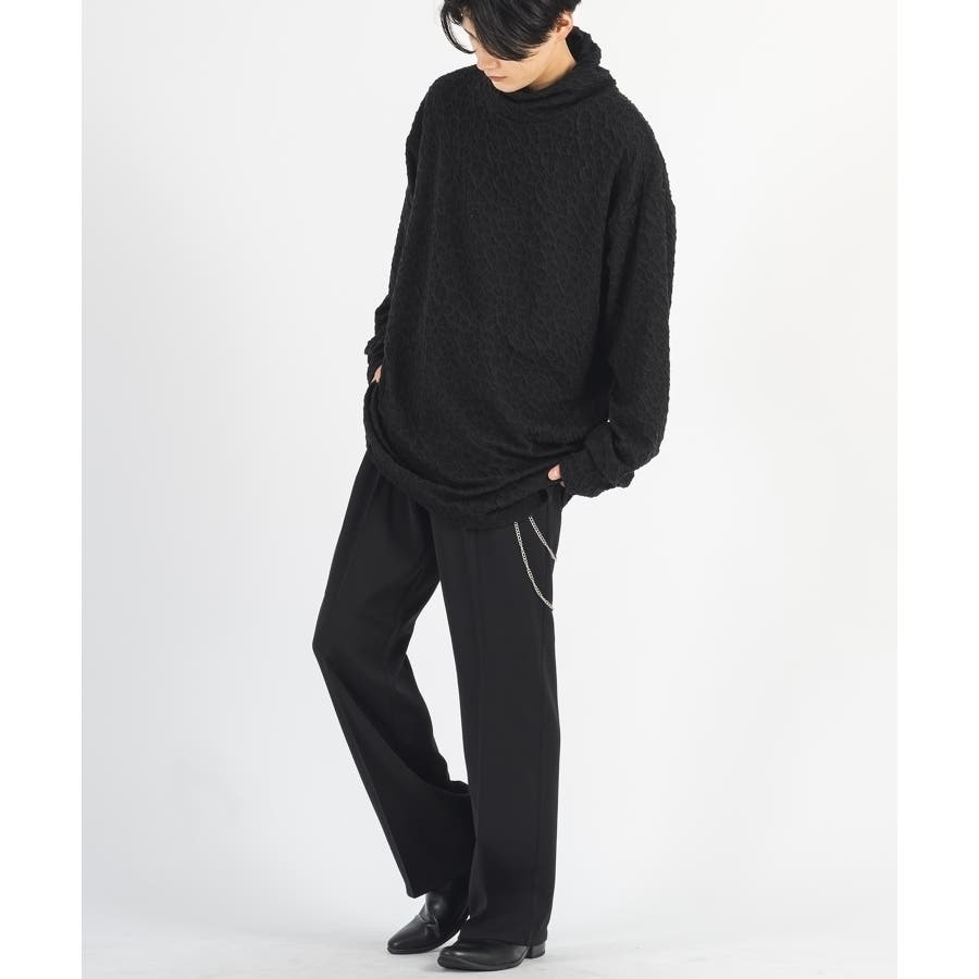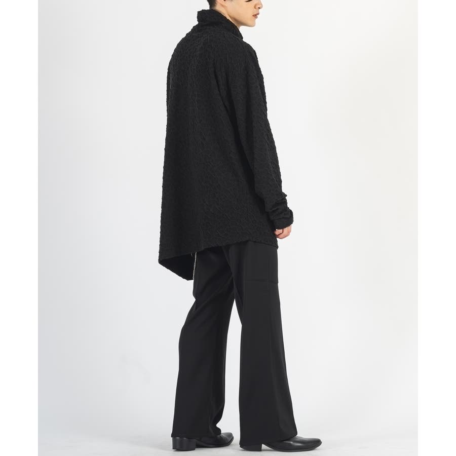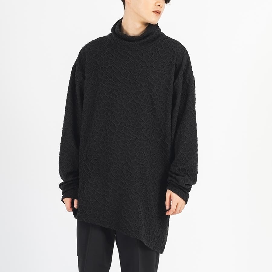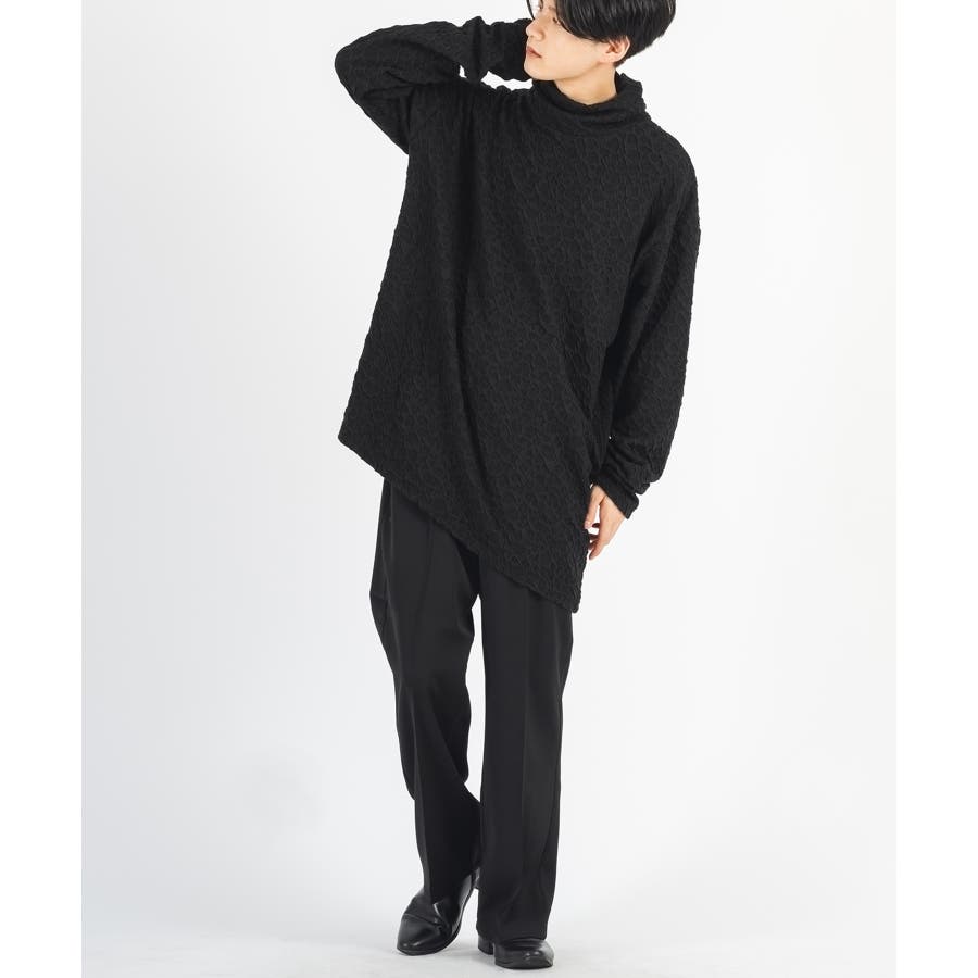 緩めに折り返すオフタートルネックがエレガントで柔らかなイメージを表現でき、長めの着丈で左右の長さが違うアシンメトリーなデザインが着こなしを一段とクールにします。