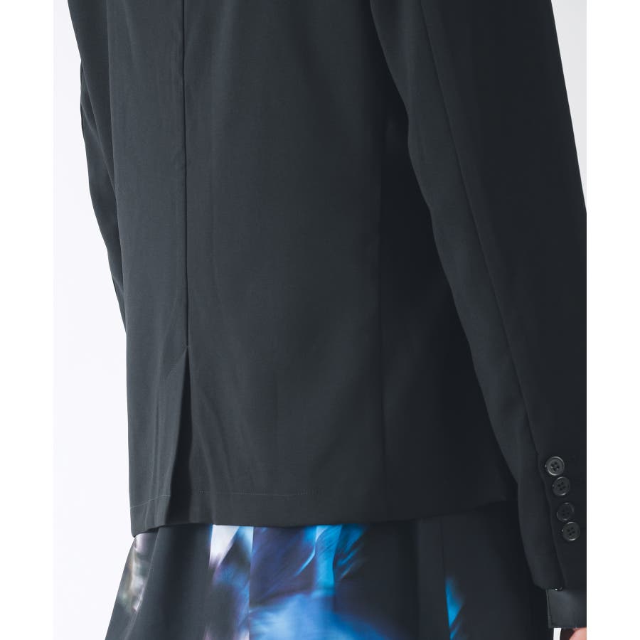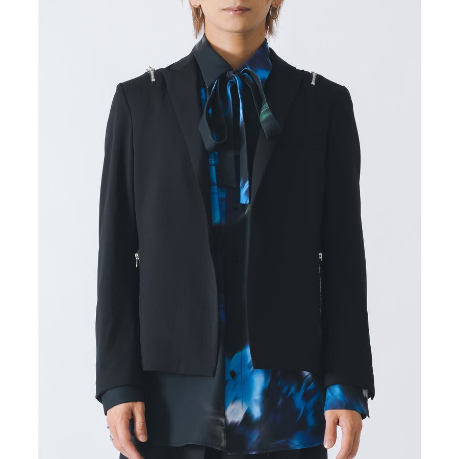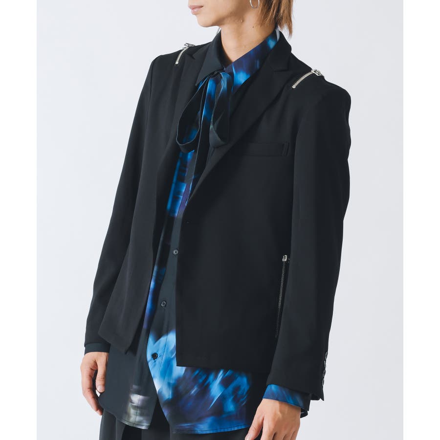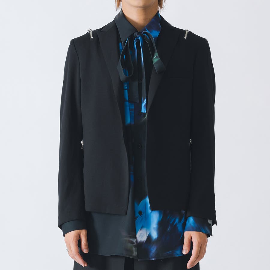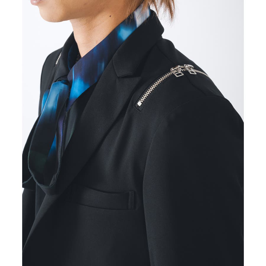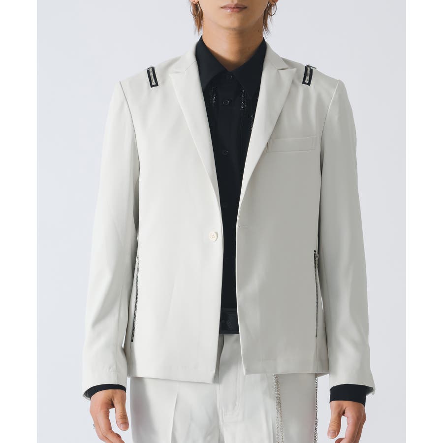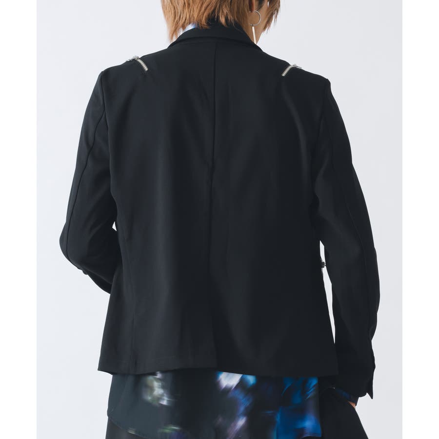 フロントは1つボタンで、裾がスクエアなラインでやや着丈が短めのショートジャケットです。襟も細めのナローなピークラペルが特徴です。腰ポケットはサイドに配置したミニマルなデザインでありながら、肩に配置したファスナーがアクセントとして特徴的です。