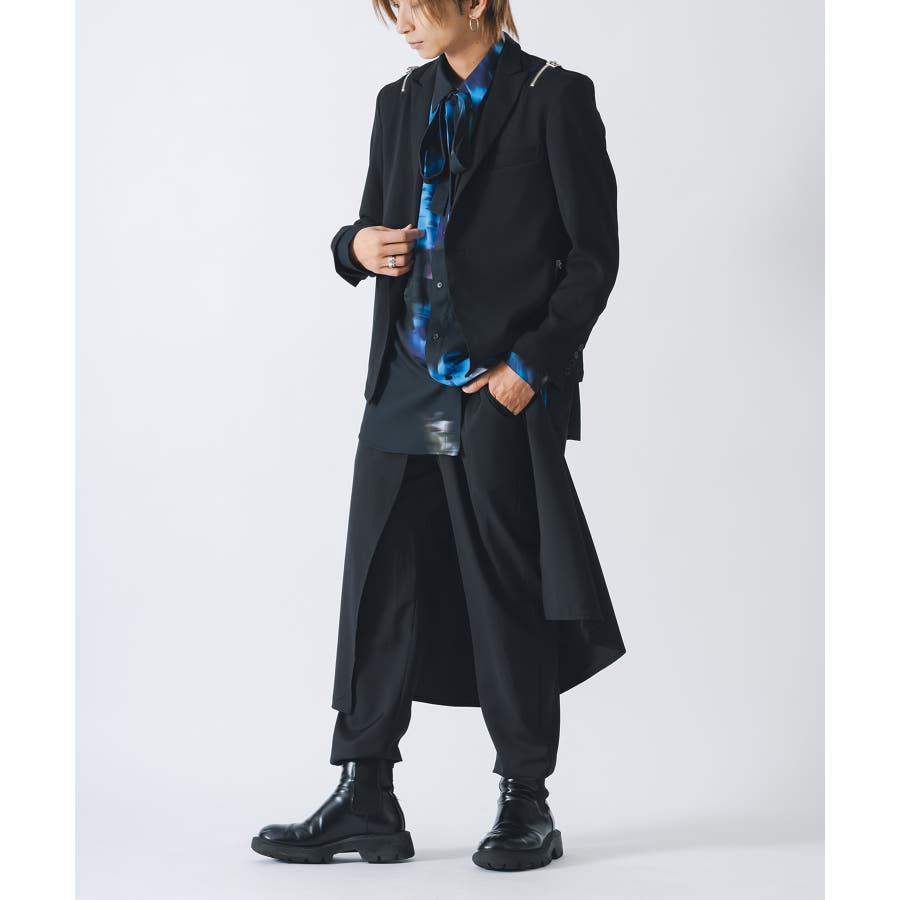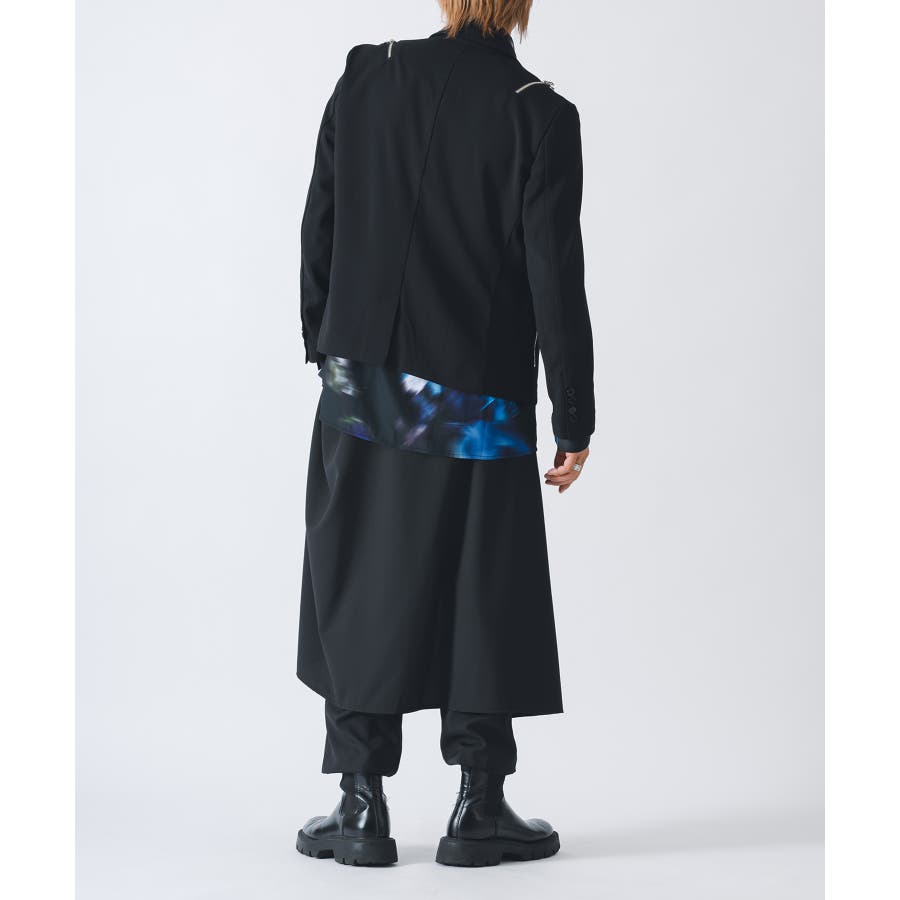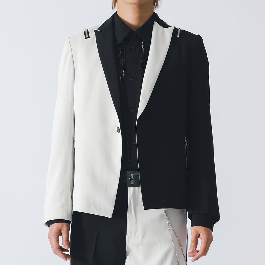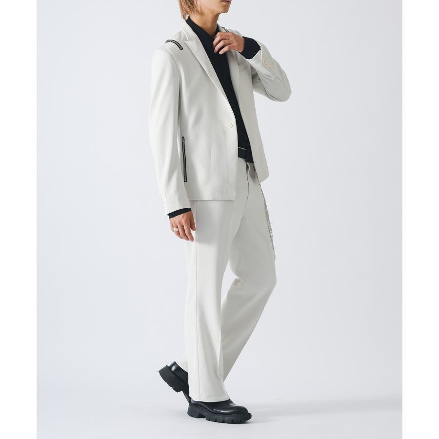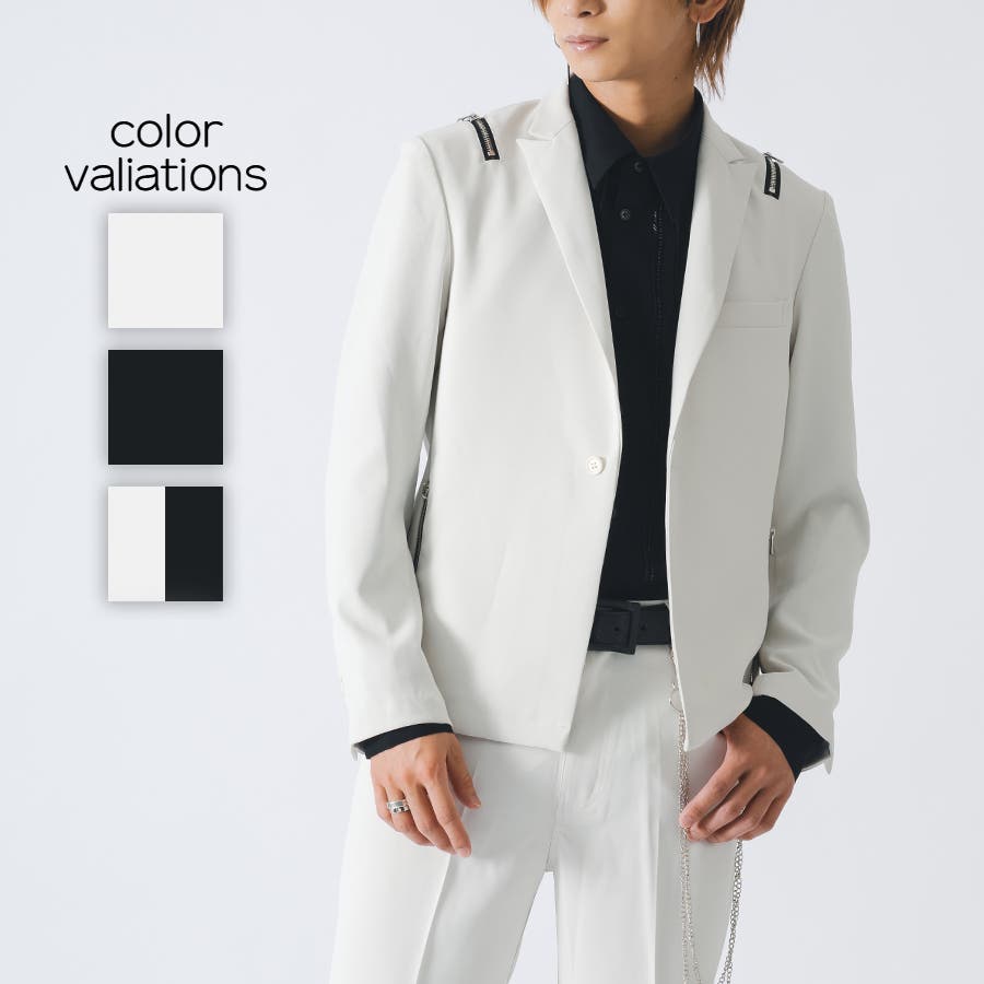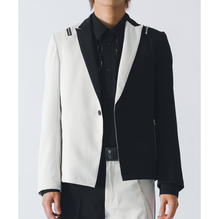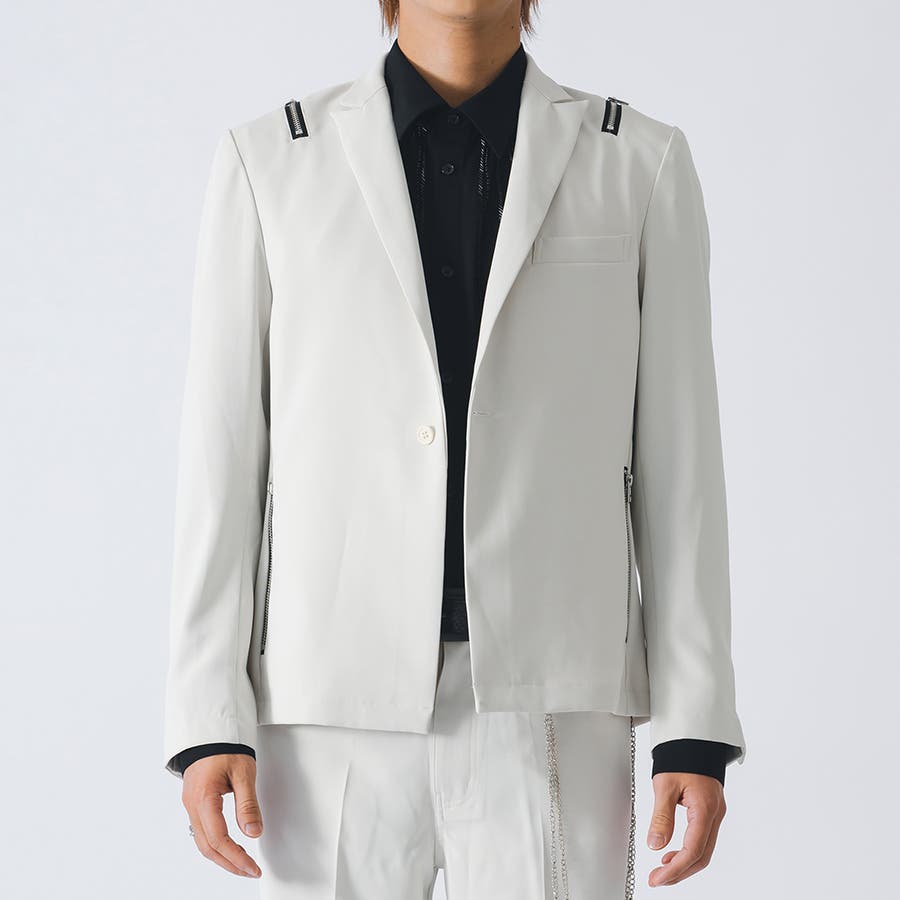 フロントは1つボタンで、裾がスクエアなラインでやや着丈が短めのショートジャケットです。襟も細めのナローなピークラペルが特徴です。腰ポケットはサイドに配置したミニマルなデザインでありながら、肩に配置したファスナーがアクセントとして特徴的です。