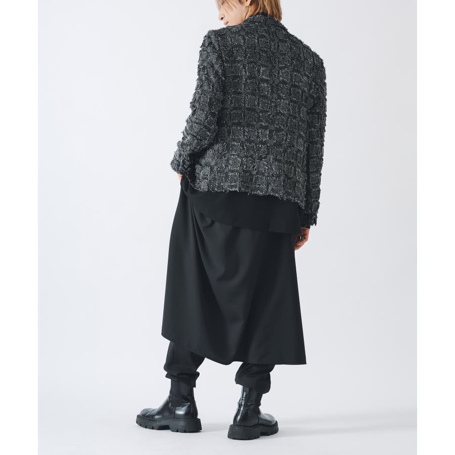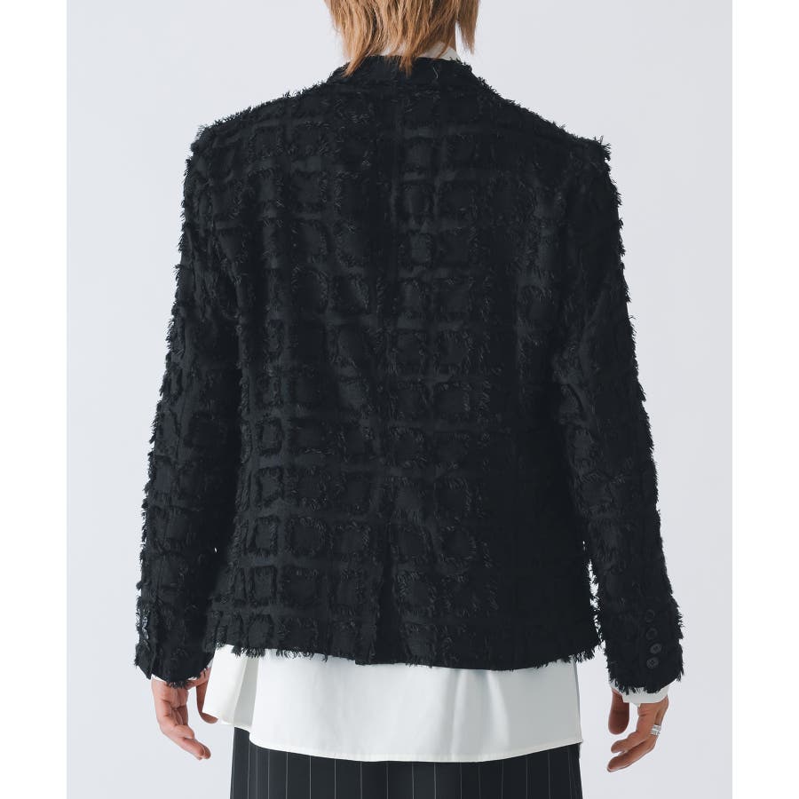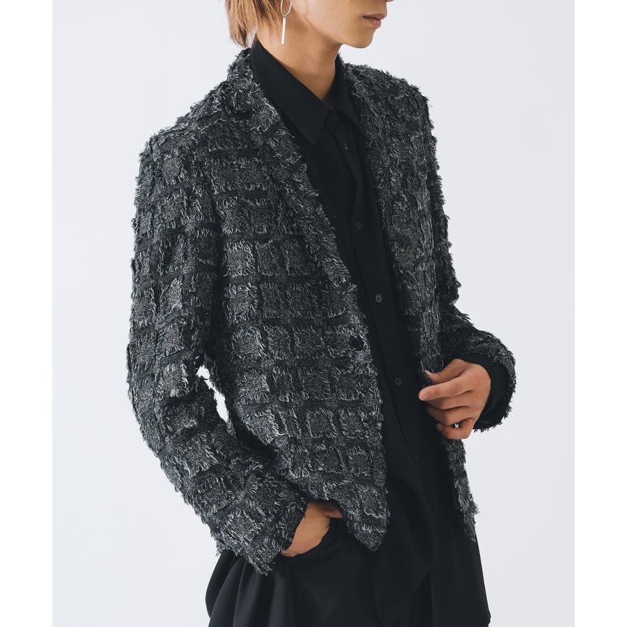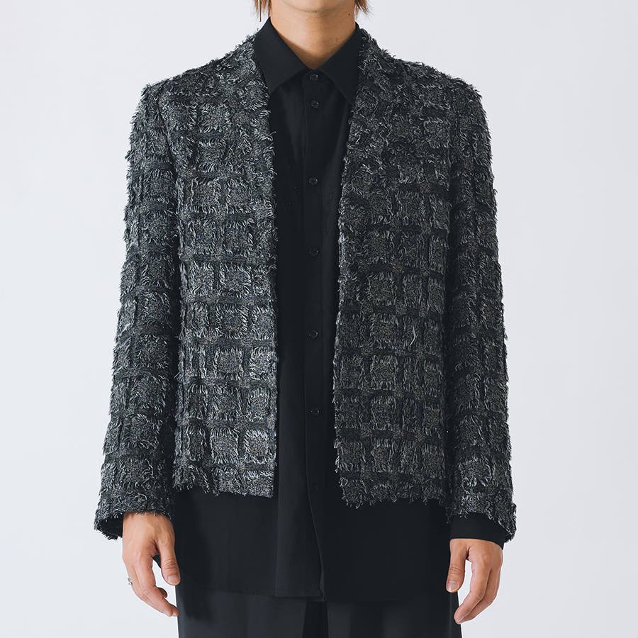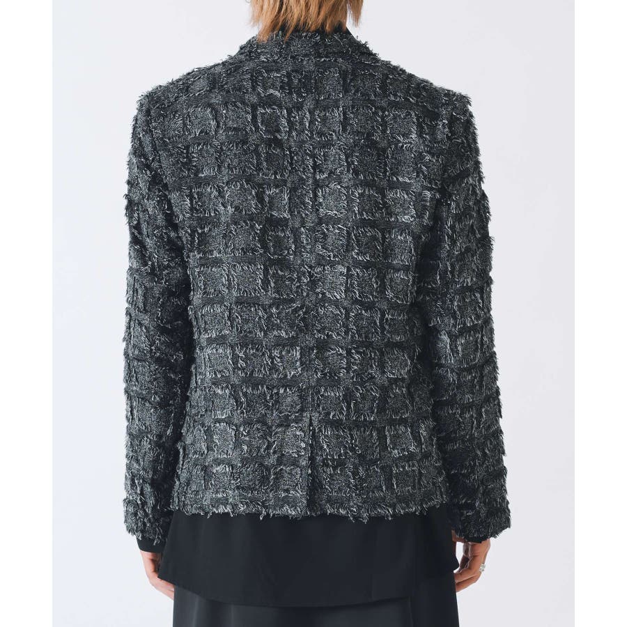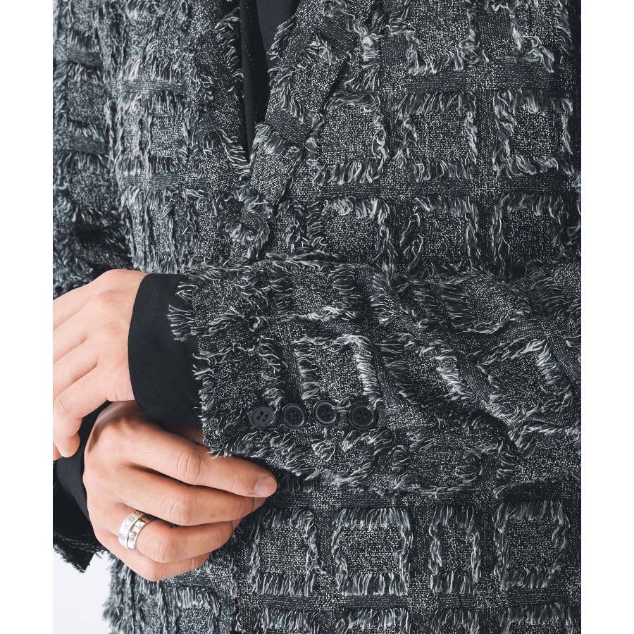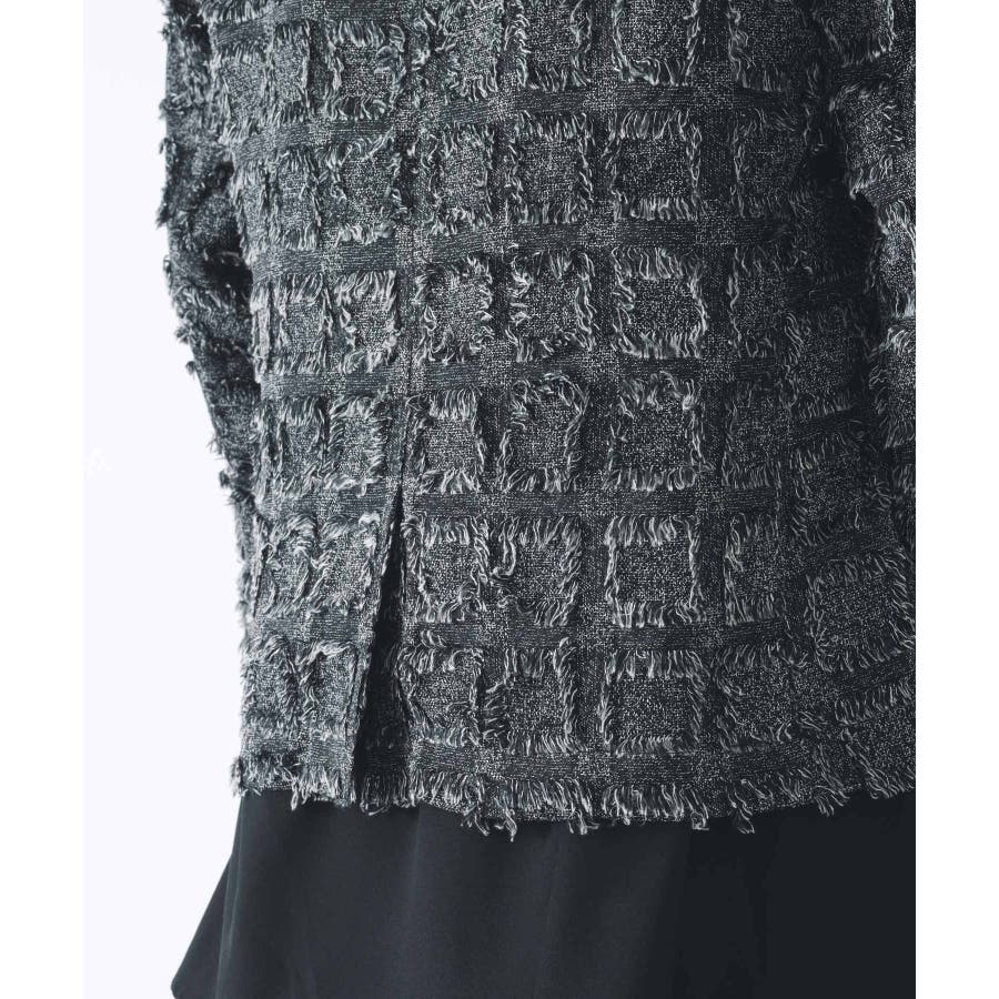 フリンジのように表面に浮き出した柄はウィンドペーンタイプのチェック柄になっており、その素材感が特徴です。