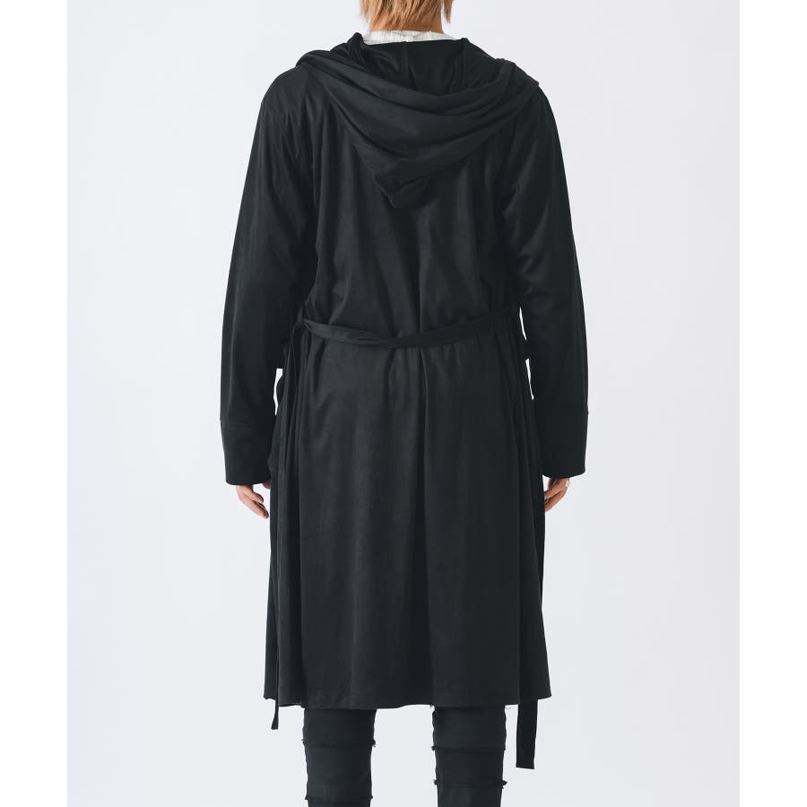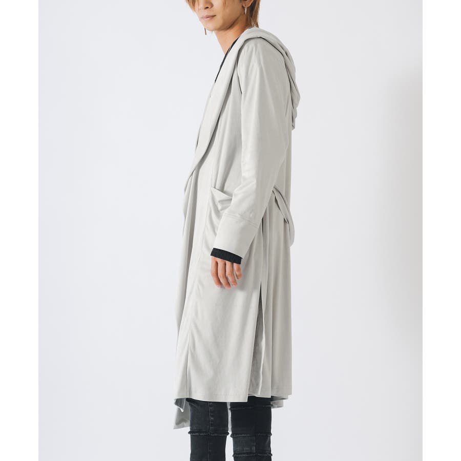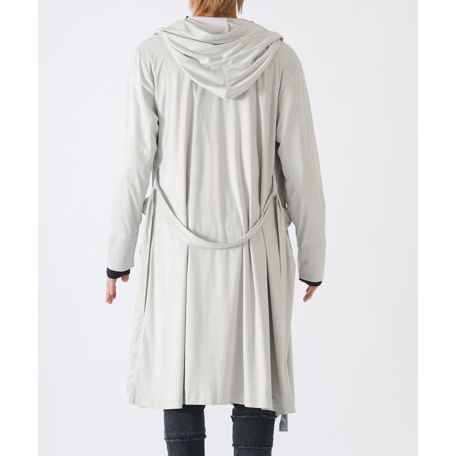 大きなフードがフロントまで一体化したベルト付きのラップコートです。