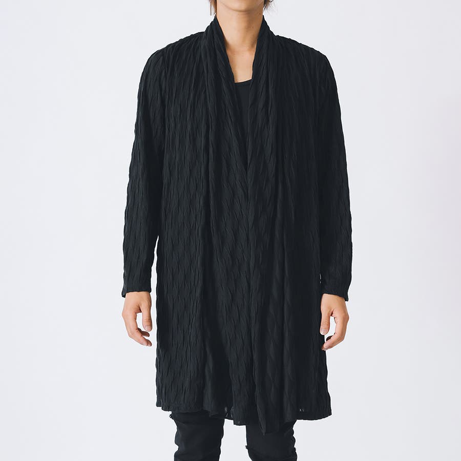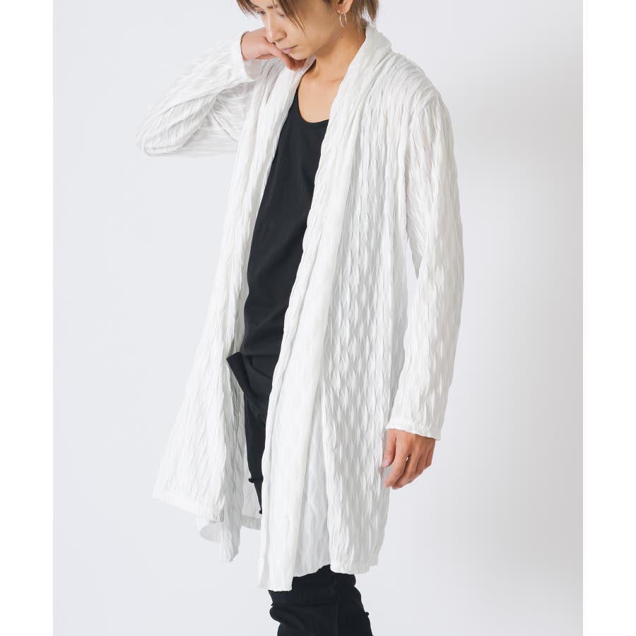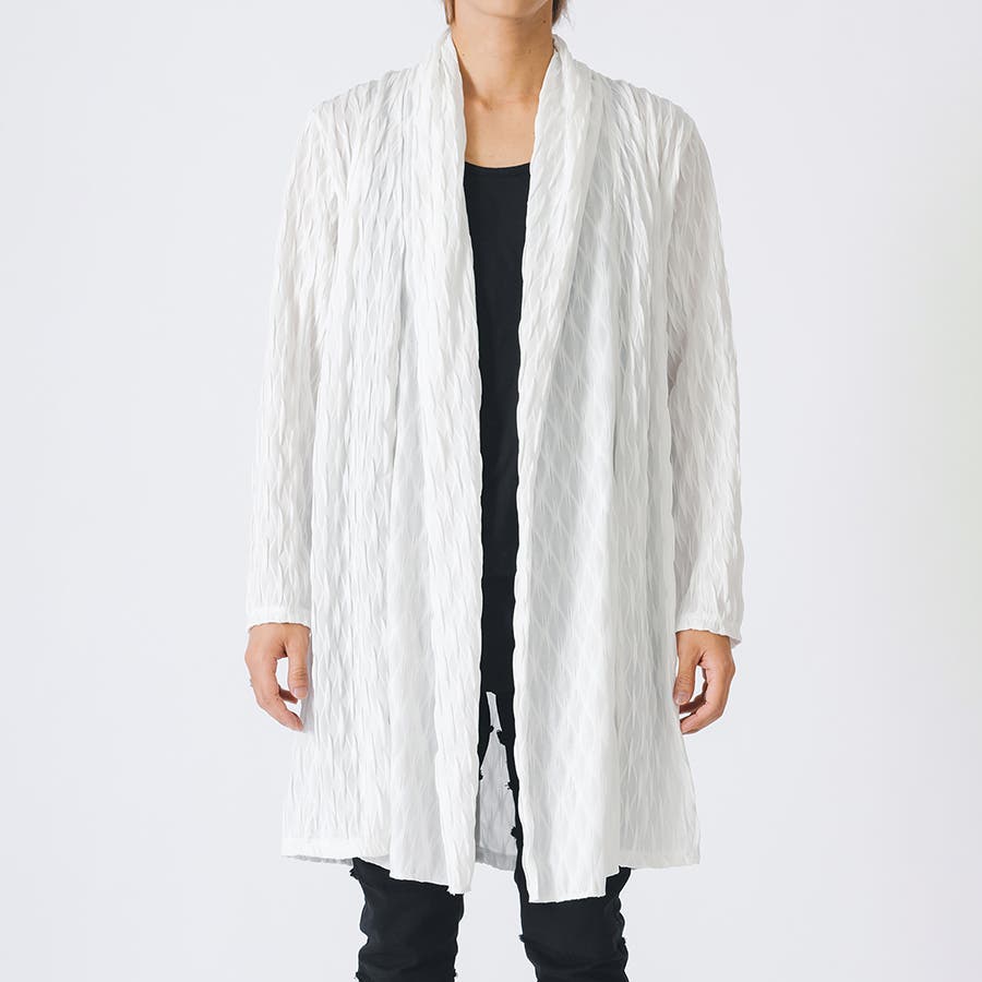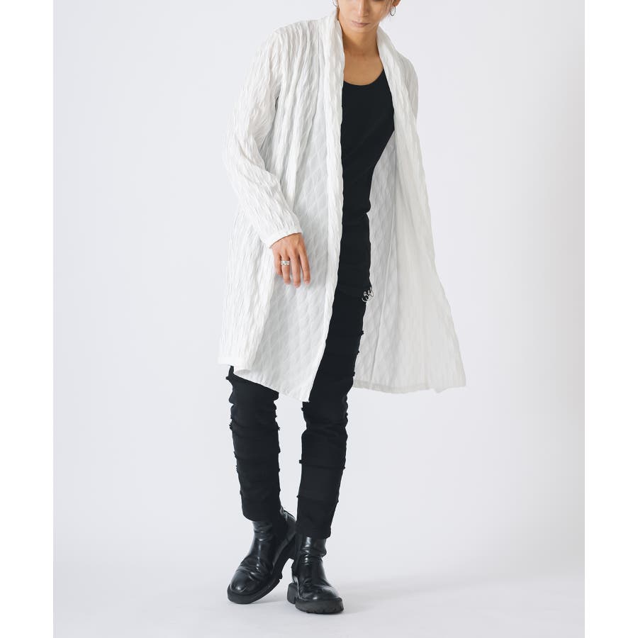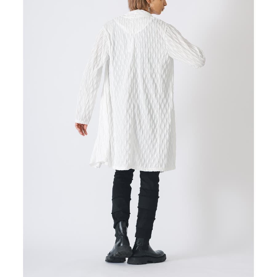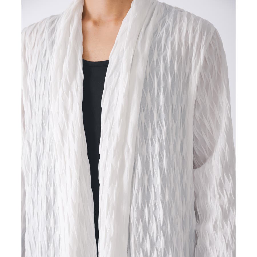 釦のない羽織るだけのショールの様なスタイルで、立体的なウエーブ状の織り柄がモードな雰囲気を感じさせます。
