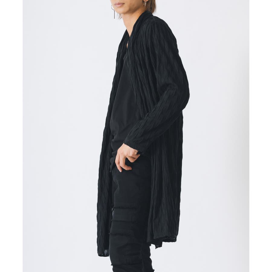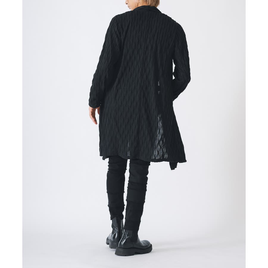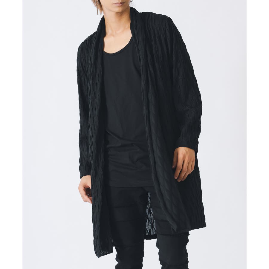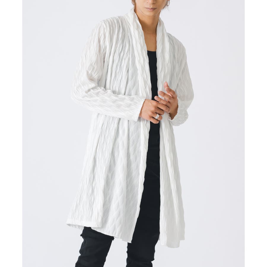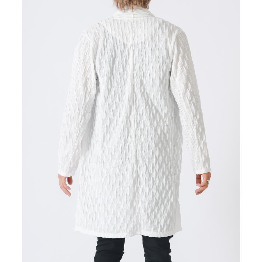 釦のない羽織るだけのショールの様なスタイルで、立体的なウエーブ状の織り柄がモードな雰囲気を感じさせます。