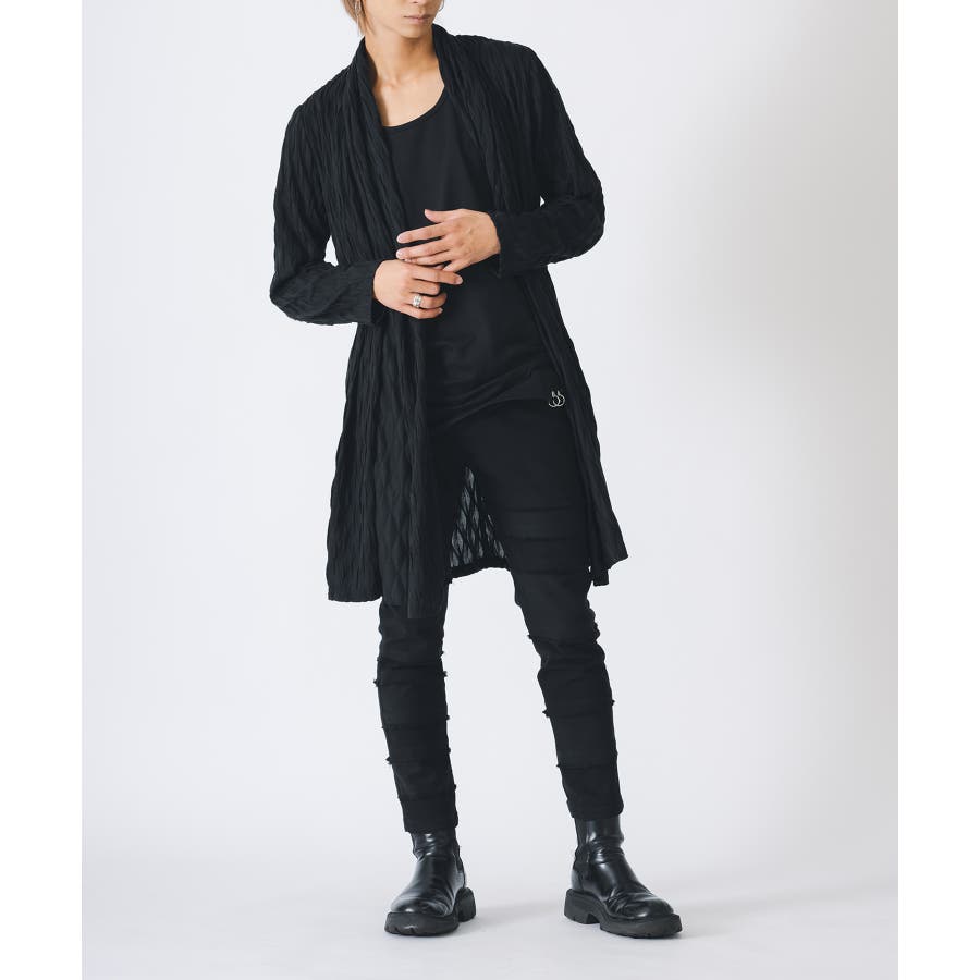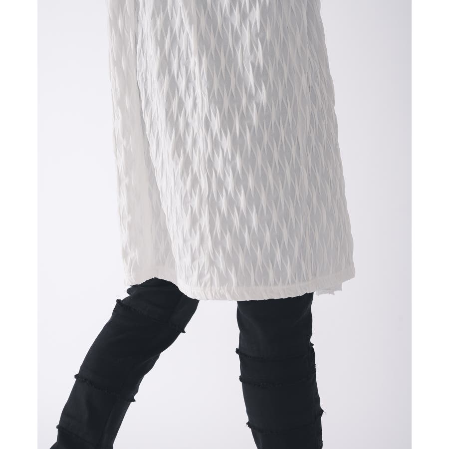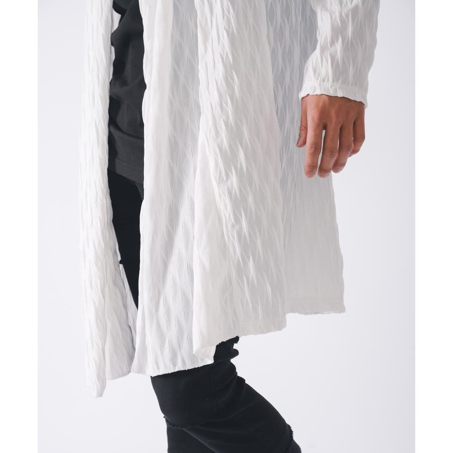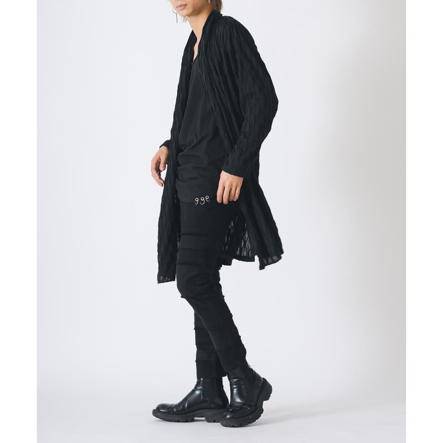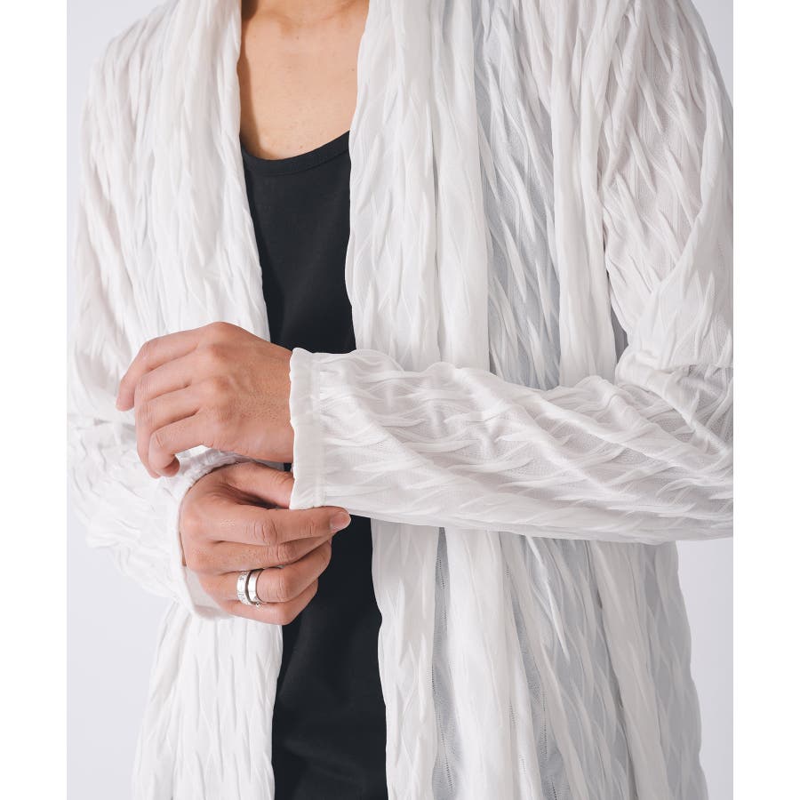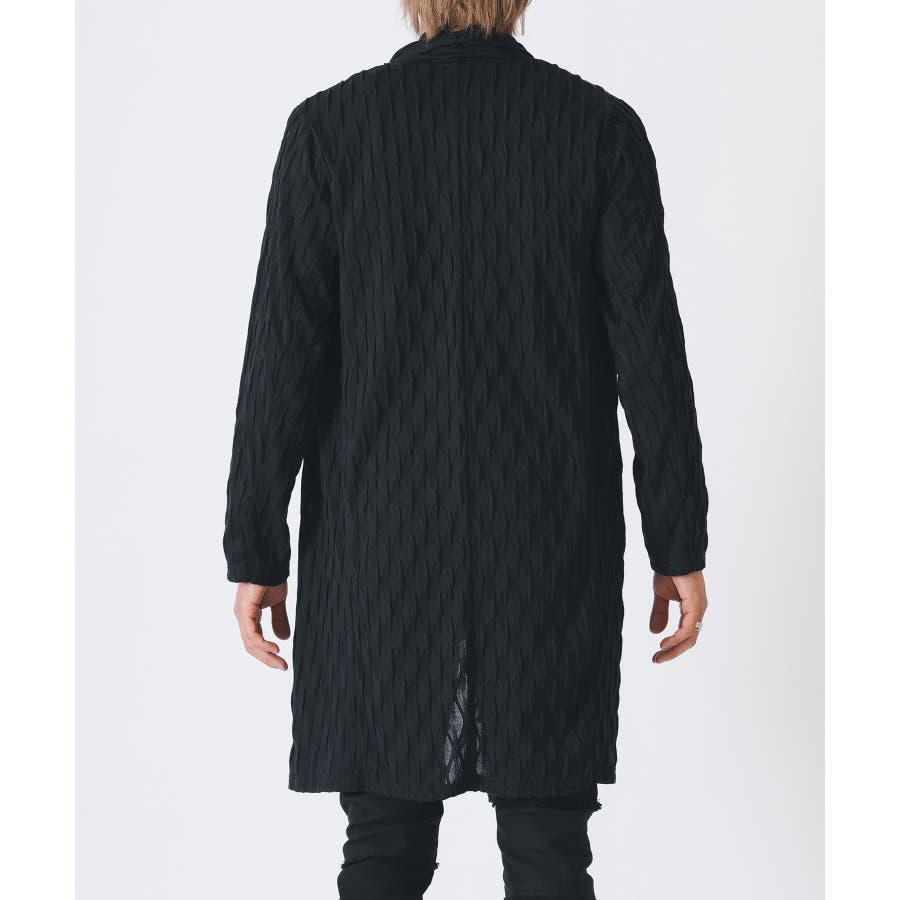 釦のない羽織るだけのショールの様なスタイルで、立体的なウエーブ状の織り柄がモードな雰囲気を感じさせます。