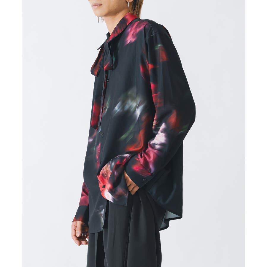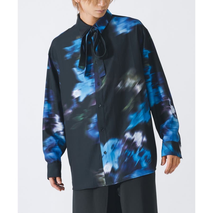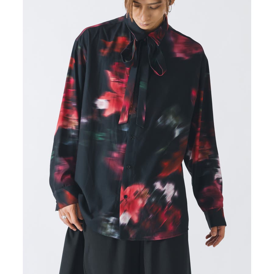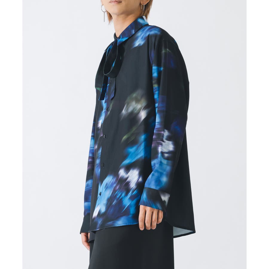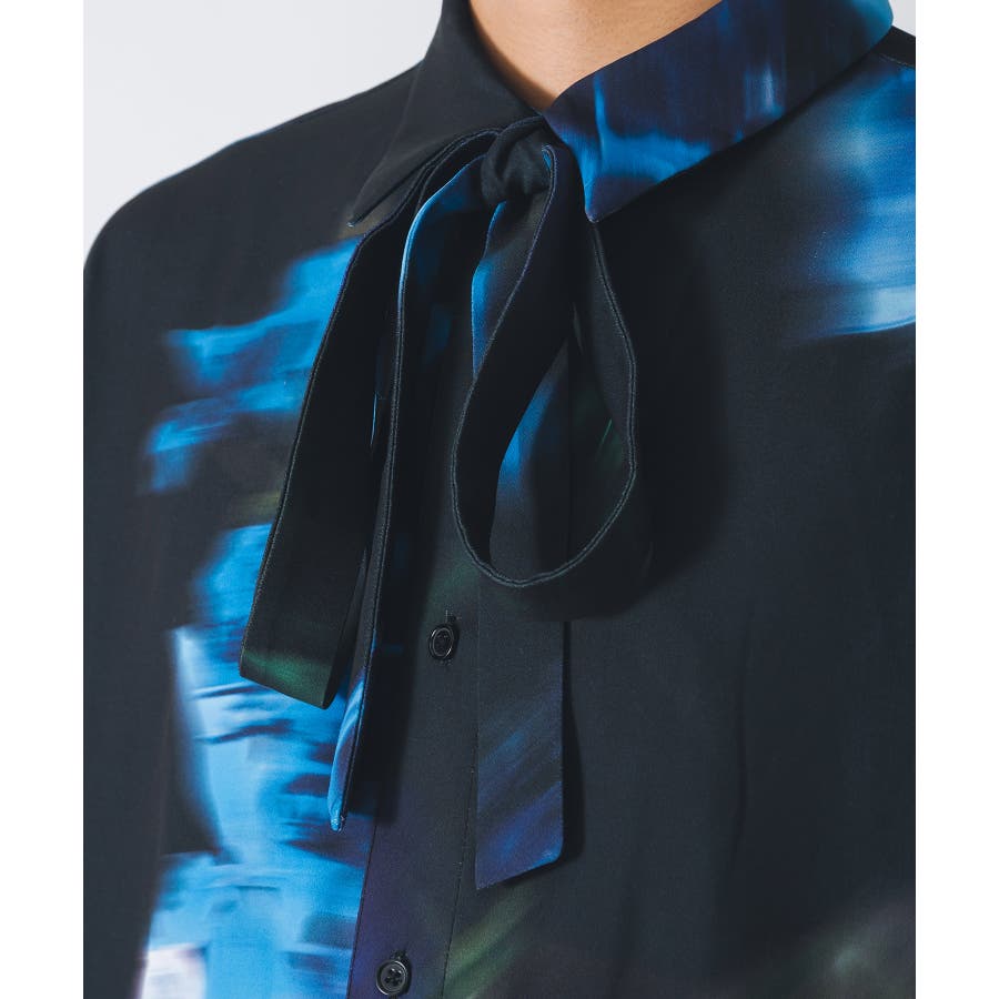 ボディと同素材のリボンがついたモードなプリントシャツです。