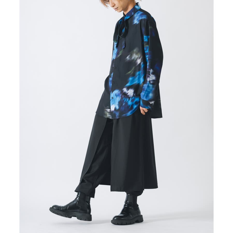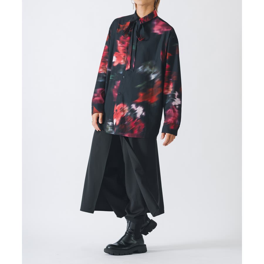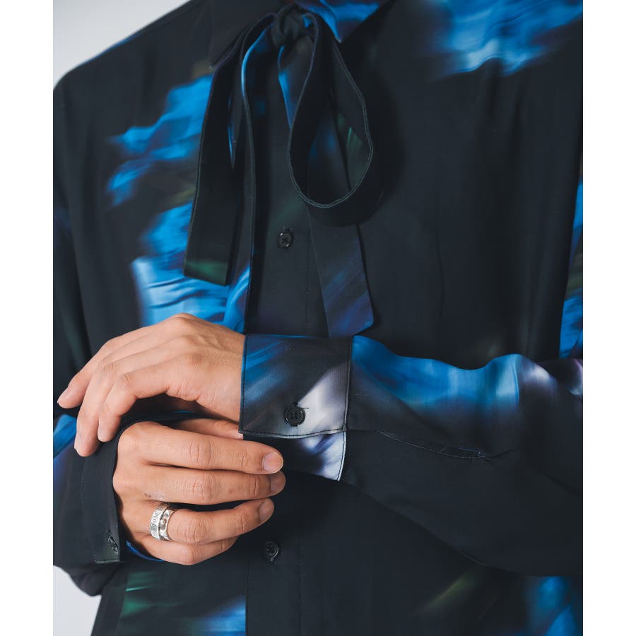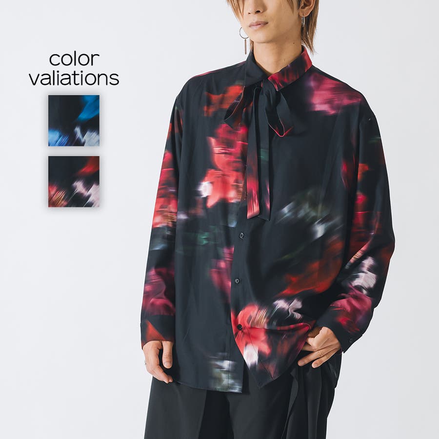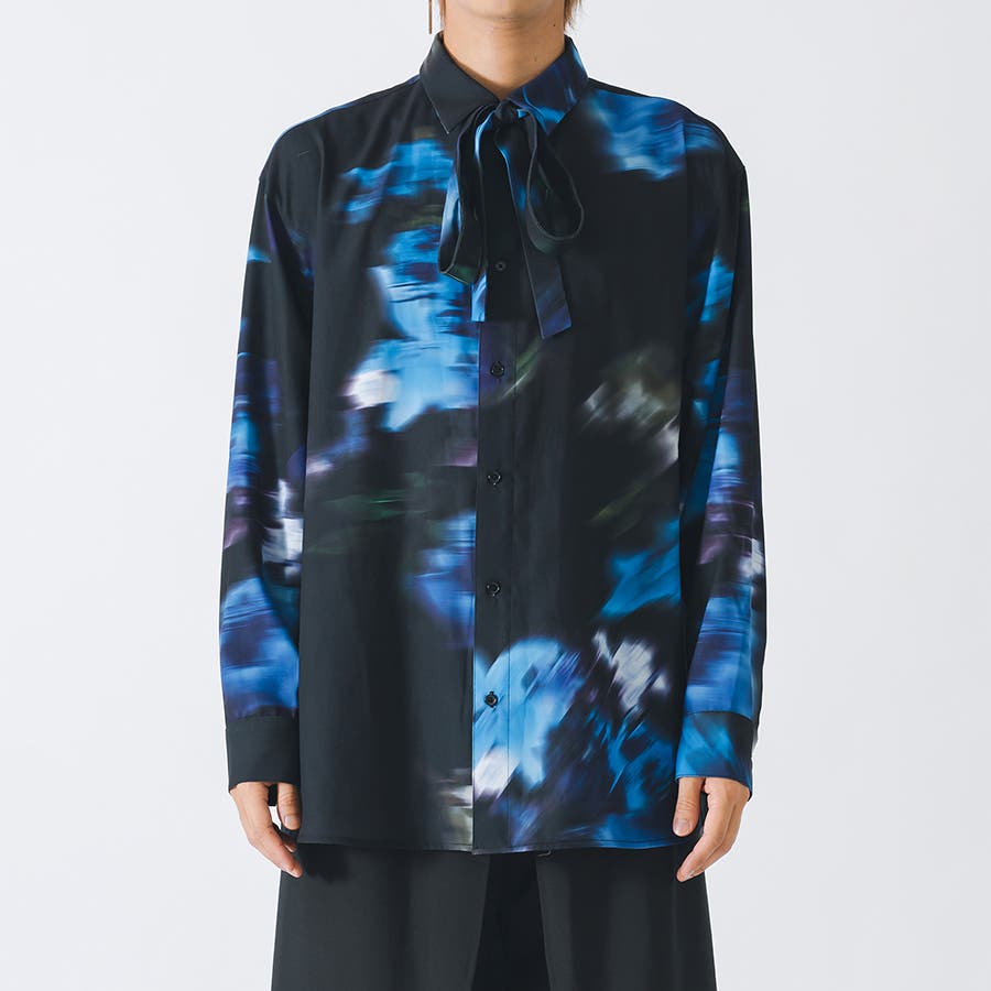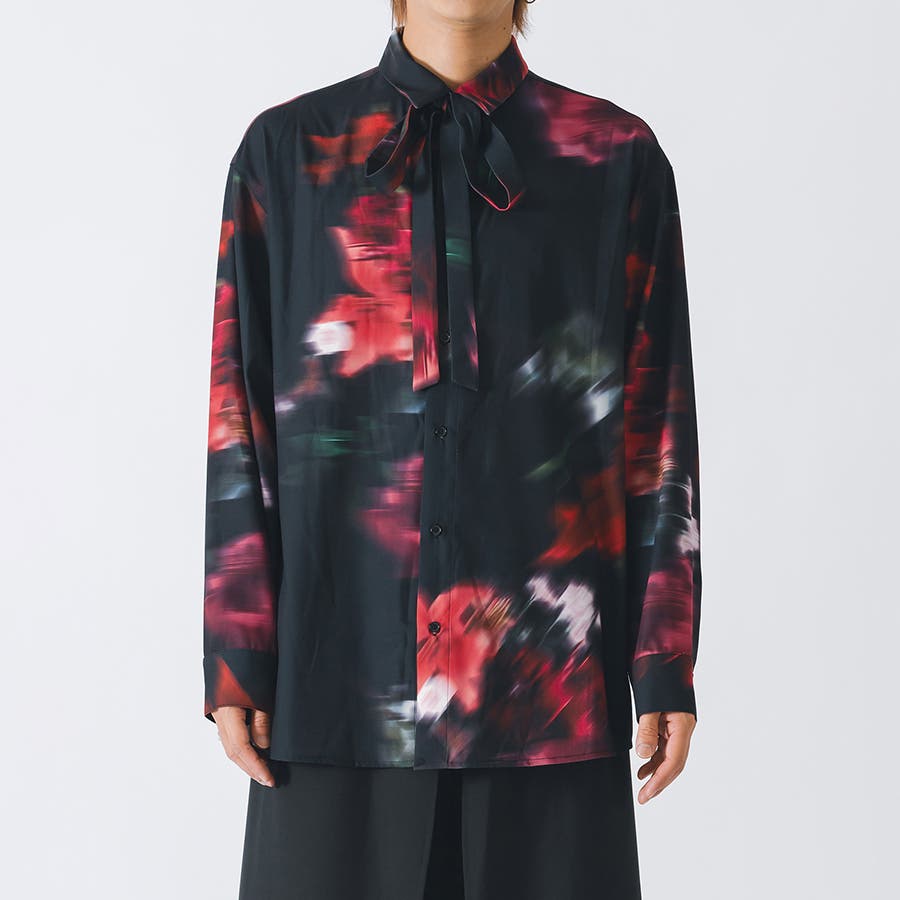 ボディと同素材のリボンがついたモードなプリントシャツです。