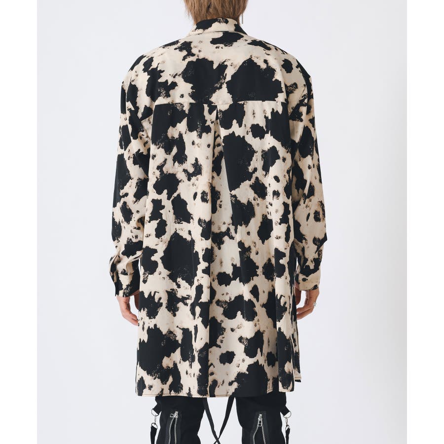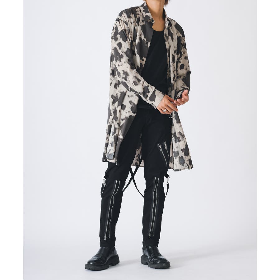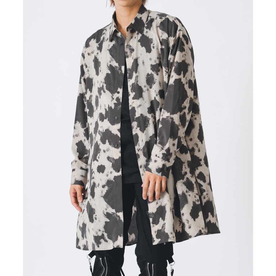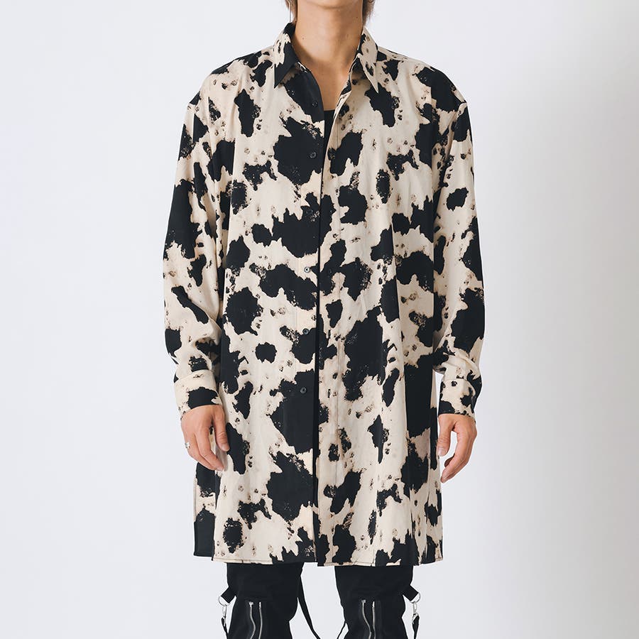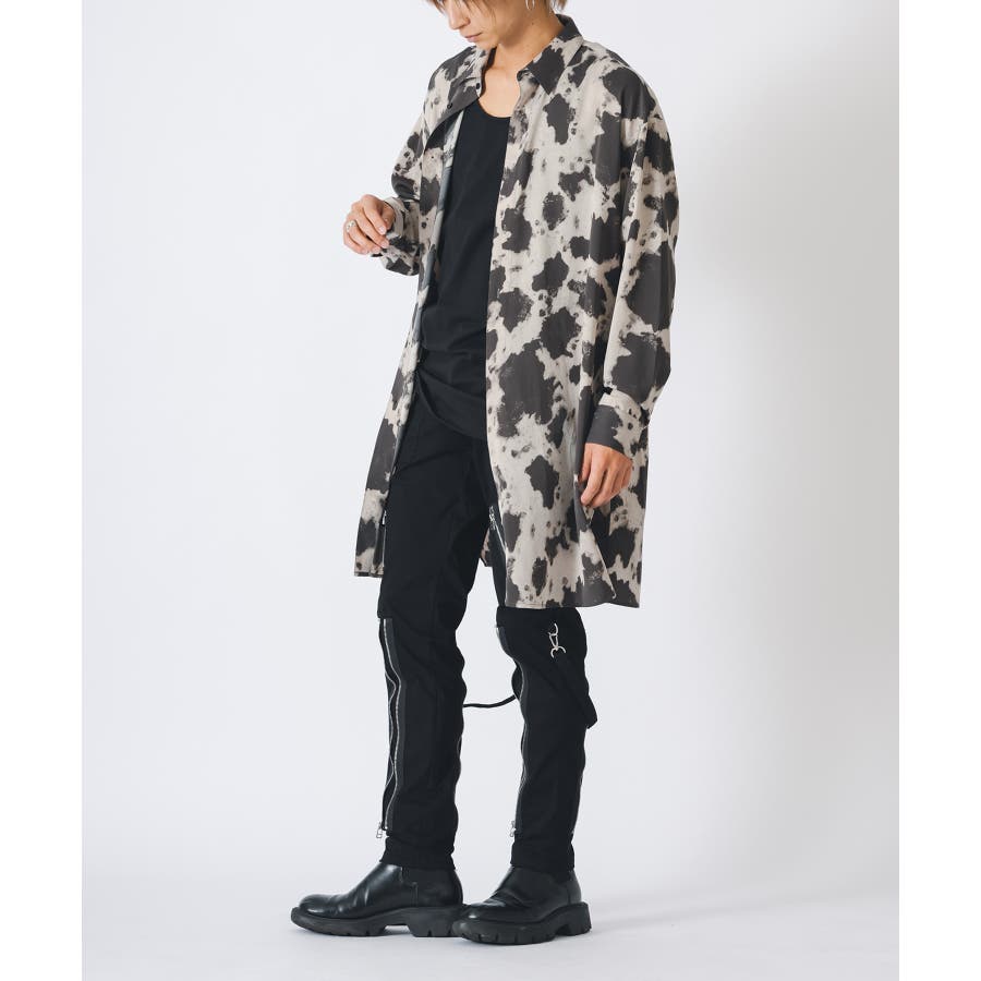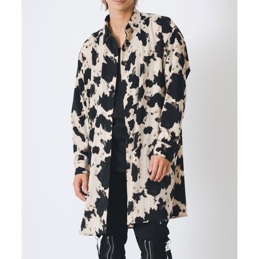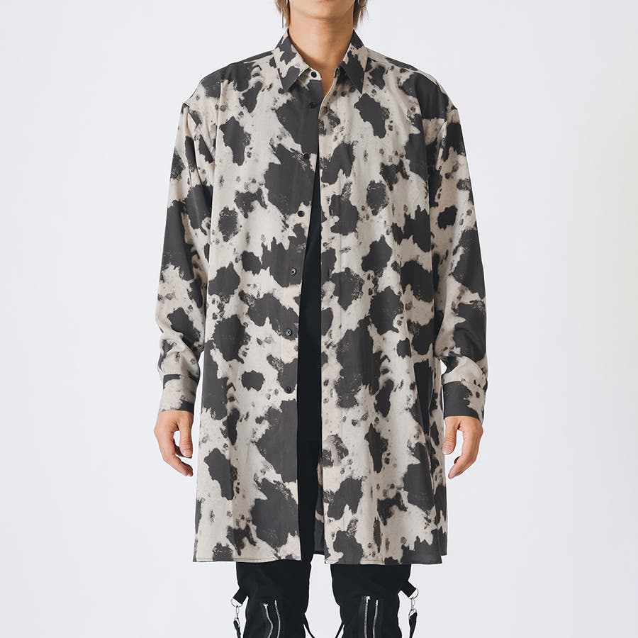 コート感覚で羽織れるムラプリントのロングシャツです。
