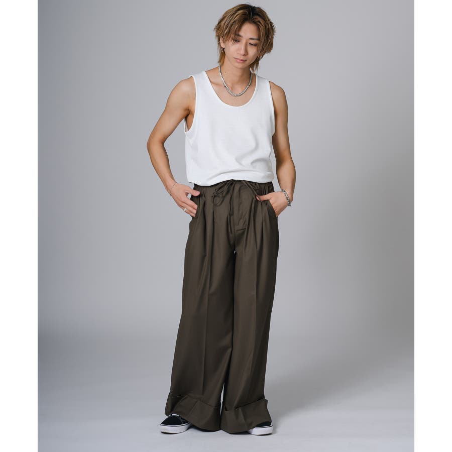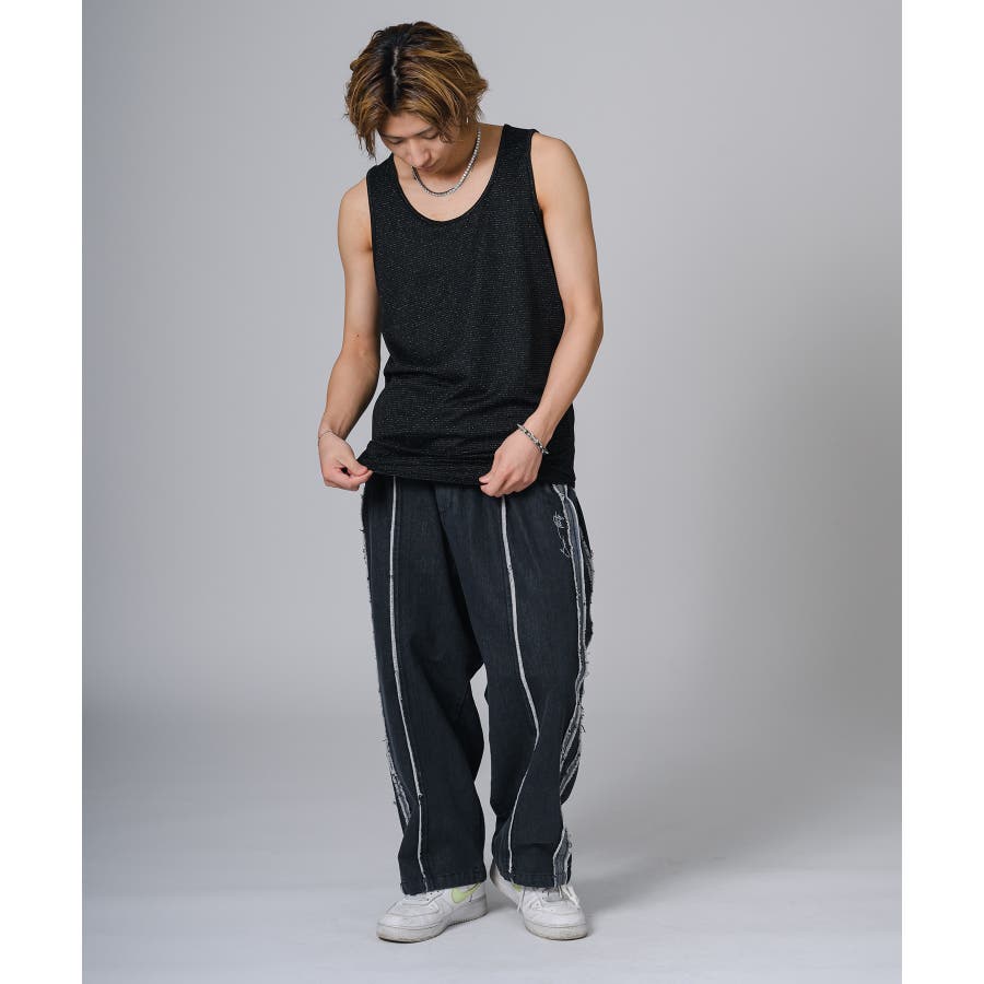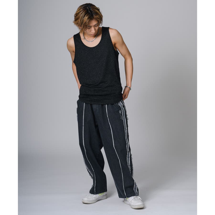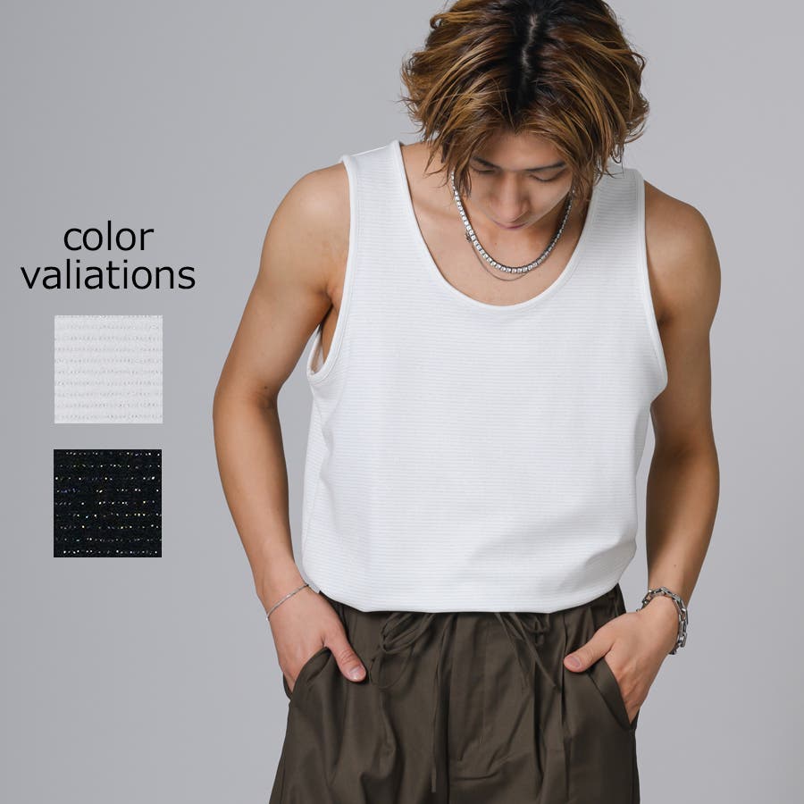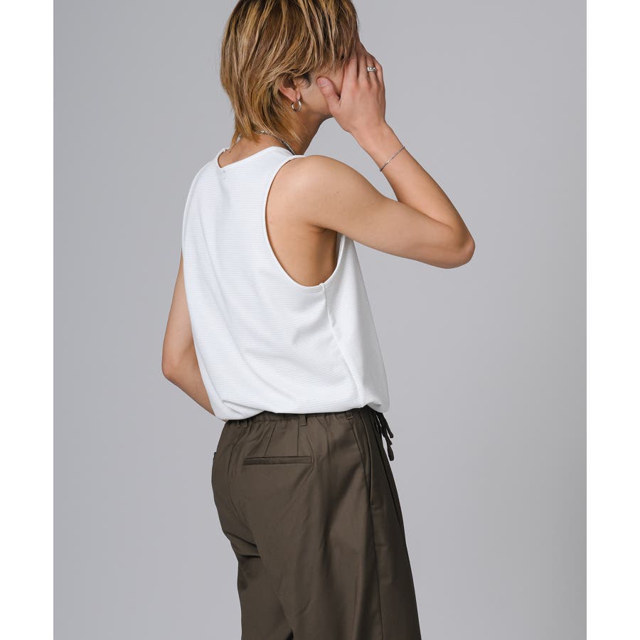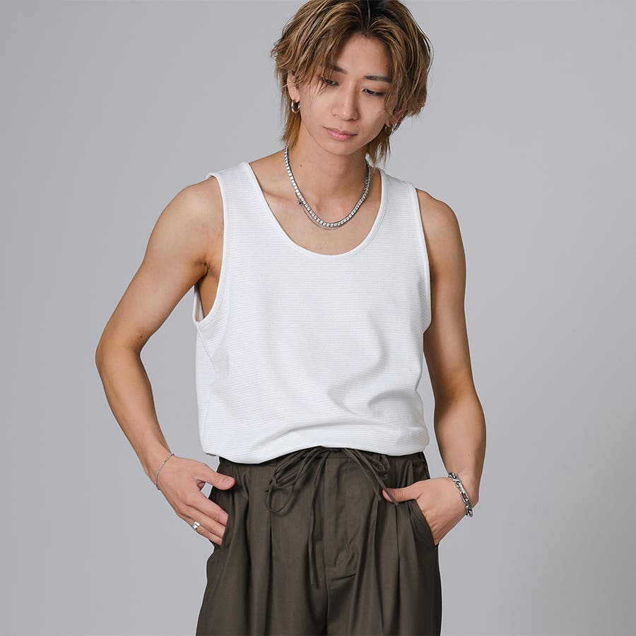ロング丈のタンクトップは、オーバーサイズのTシャツのインナーとして合わせると裾がはみ出て丁度いいレイヤードができます。