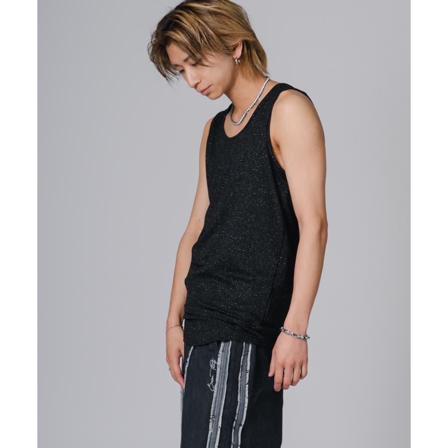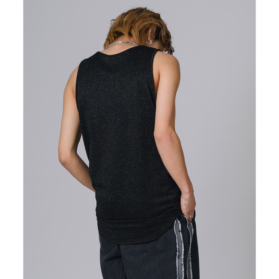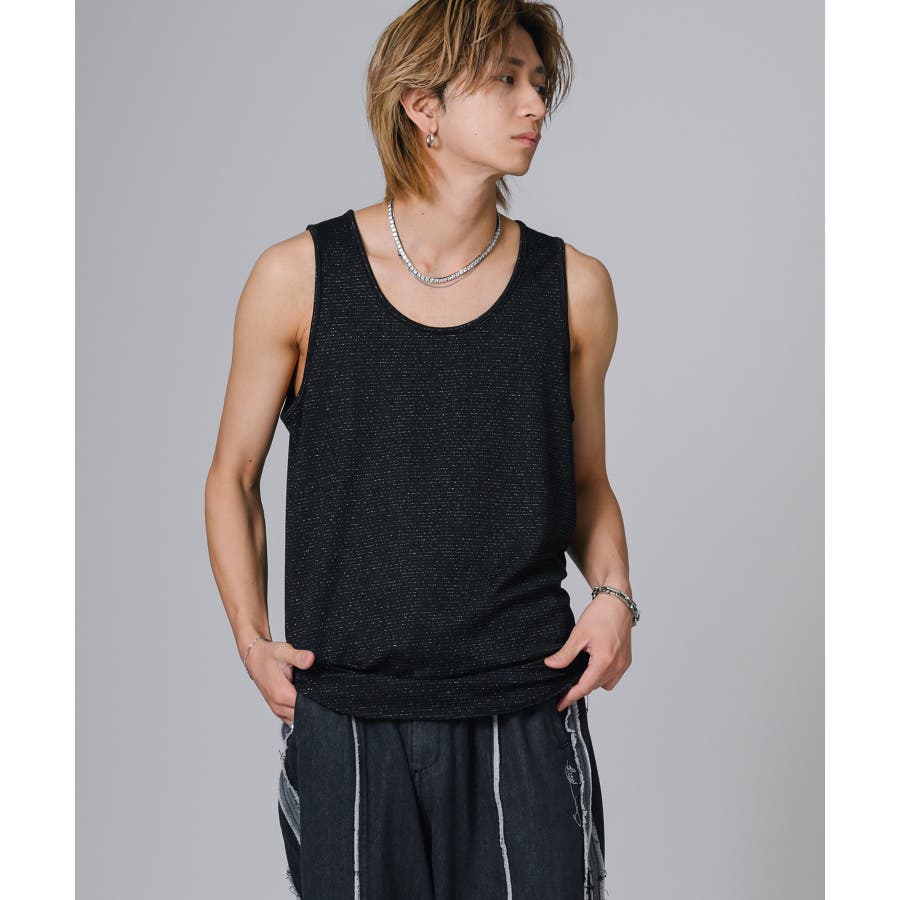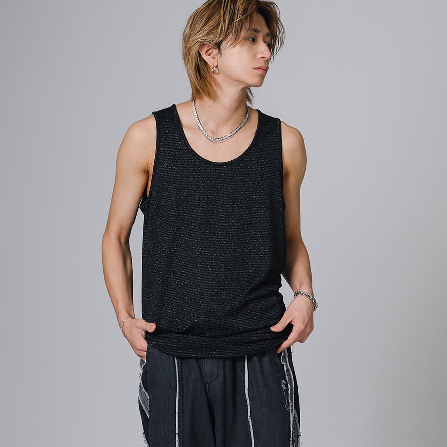 細いラメの糸をボーダー状に編み込んだタンクトップです。