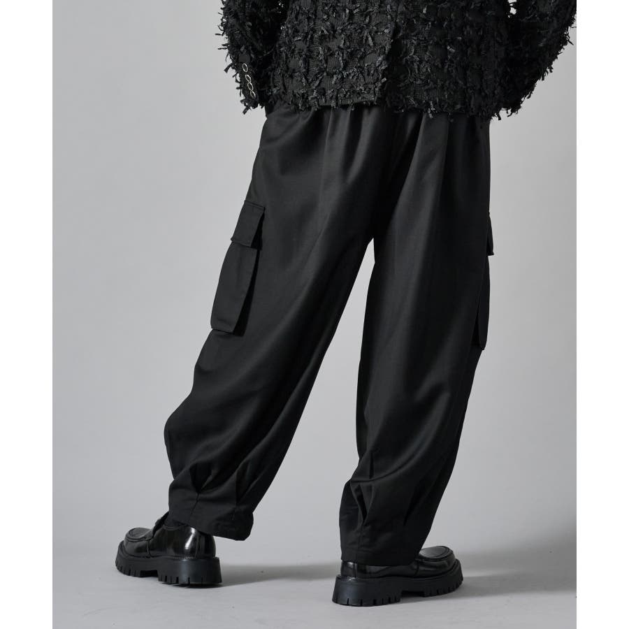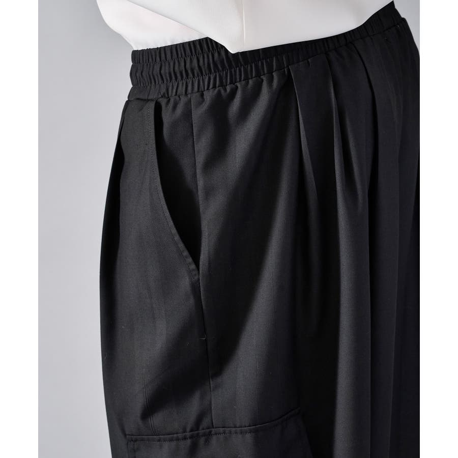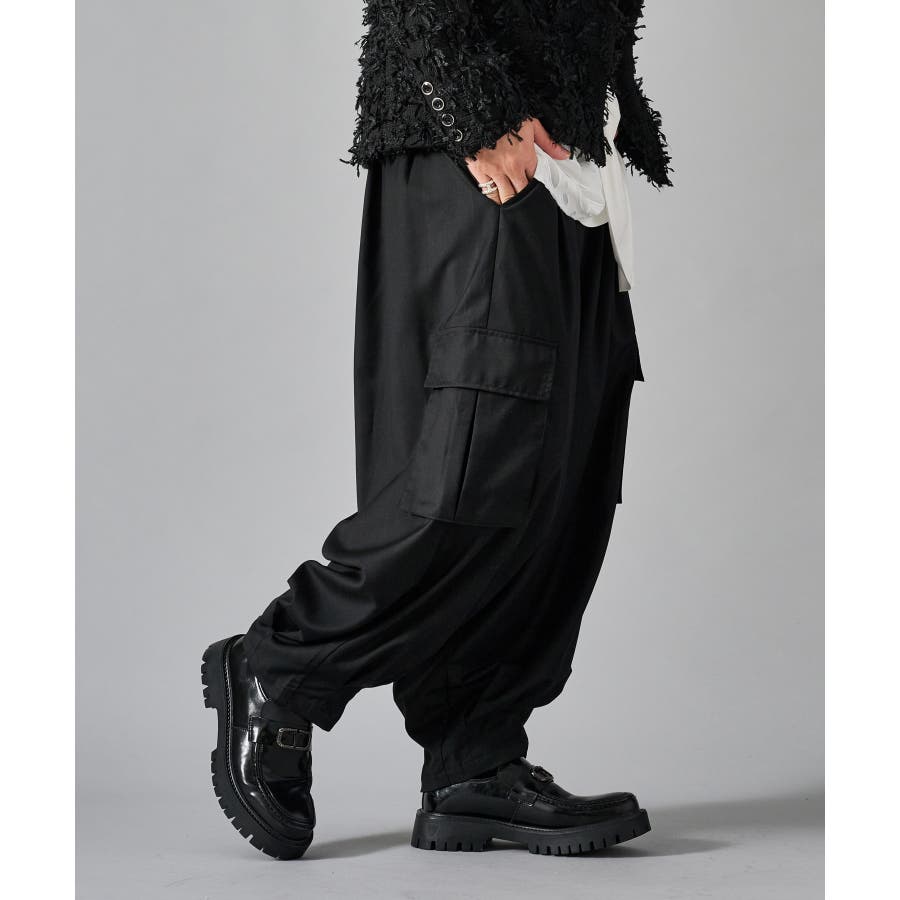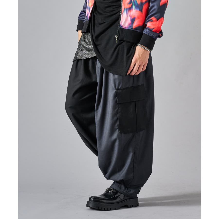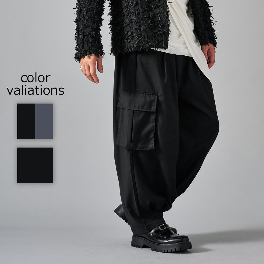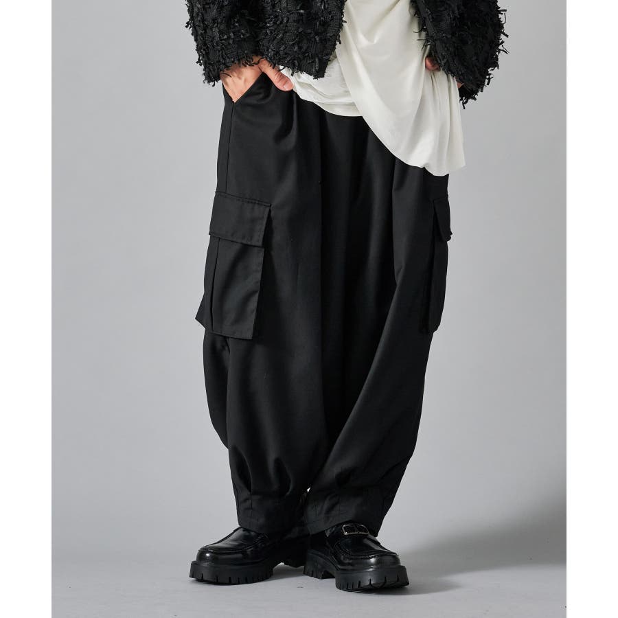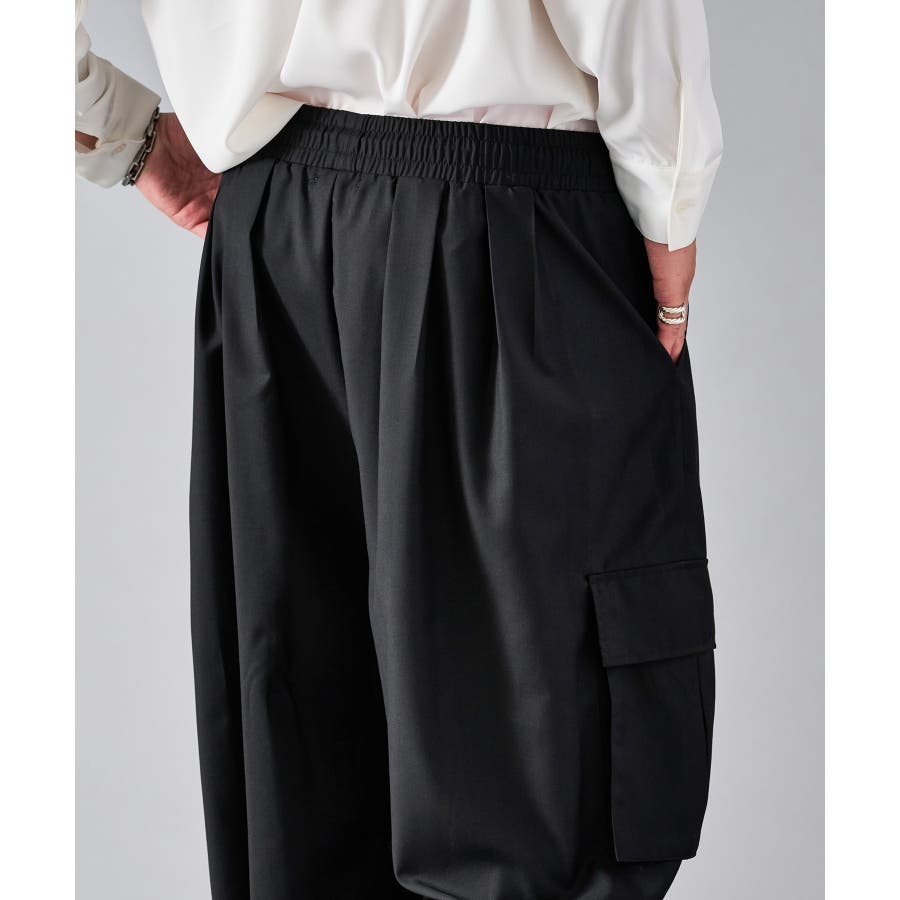 カーゴポケットを備えたイージーワイドスラックスです ■detail 風船の様なバルーンシルエットが特徴で、ウエストはシャーリングでリラックスして穿けます 別名サーカスパンツとも呼ばれ、腰回り全体にタックを設け、裾にもタックを取ることでこの独特なシルエットを実現しています カーゴポケットはマチが狭く、釦もないミニマルなデザインで実用性と言うより、このシルエットを演出する為のデザインになっています ■fabric ドレープ性のある素材感が、そのゆったりとしたシルエットを絶妙に表現しており、履き心地もソフトで気持ちいい ブラックのカラーと、左右のカラーを切り替えたマルチカラーの2色展開です ■styling ショートジャケットやロングシャツとの相性が絶妙にクールなアイテムです | |||||||||||||||