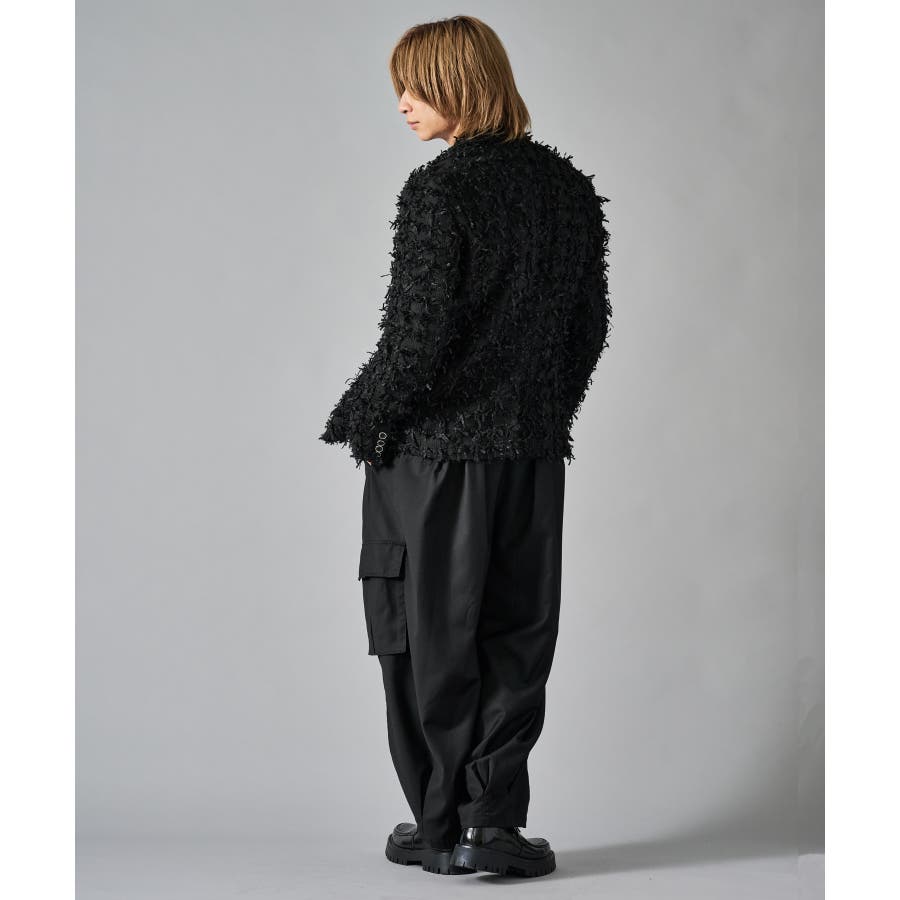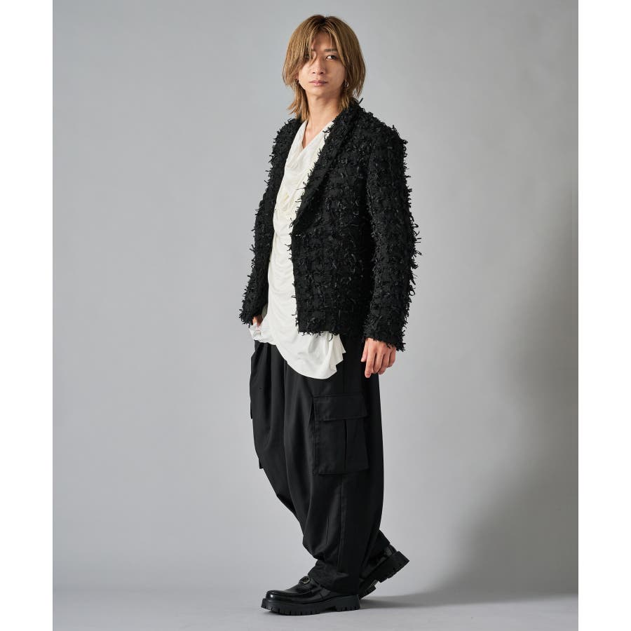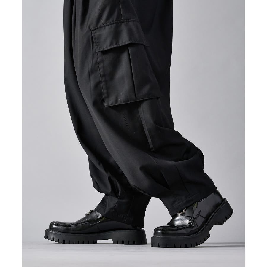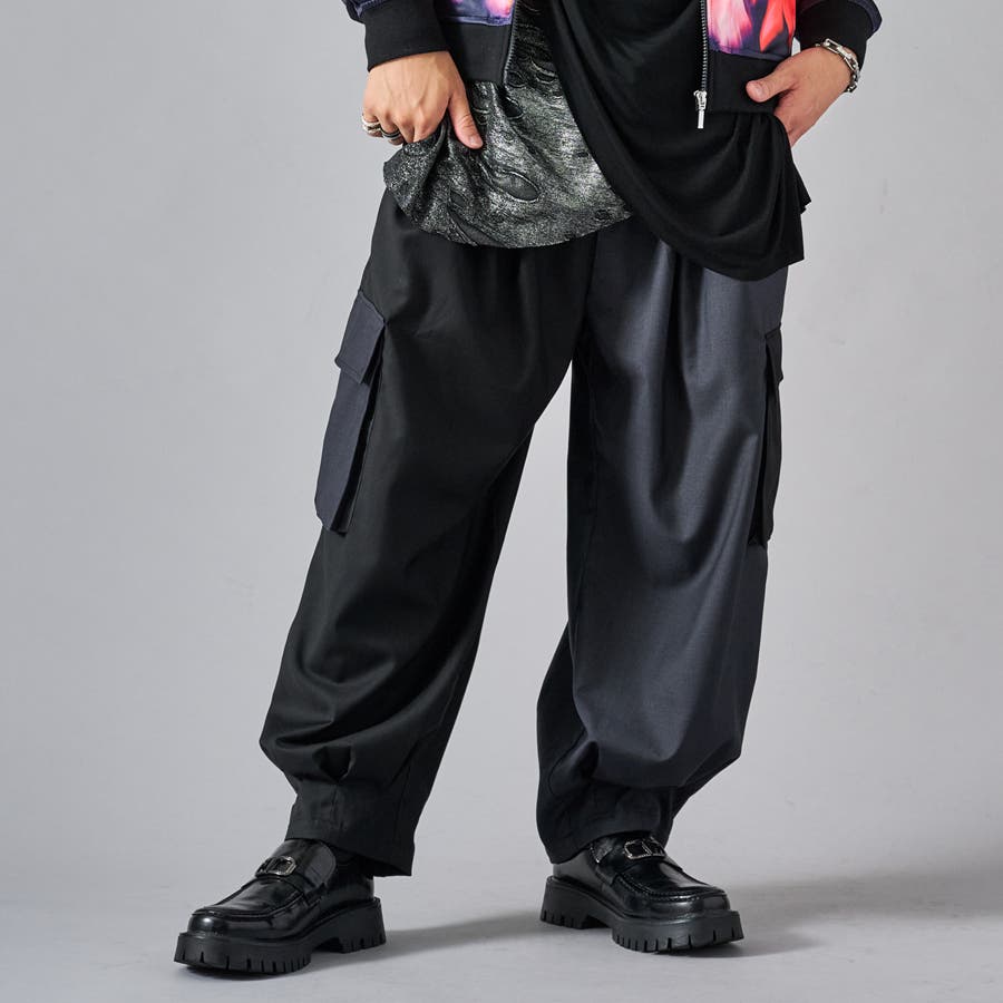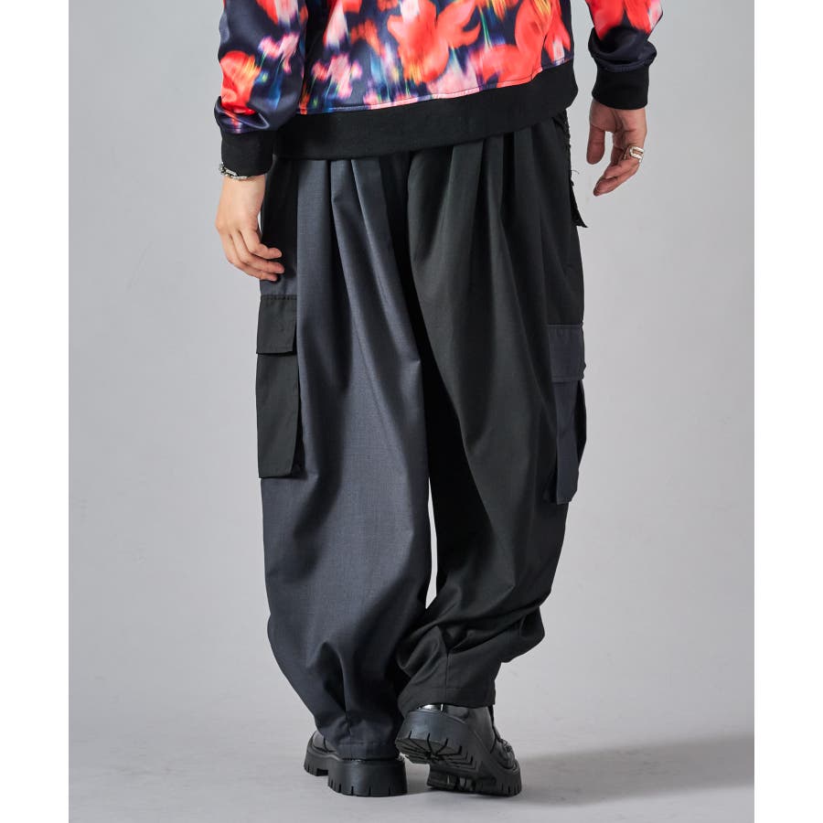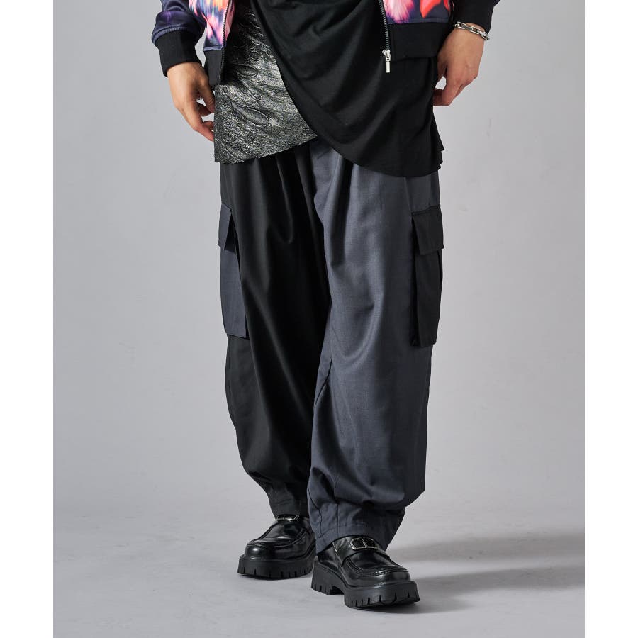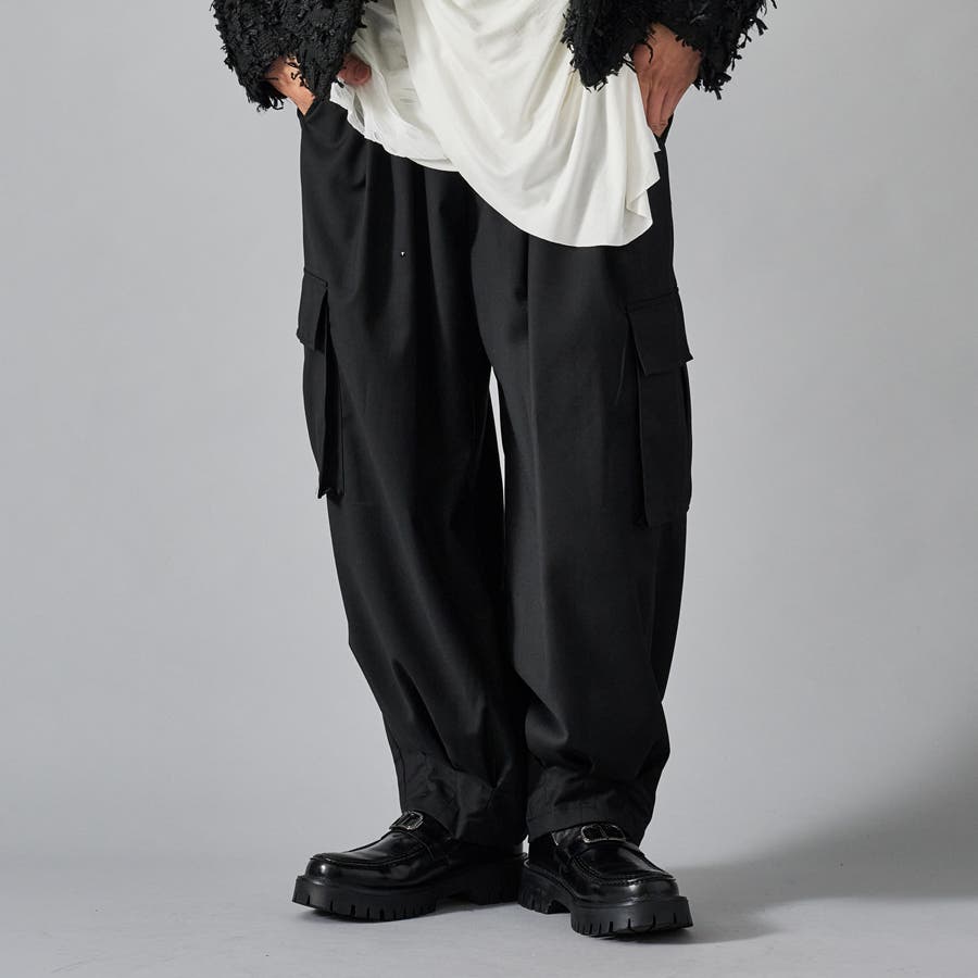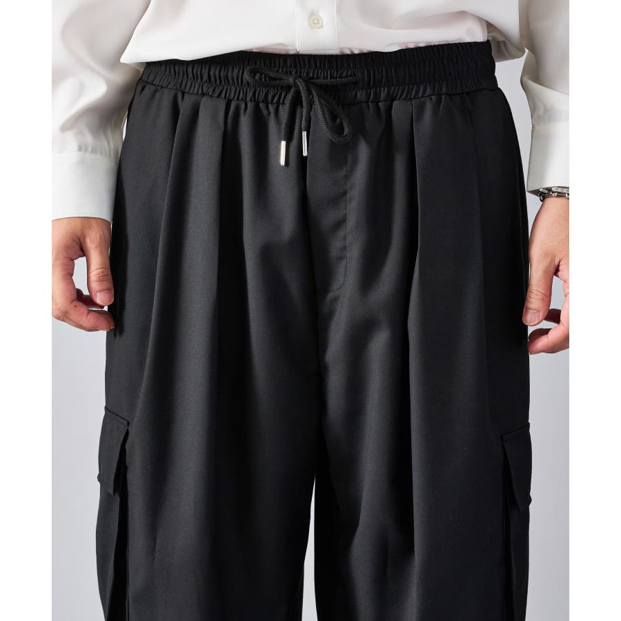 カーゴポケットを備えたイージーワイドスラックスです ■detail 風船の様なバルーンシルエットが特徴で、ウエストはシャーリングでリラックスして穿けます 別名サーカスパンツとも呼ばれ、腰回り全体にタックを設け、裾にもタックを取ることでこの独特なシルエットを実現しています カーゴポケットはマチが狭く、釦もないミニマルなデザインで実用性と言うより、このシルエットを演出する為のデザインになっています ■fabric ドレープ性のある素材感が、そのゆったりとしたシルエットを絶妙に表現しており、履き心地もソフトで気持ちいい ブラックのカラーと、左右のカラーを切り替えたマルチカラーの2色展開です ■styling ショートジャケットやロングシャツとの相性が絶妙にクールなアイテムです | |||||||||||||||