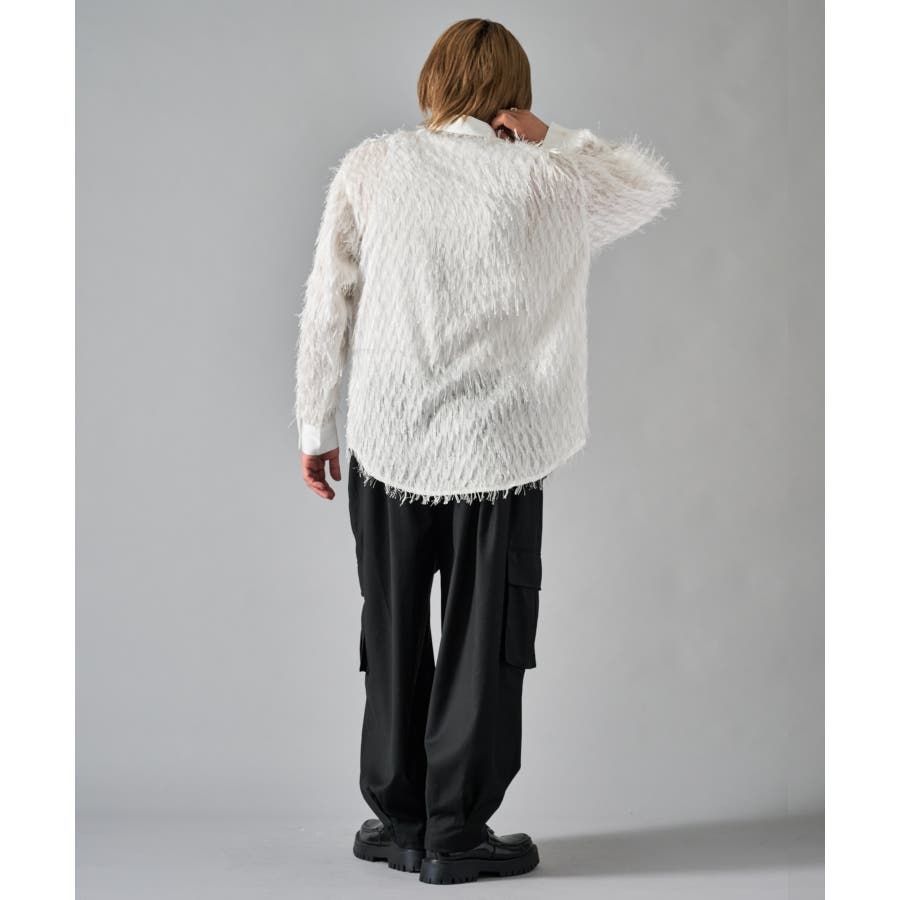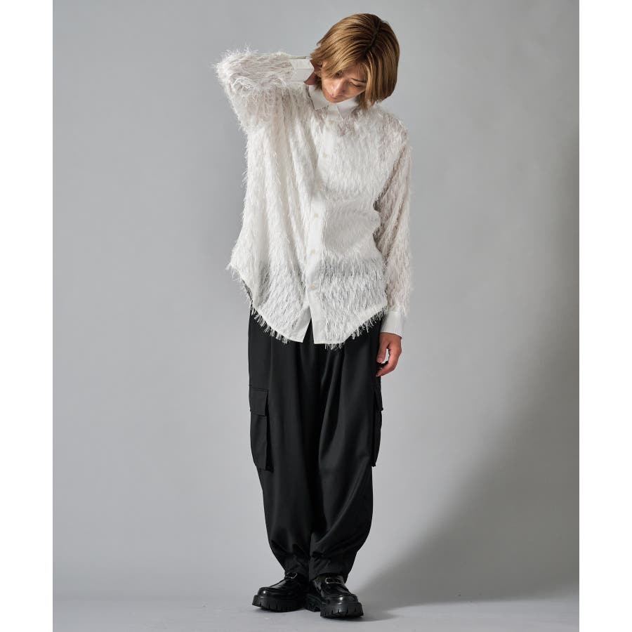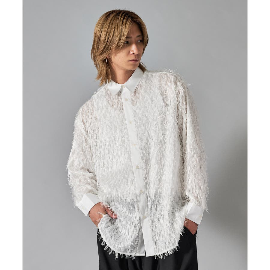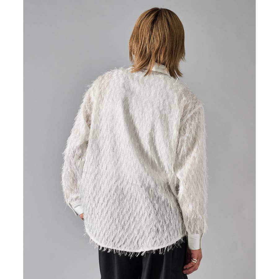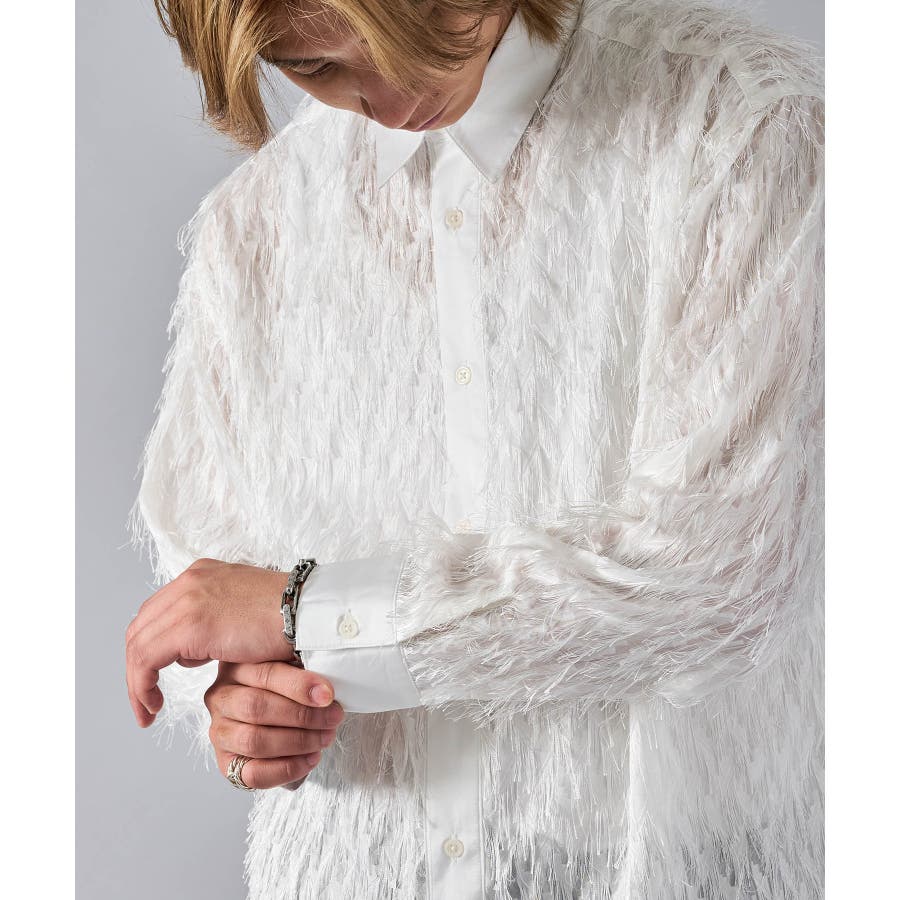 | フェザーを纏ってるかの様なオーバーサイズの長袖シャツです ■detail まるで羽根の様にも見えるシャギーな素材が特徴のアイテムです 襟、前立、カフスは同色のサテン生地で切り替えており、肌触りもスムーズで光沢感が目を引きます ■fabric シャギー感とシアー感もある素材がセクシーな印象です ■styling ドレープ感のあるスラックスとの相性が良く、テーラードジャケット、ショートジャケット、ライーダースなどのインナーとして裾を出して着るとレイヤード感がクールです | |||||||||||||||