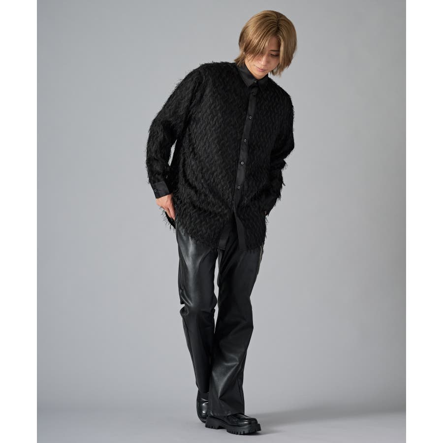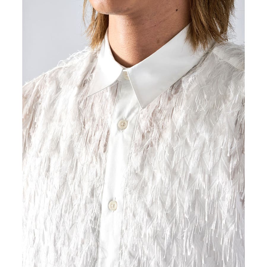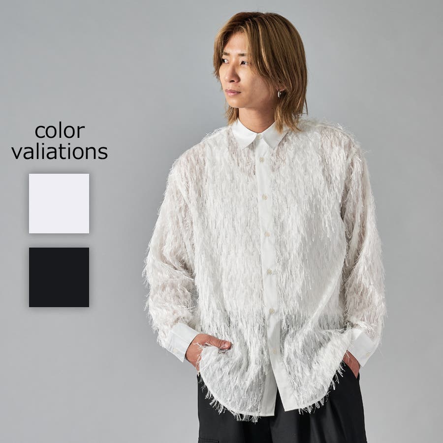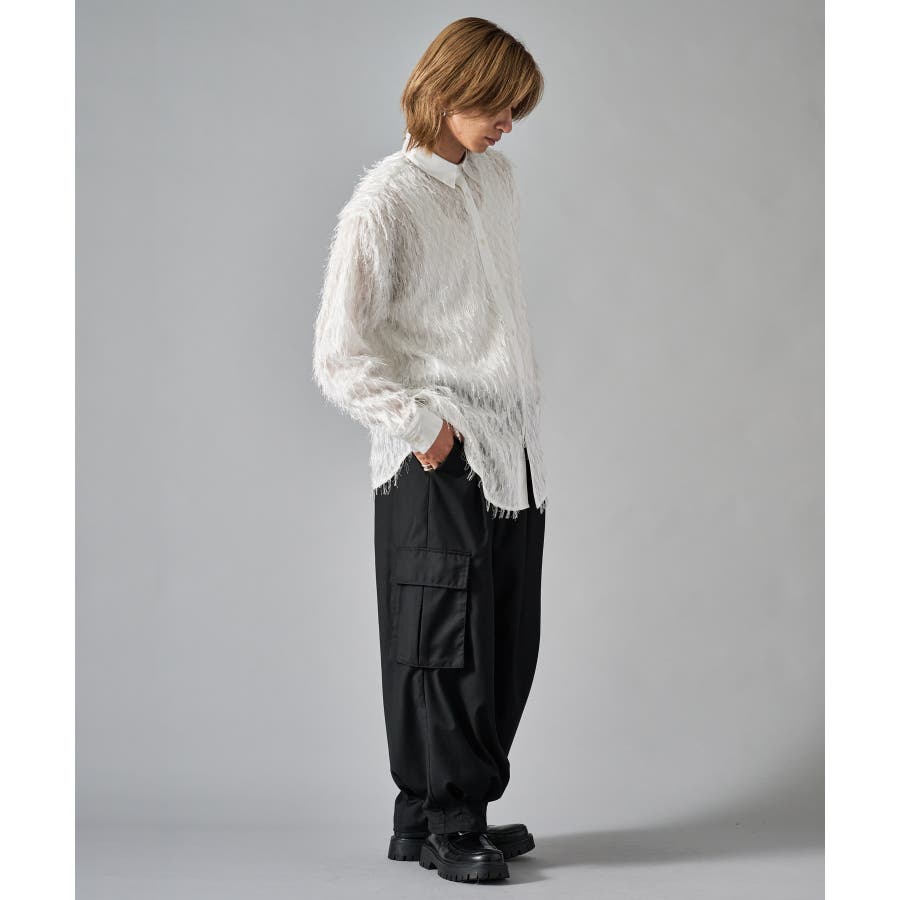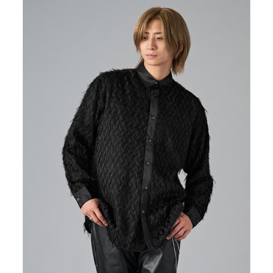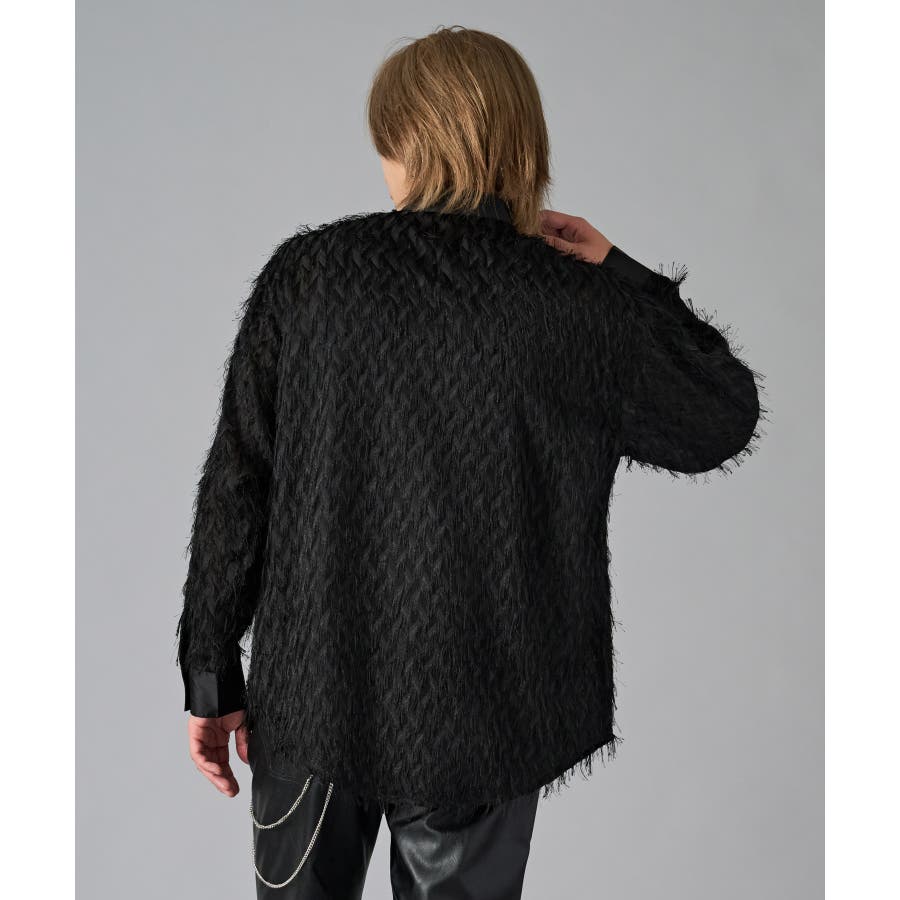| フェザーを纏ってるかの様なオーバーサイズの長袖シャツです ■detail まるで羽根の様にも見えるシャギーな素材が特徴のアイテムです 襟、前立、カフスは同色のサテン生地で切り替えており、肌触りもスムーズで光沢感が目を引きます ■fabric シャギー感とシアー感もある素材がセクシーな印象です ■styling ドレープ感のあるスラックスとの相性が良く、テーラードジャケット、ショートジャケット、ライーダースなどのインナーとして裾を出して着るとレイヤード感がクールです | |||||||||||||||