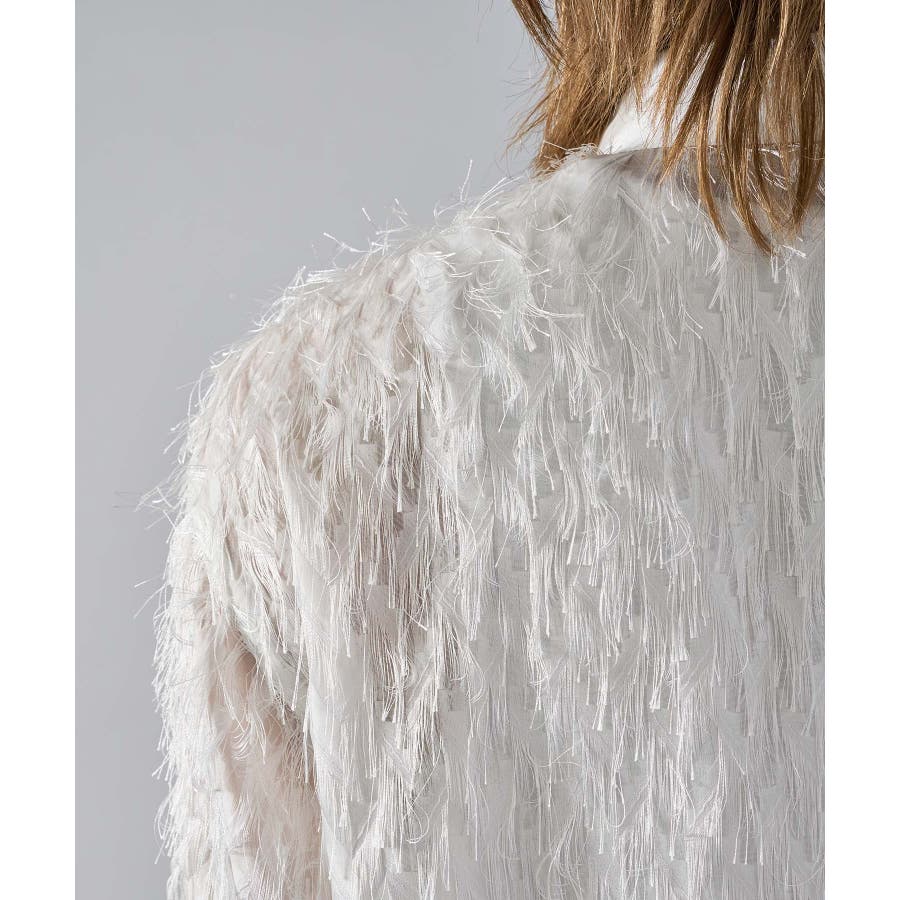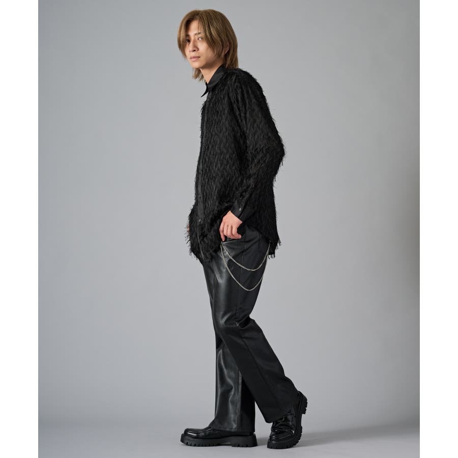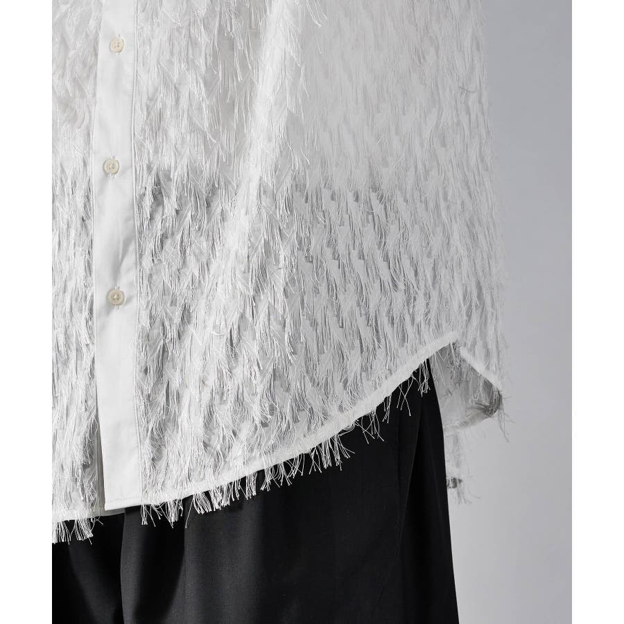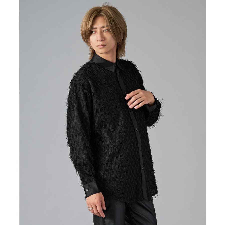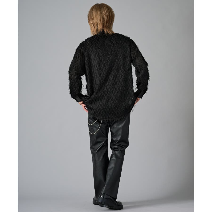 | フェザーを纏ってるかの様なオーバーサイズの長袖シャツです ■detail まるで羽根の様にも見えるシャギーな素材が特徴のアイテムです 襟、前立、カフスは同色のサテン生地で切り替えており、肌触りもスムーズで光沢感が目を引きます ■fabric シャギー感とシアー感もある素材がセクシーな印象です ■styling ドレープ感のあるスラックスとの相性が良く、テーラードジャケット、ショートジャケット、ライーダースなどのインナーとして裾を出して着るとレイヤード感がクールです | |||||||||||||||