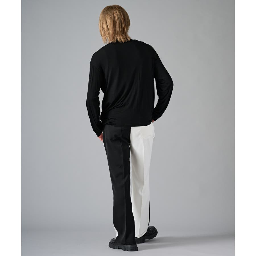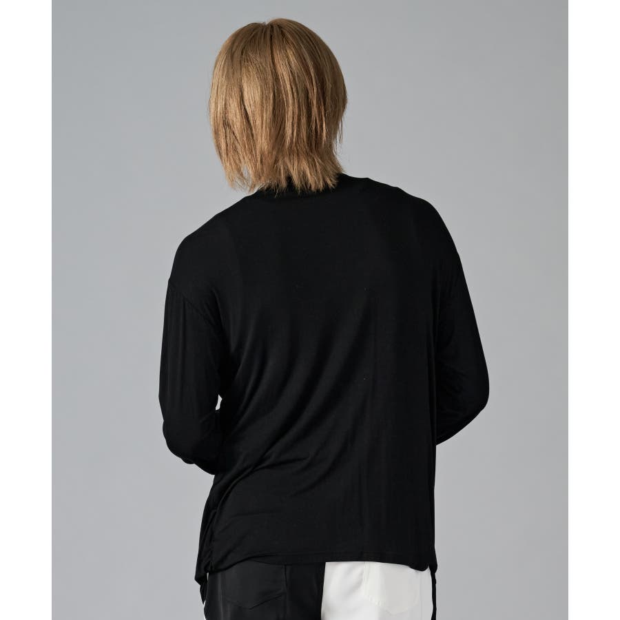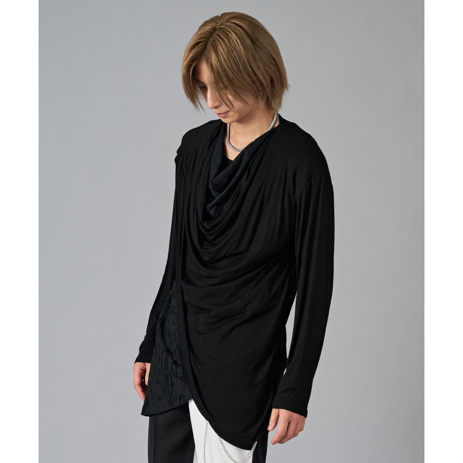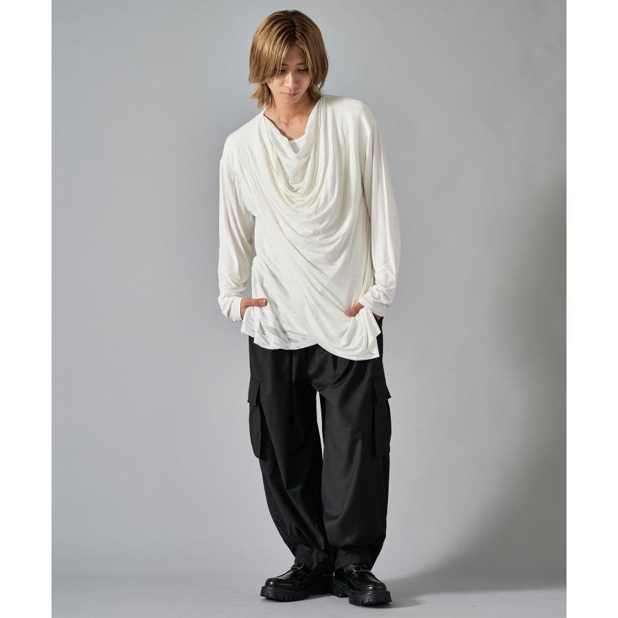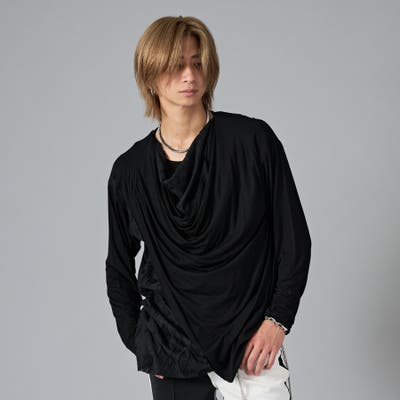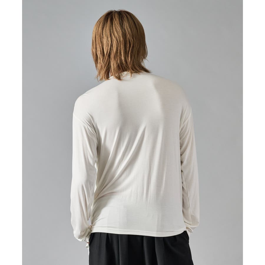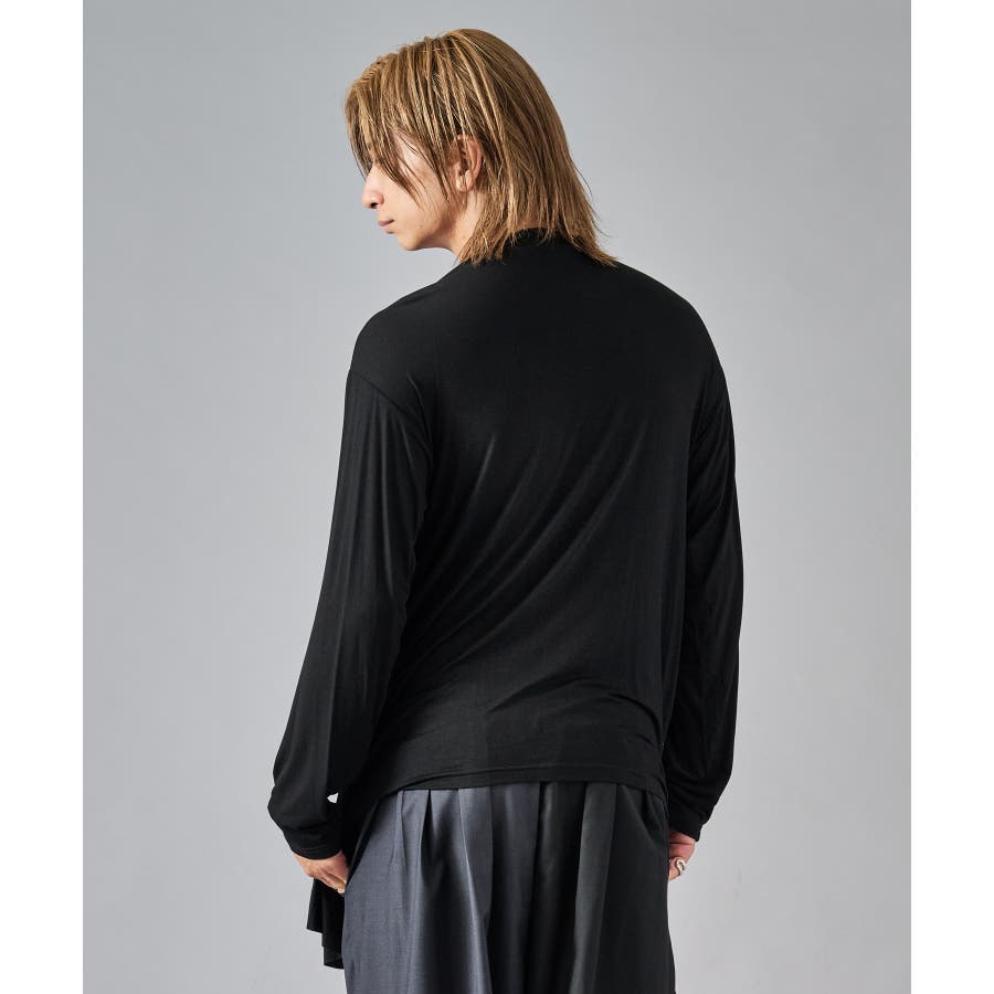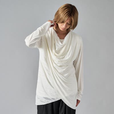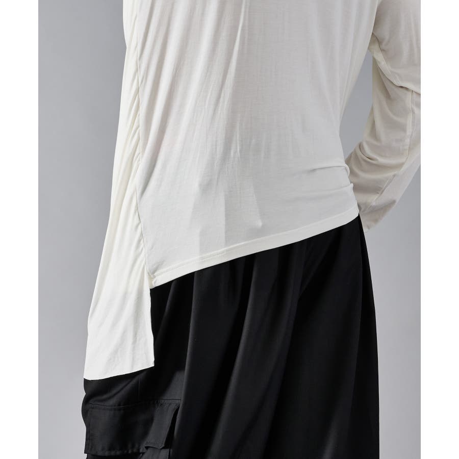 | フロントの独特のドレープが印象的なロンTです ■detail ネック下のたわみが波紋の様に広がるドレープ感がデザインとなって、ゆとりとオシャレを両立させてくれるデザインです フロントは二枚の生地が重なるようになっており、内側はダメージ感のある別の生地でレイヤード感を演出しています 長めのフロントながらラウンドした裾によって着やすくなっています ■fabric 柔らかでシルキーな生地は、光沢感があって肌触りも抜群です ■styling ゆとりのあるワイドなパンツとのコーデがおすすめです | |||||||||||||||
