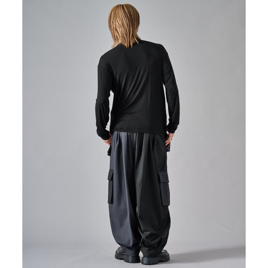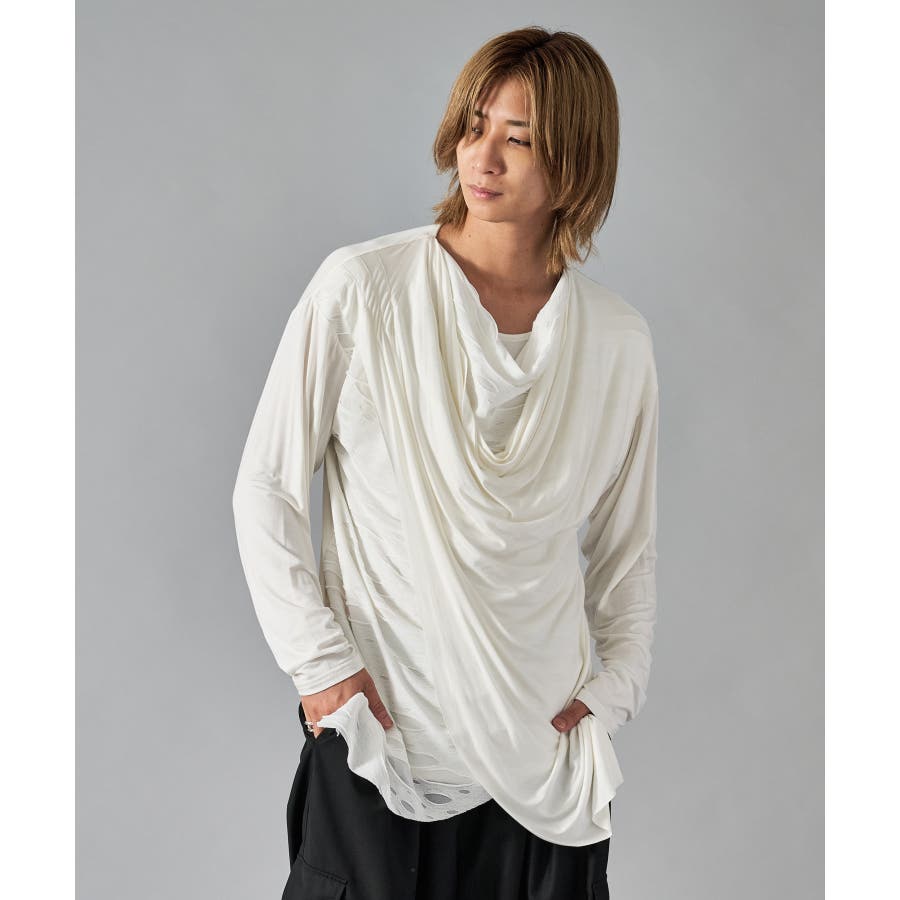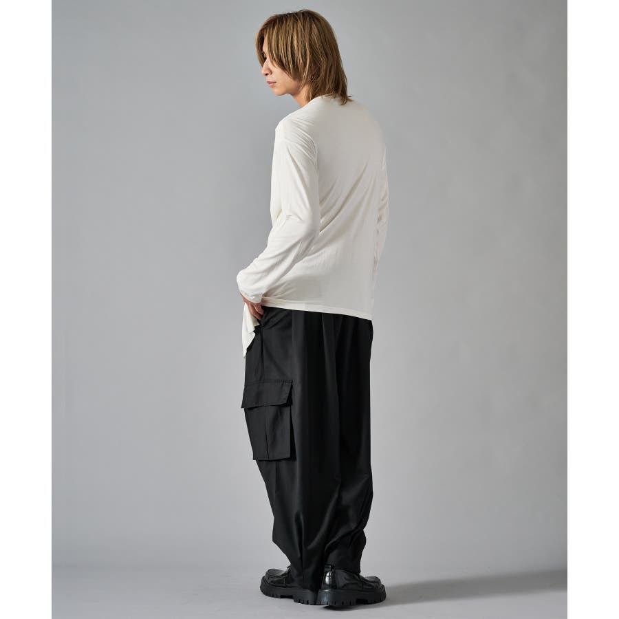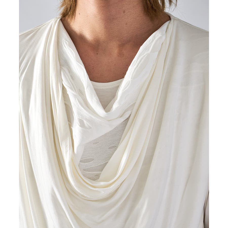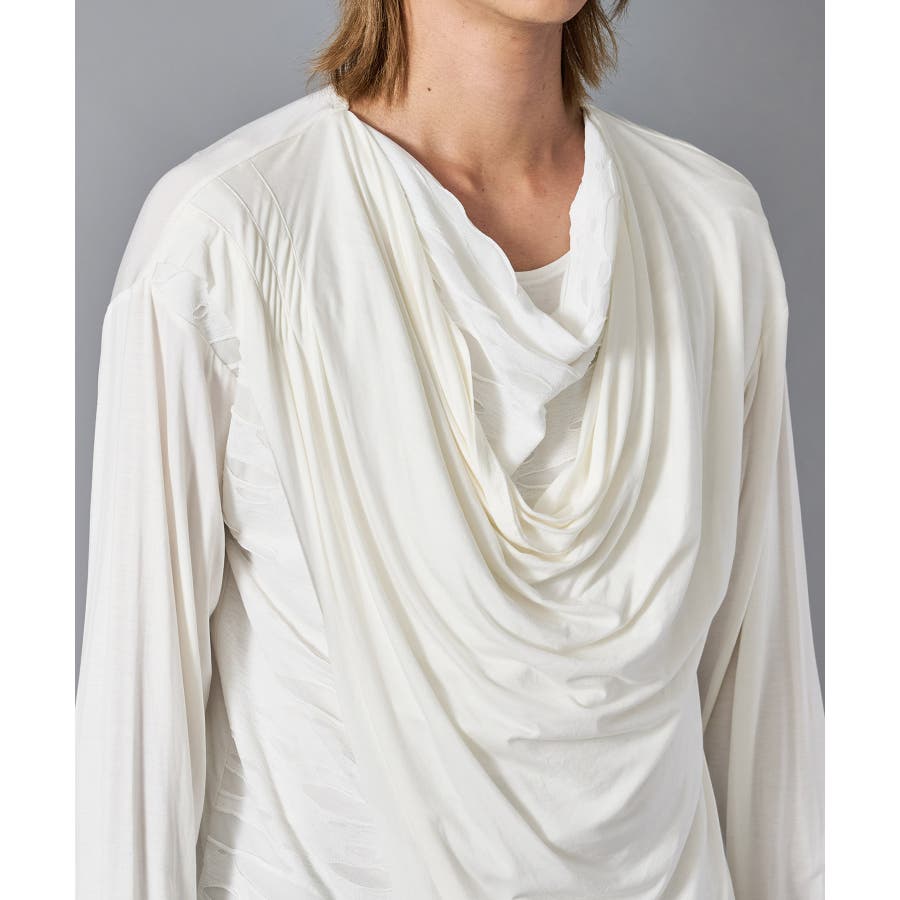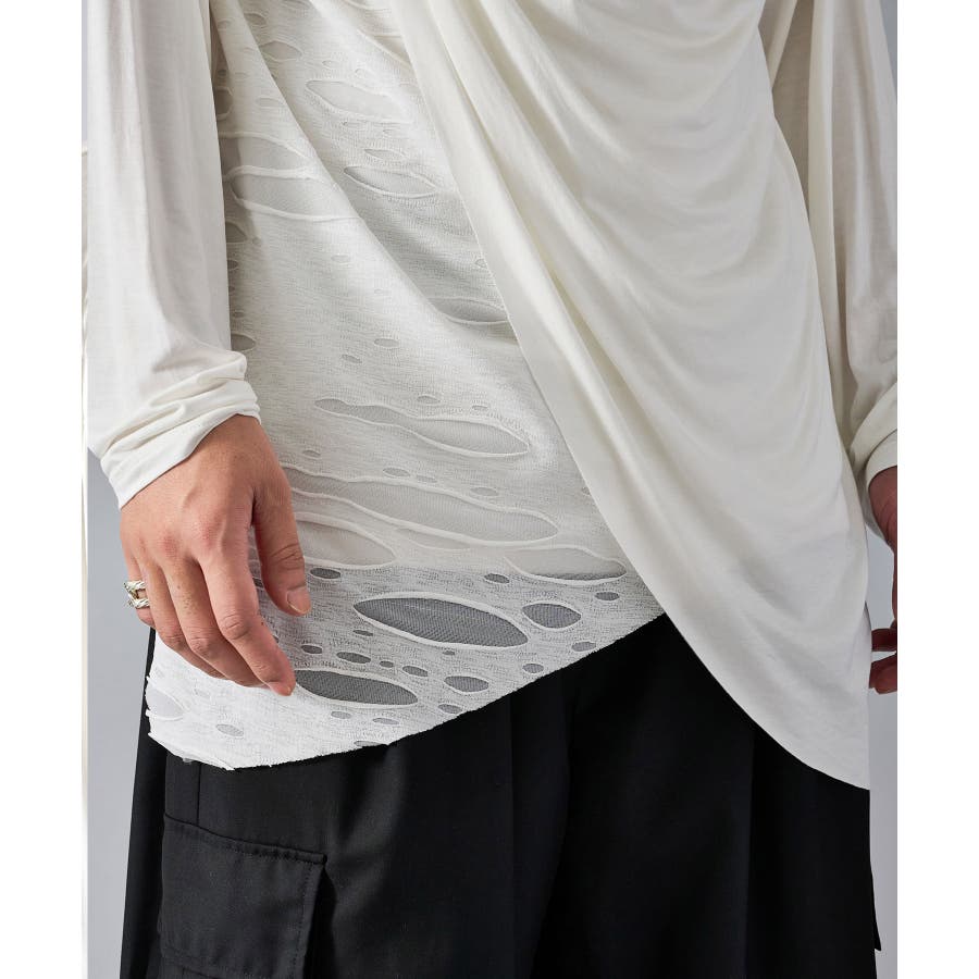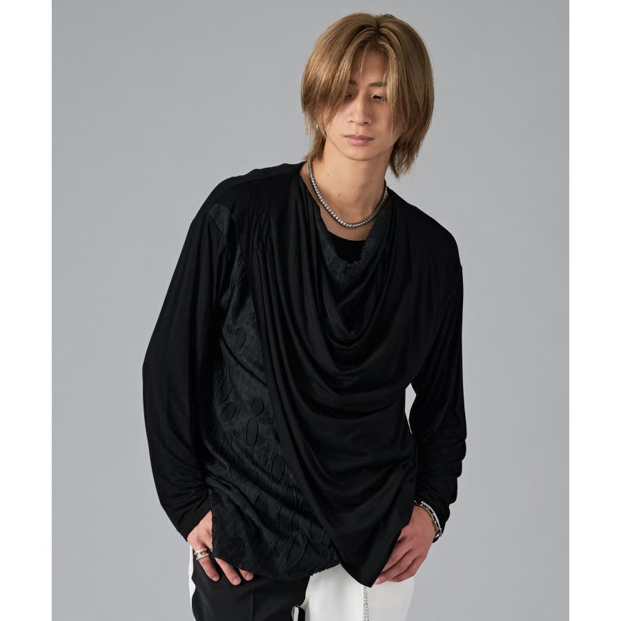 | フロントの独特のドレープが印象的なロンTです ■detail ネック下のたわみが波紋の様に広がるドレープ感がデザインとなって、ゆとりとオシャレを両立させてくれるデザインです フロントは二枚の生地が重なるようになっており、内側はダメージ感のある別の生地でレイヤード感を演出しています 長めのフロントながらラウンドした裾によって着やすくなっています ■fabric 柔らかでシルキーな生地は、光沢感があって肌触りも抜群です ■styling ゆとりのあるワイドなパンツとのコーデがおすすめです | |||||||||||||||