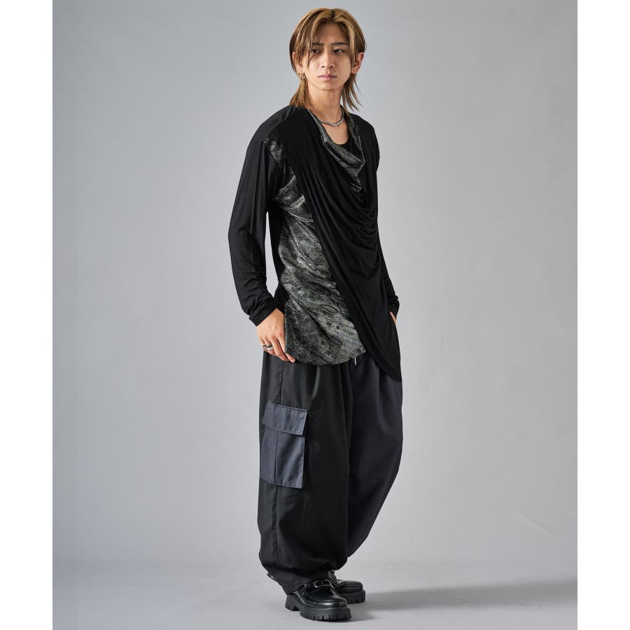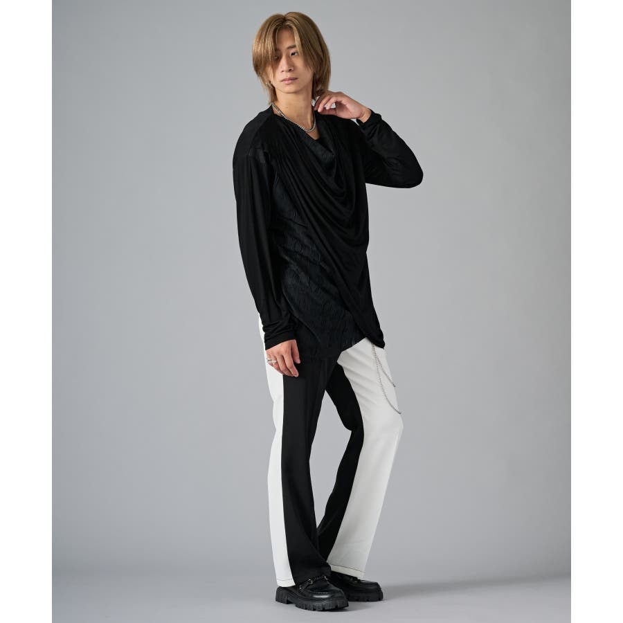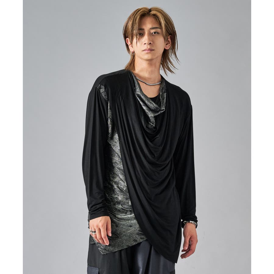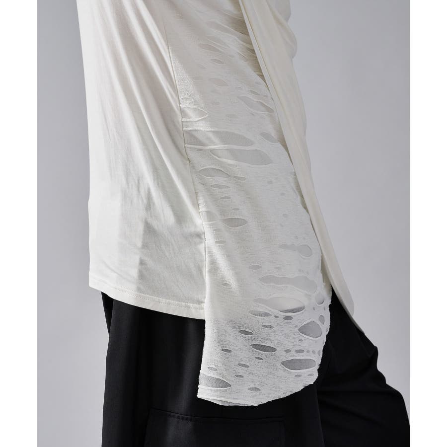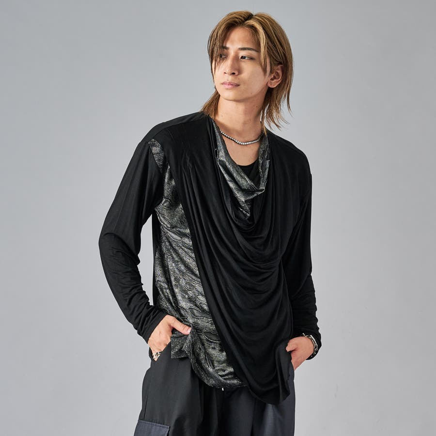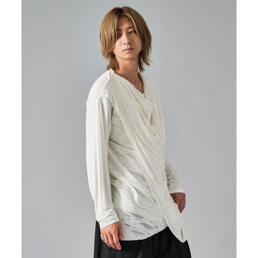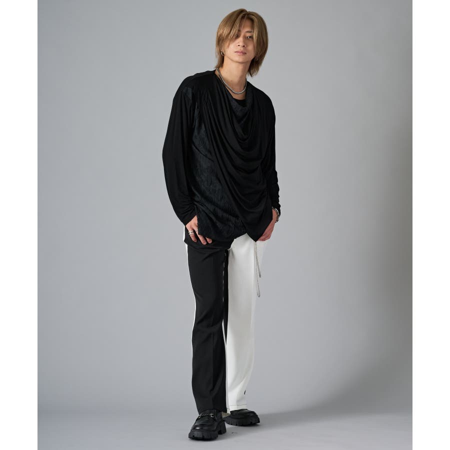 | フロントの独特のドレープが印象的なロンTです ■detail ネック下のたわみが波紋の様に広がるドレープ感がデザインとなって、ゆとりとオシャレを両立させてくれるデザインです フロントは二枚の生地が重なるようになっており、内側はダメージ感のある別の生地でレイヤード感を演出しています 長めのフロントながらラウンドした裾によって着やすくなっています ■fabric 柔らかでシルキーな生地は、光沢感があって肌触りも抜群です ■styling ゆとりのあるワイドなパンツとのコーデがおすすめです | |||||||||||||||