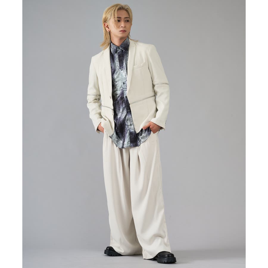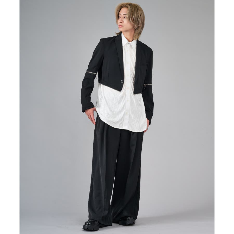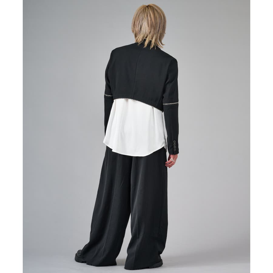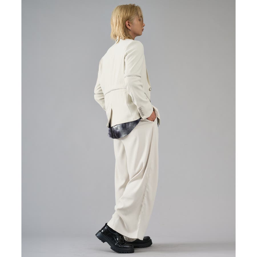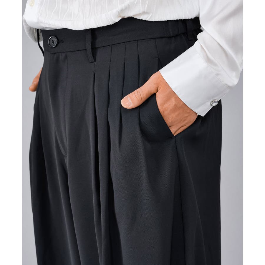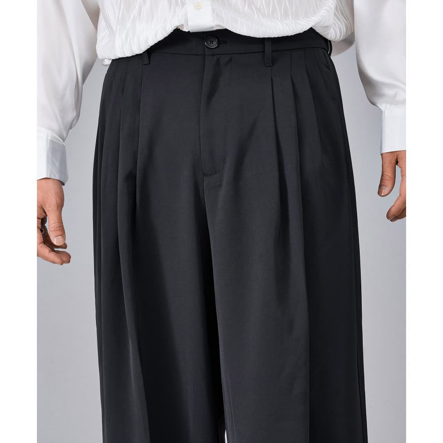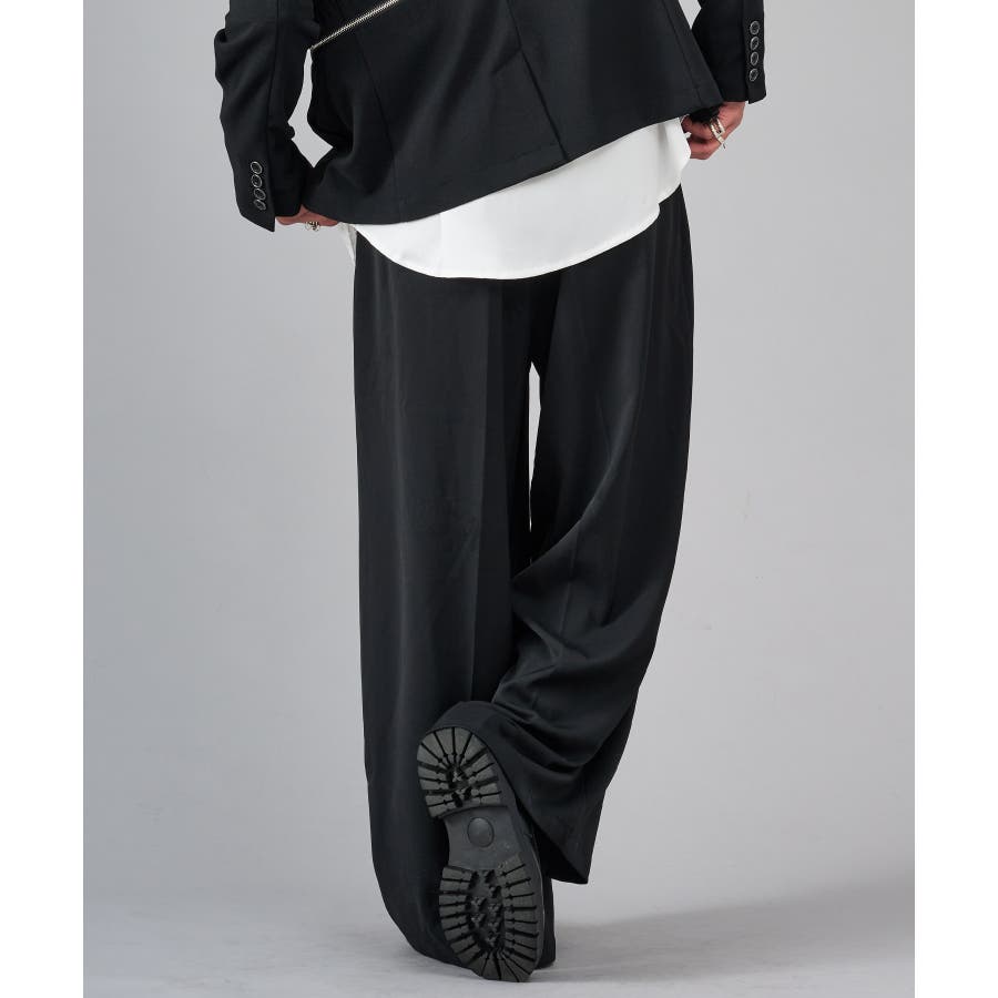旬な着こなしができる極太のワイドシルエットパンツです ■detail 履き心地もリラックスできるワイドシルエットは、4タックにすることでウエスト周りをスッキリ見せ、ハイウエストな仕様が脚長効果を高めるデザインです ベルトループもあるスラックス仕様ながら、ウエストバックはシャーリングによってリラックスして穿けます ■fabric ドレープ性のあるポリエステル素材を使用しワイドなシルエットがよりエレガントに表現されるとともに、イージーケアで扱いやすい素材です ■styling カジュアルに着崩しても、上品にドレスアップしても着回せ、同素材のテーラードジャケットとセットアップでも使えます | |||||||||||||||