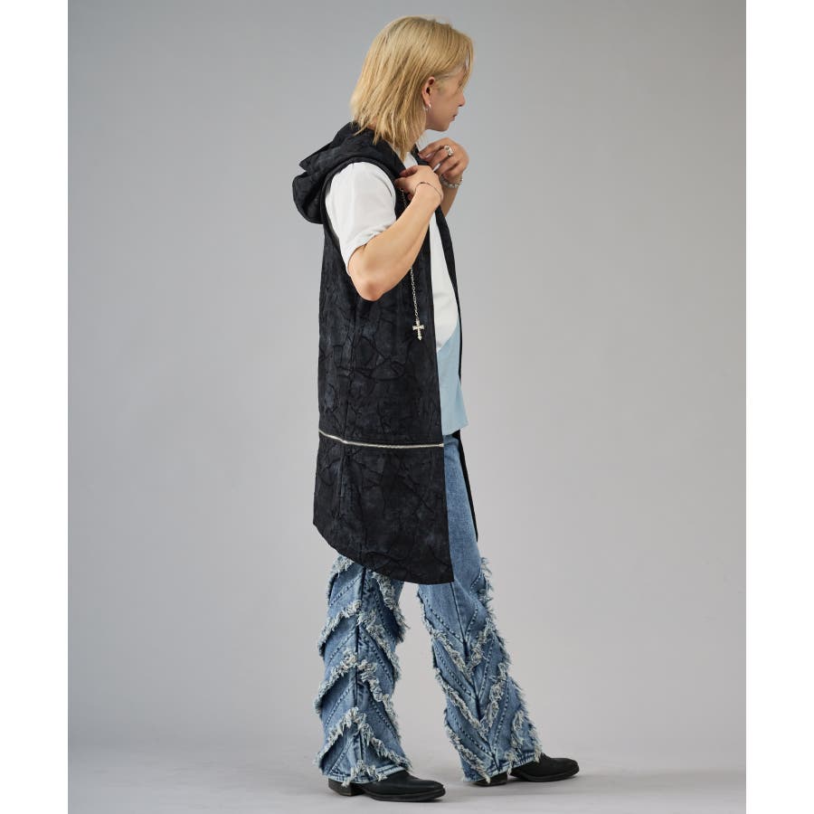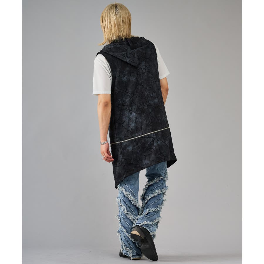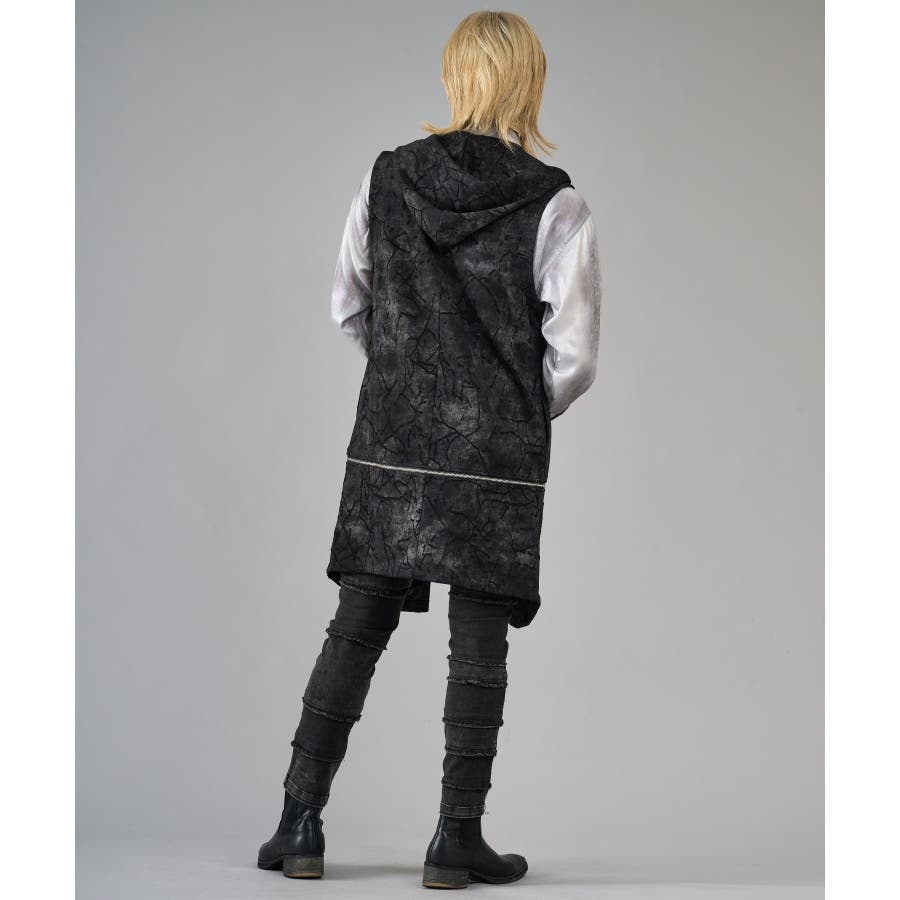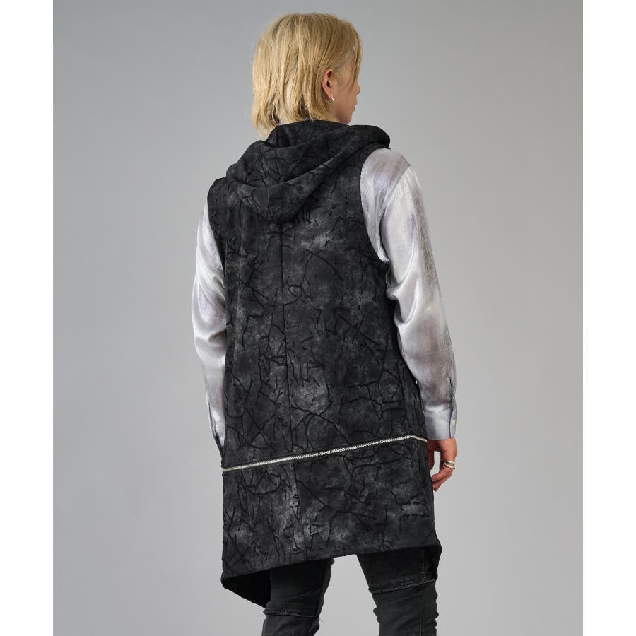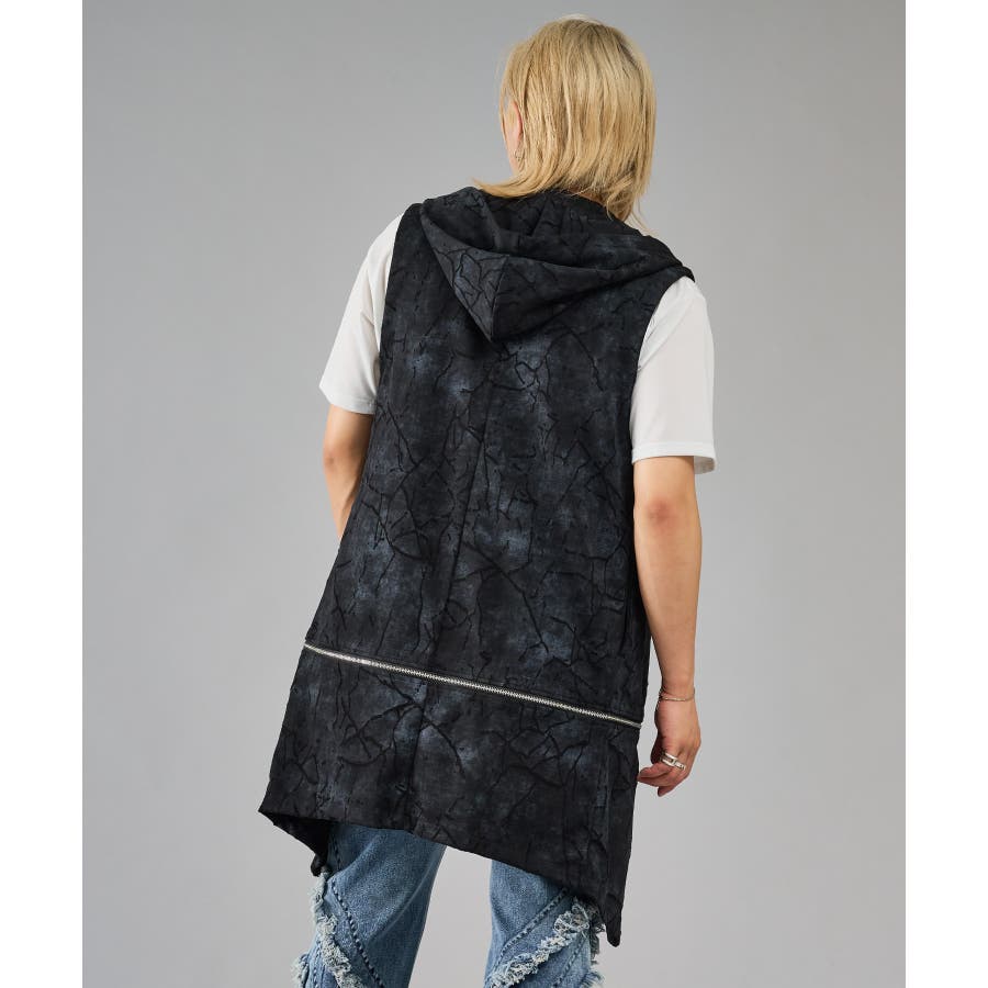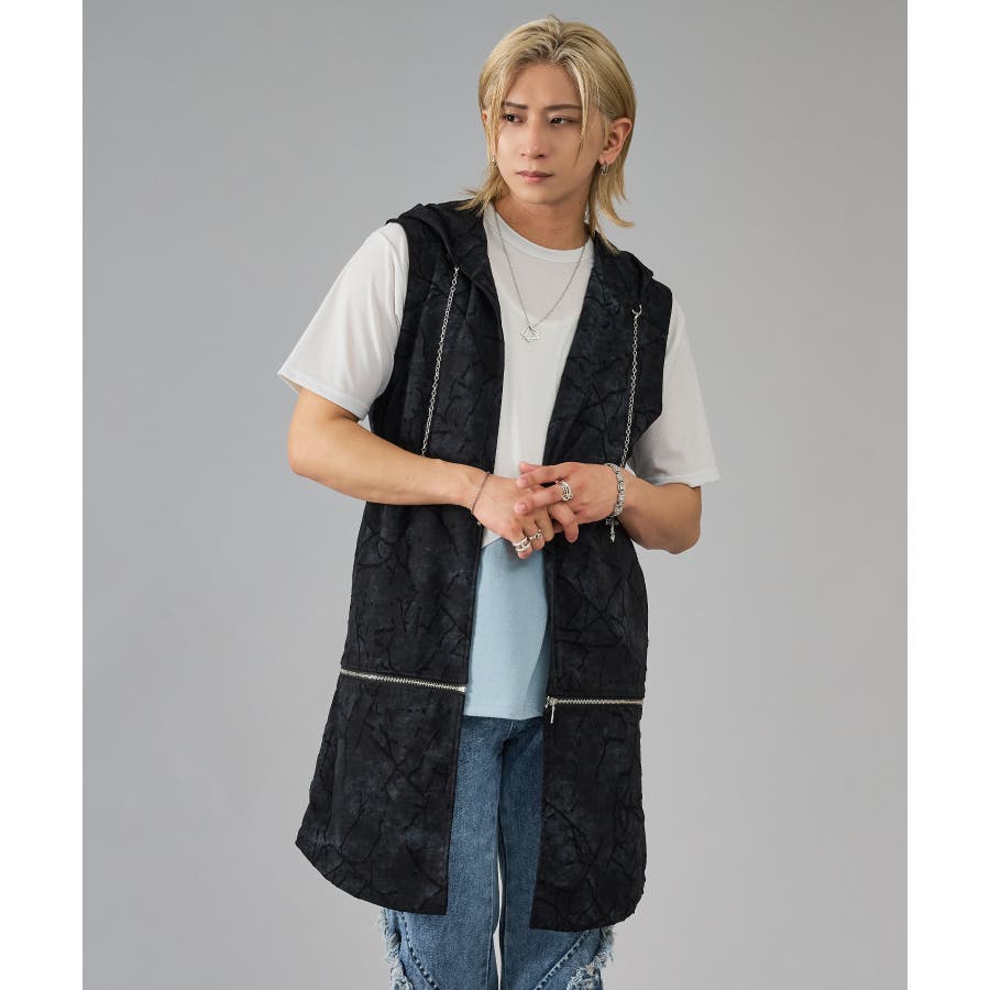ロング丈のフード付きノースリーブ ■detail 腰のファスナーで脱着することができ、ショート丈とロング丈の2パターンの着方が楽しめる 襟と一体型のフードが特徴的で、スピンドル先のクロスがクールなアクセント ■fabric 軽くてエレガントさを醸し出せるポリエステル素材にムラ染を施しています ■styling ジレ感覚でTシャツやタンクに羽織るだけでシャレ感が上がり、デニムでもスラックスでも着回しできます | ||||||||||||