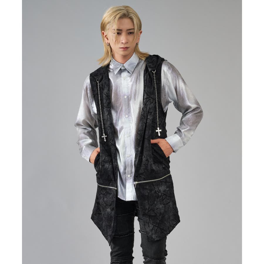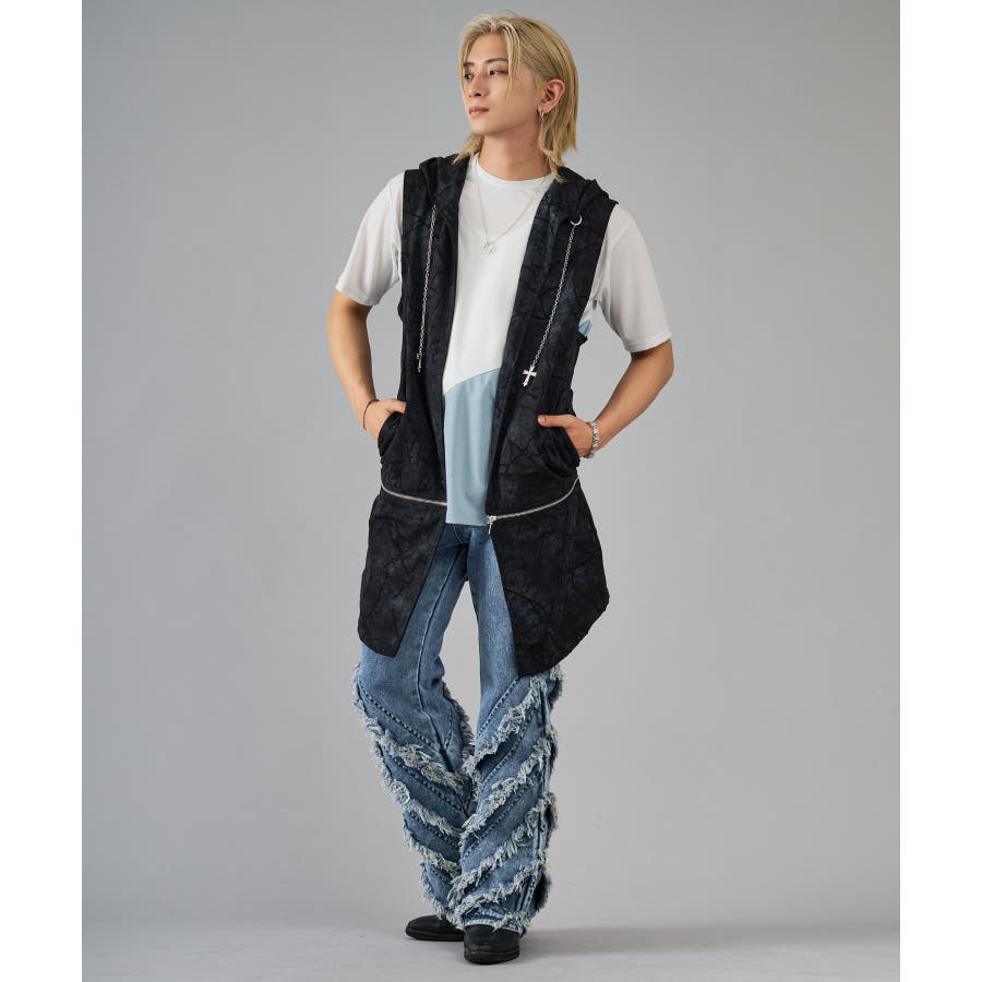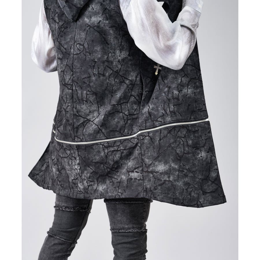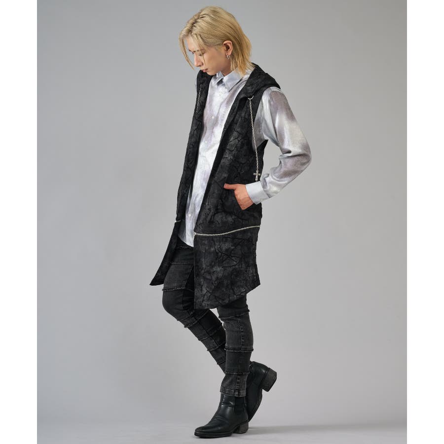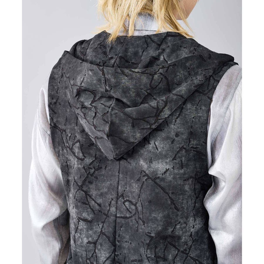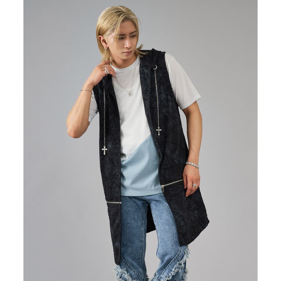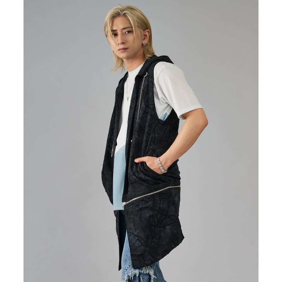 ロング丈のフード付きノースリーブ ■detail 腰のファスナーで脱着することができ、ショート丈とロング丈の2パターンの着方が楽しめる 襟と一体型のフードが特徴的で、スピンドル先のクロスがクールなアクセント ■fabric 軽くてエレガントさを醸し出せるポリエステル素材にムラ染を施しています ■styling ジレ感覚でTシャツやタンクに羽織るだけでシャレ感が上がり、デニムでもスラックスでも着回しできます | ||||||||||||