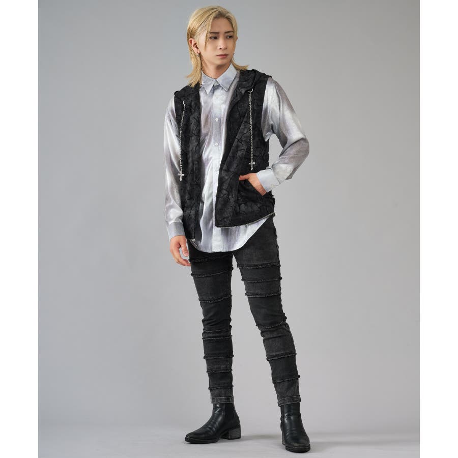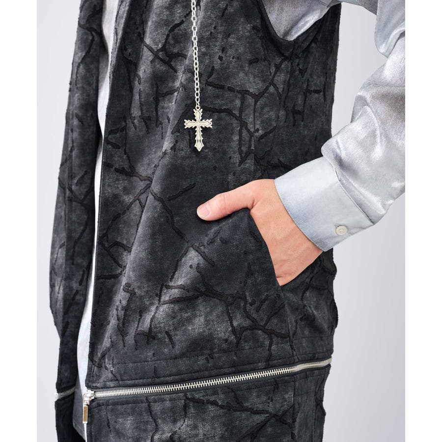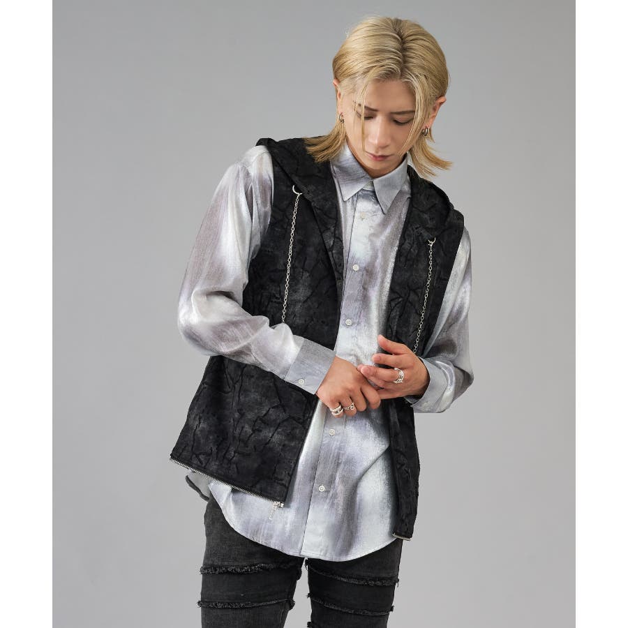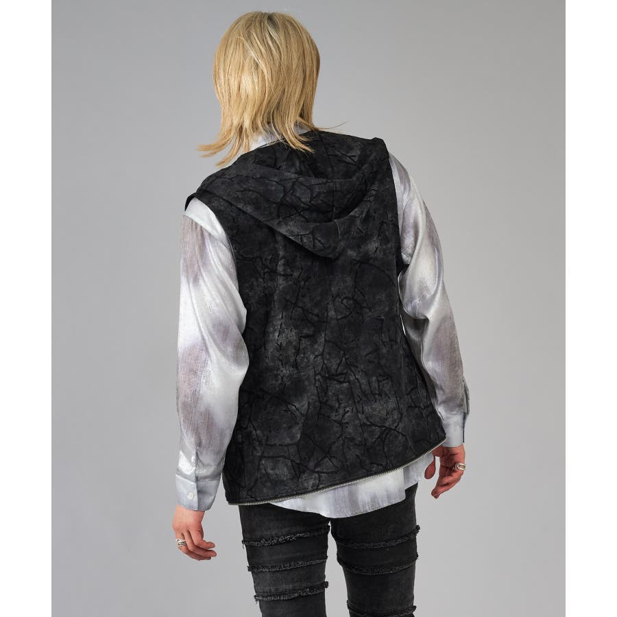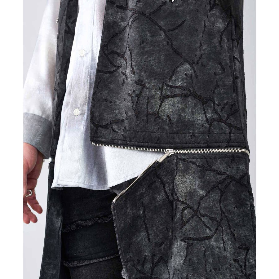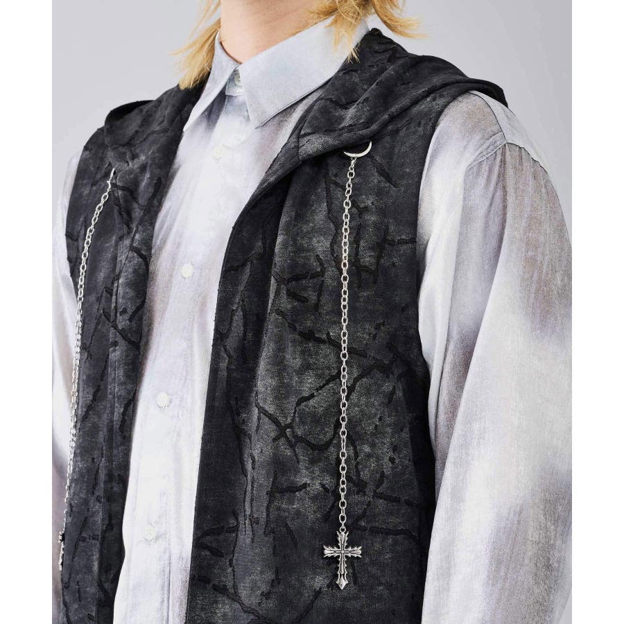 ロング丈のフード付きノースリーブ ■detail 腰のファスナーで脱着することができ、ショート丈とロング丈の2パターンの着方が楽しめる 襟と一体型のフードが特徴的で、スピンドル先のクロスがクールなアクセント ■fabric 軽くてエレガントさを醸し出せるポリエステル素材にムラ染を施しています ■styling ジレ感覚でTシャツやタンクに羽織るだけでシャレ感が上がり、デニムでもスラックスでも着回しできます | ||||||||||||