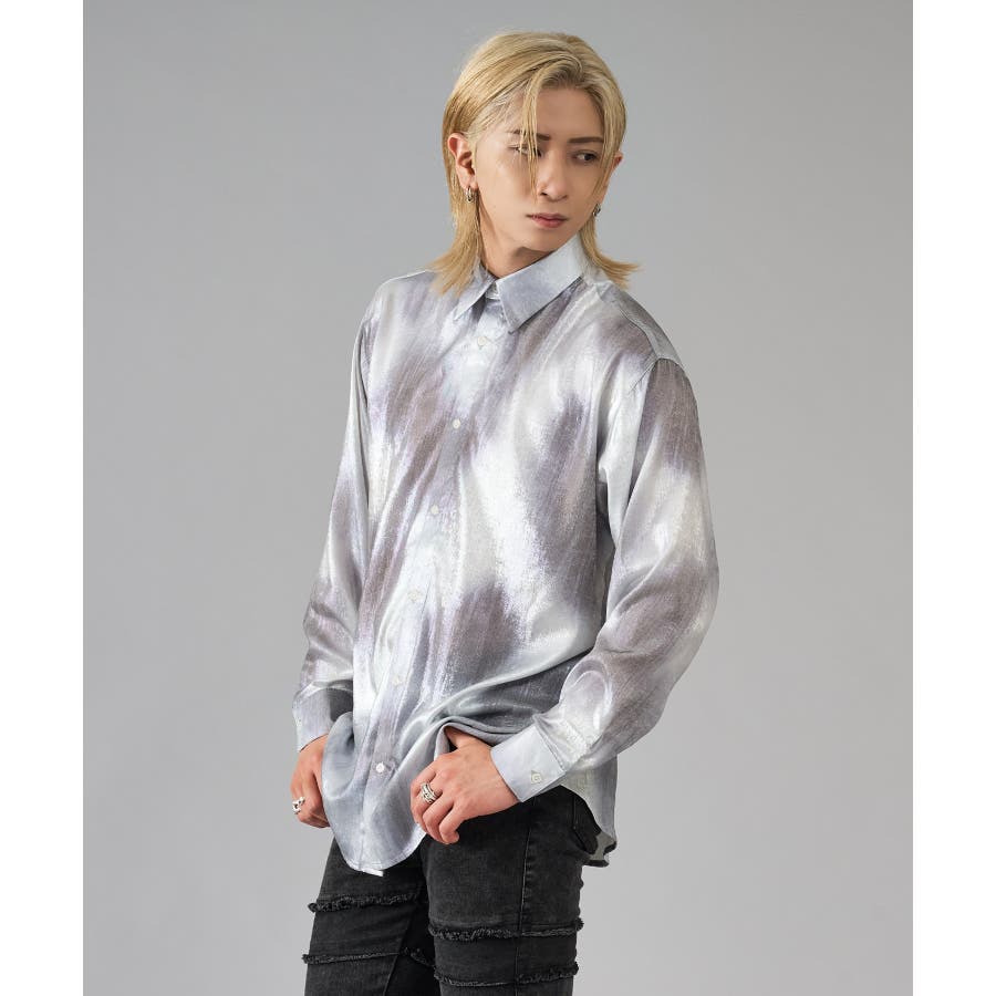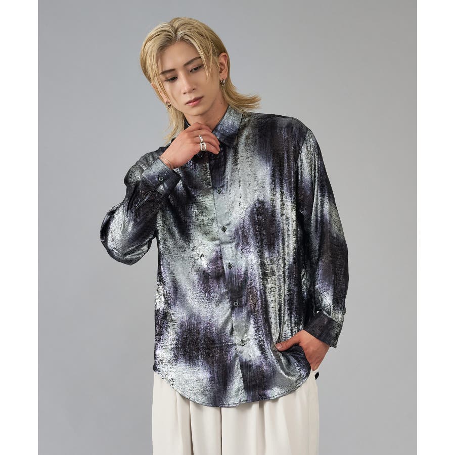 光沢が際立つラメを使った長袖シャツ ■detail ラメの光沢感にムラプリントが適度に雰囲気を落ち着かせるデザイン オーバーサイズなシルエットがラグジュアリー感も高めてくれます ■fabric 軽くてソフトな肌触りは着心地もよく、シワになりにくくイージーケア ■styling ワイドスラックスと合わせるだけで、お洒落上手な雰囲気を醸し出せます | |||||||||||||||