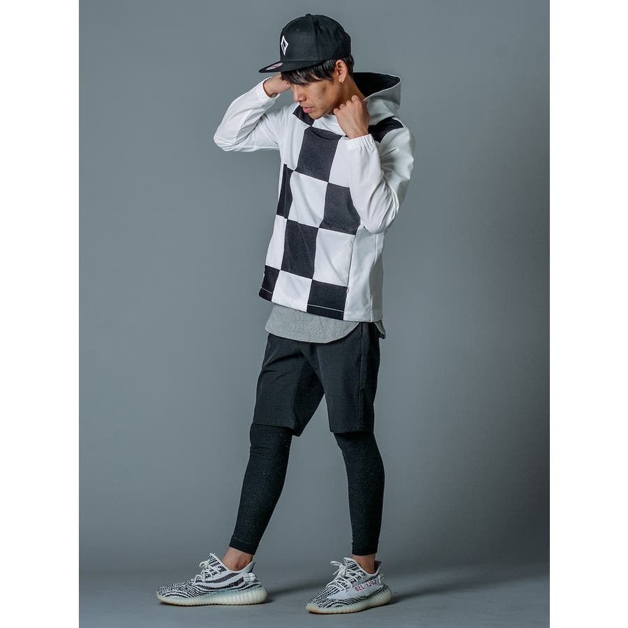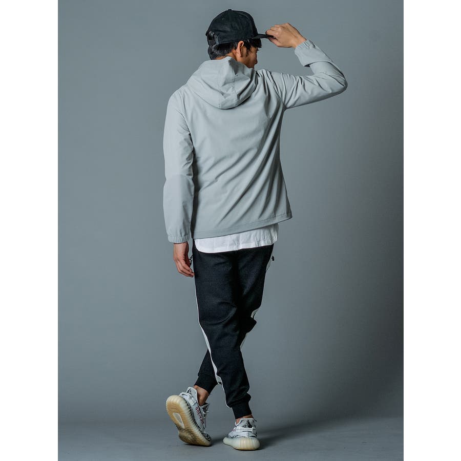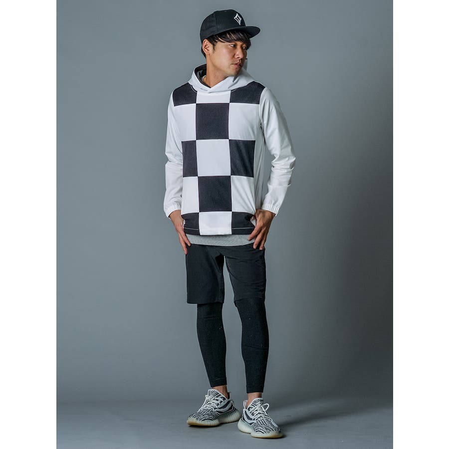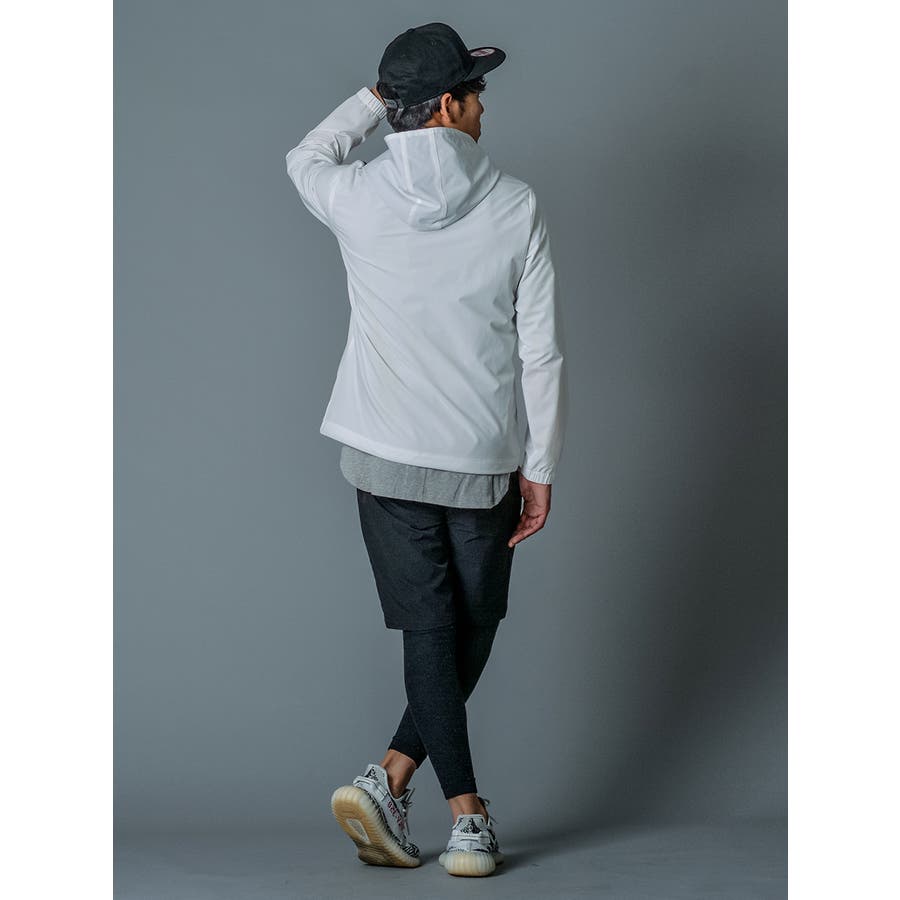 同素材のショートパンツとセットアップでスポーティな着こなしもできます。(着用モデル情報: 身長176cm, 体重65kg/Lサイズ着用)