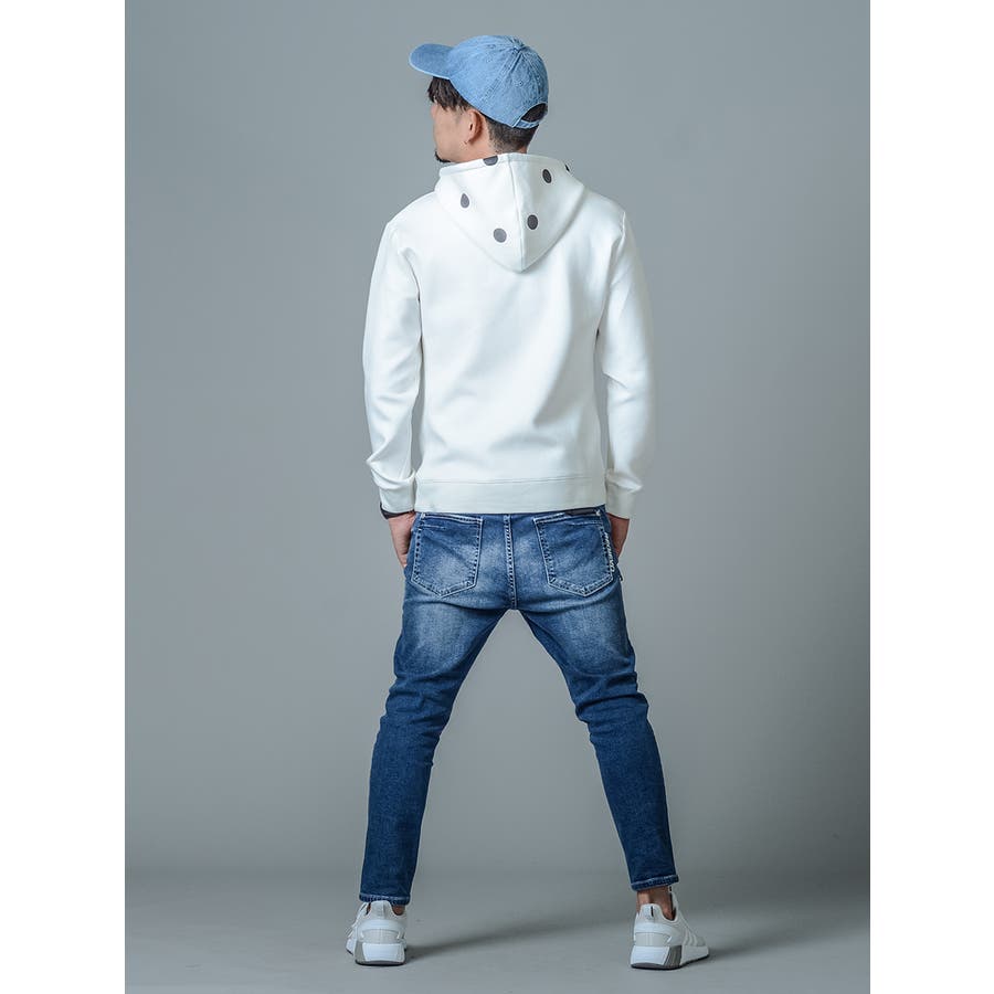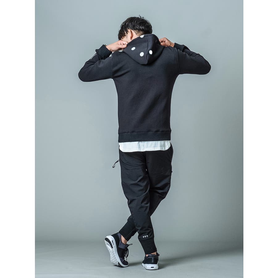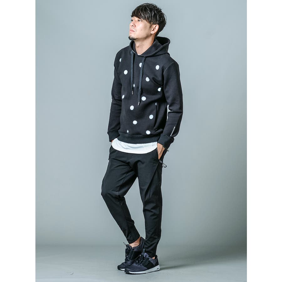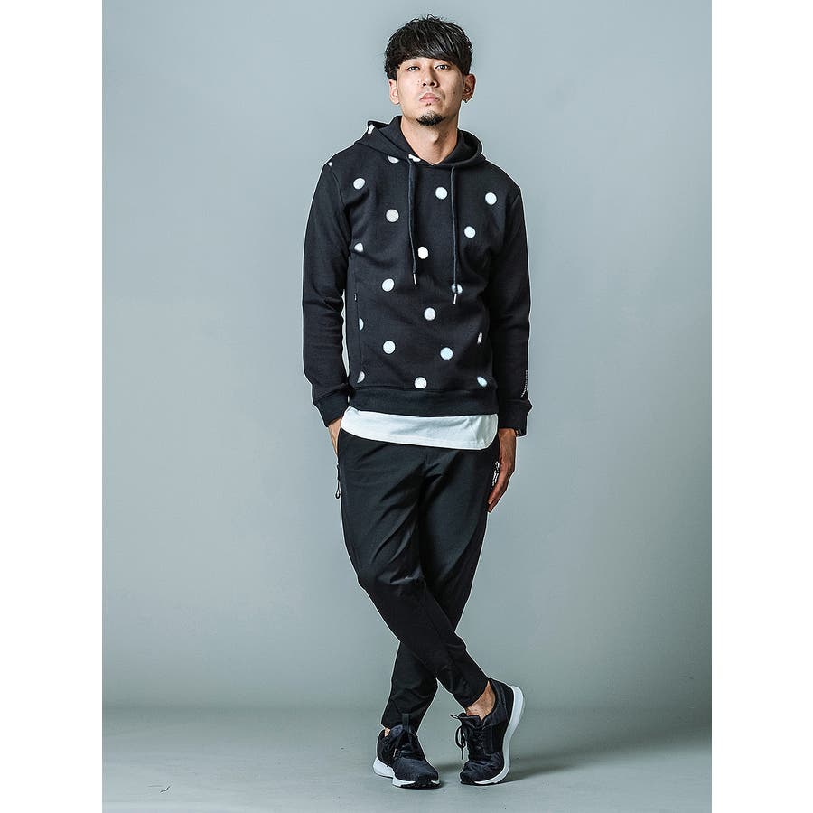 スポーティなパーカーにドット柄を施し、ポケットはサイドのシームに沿って配置することで、フロントがすっきりした都会的なデザインに仕上げています。