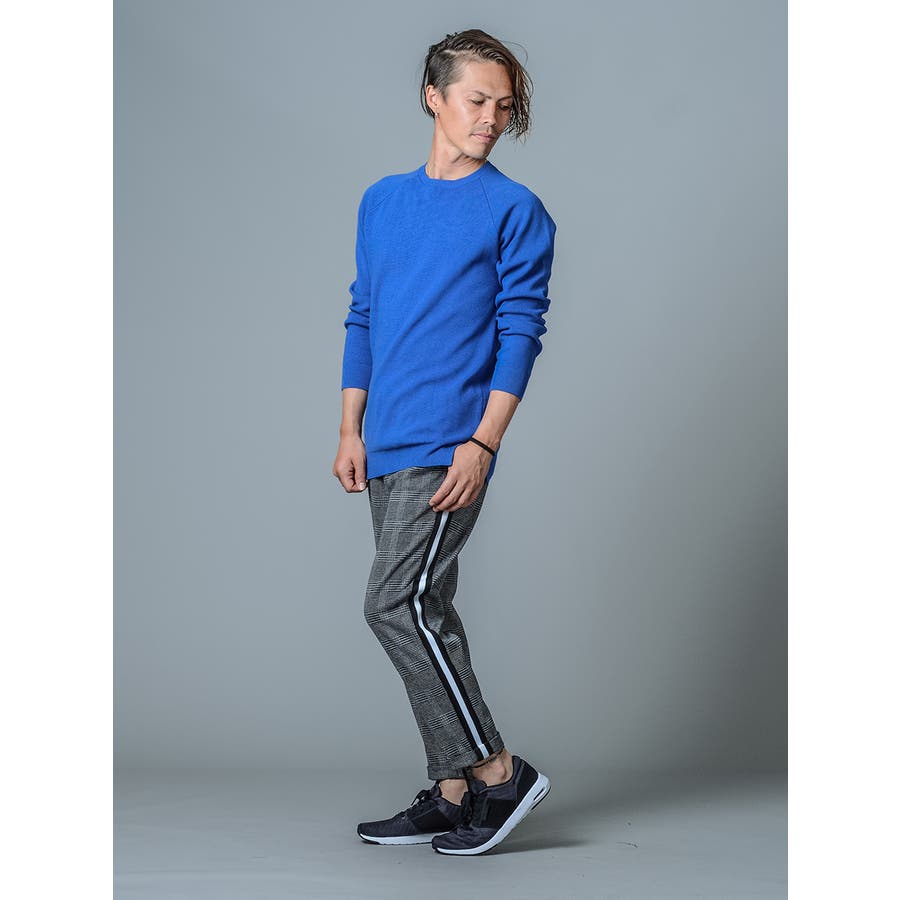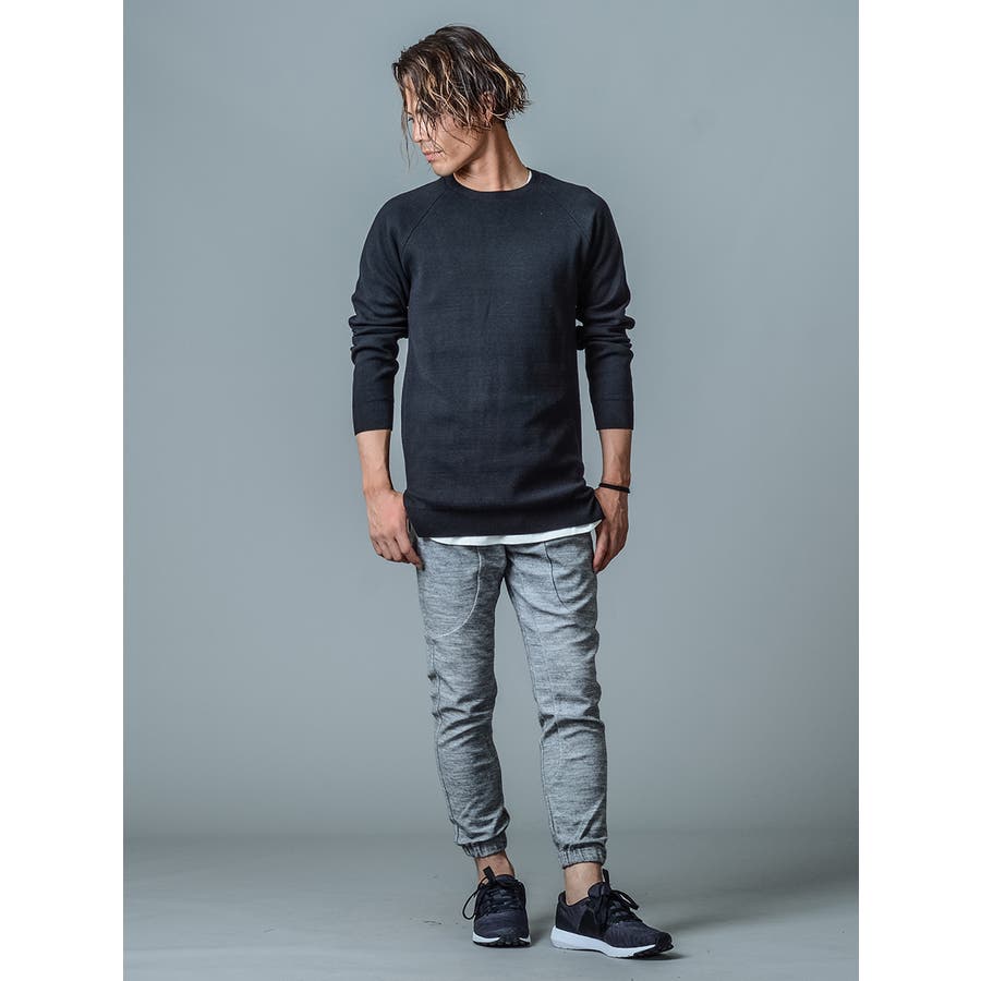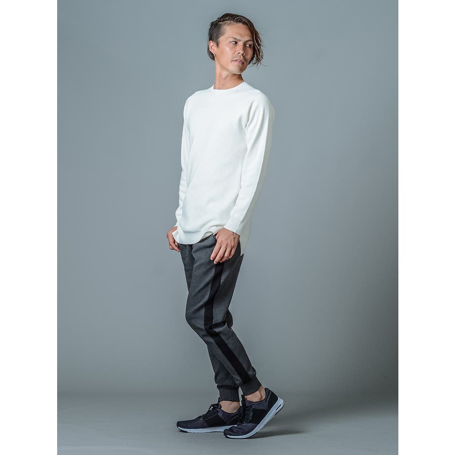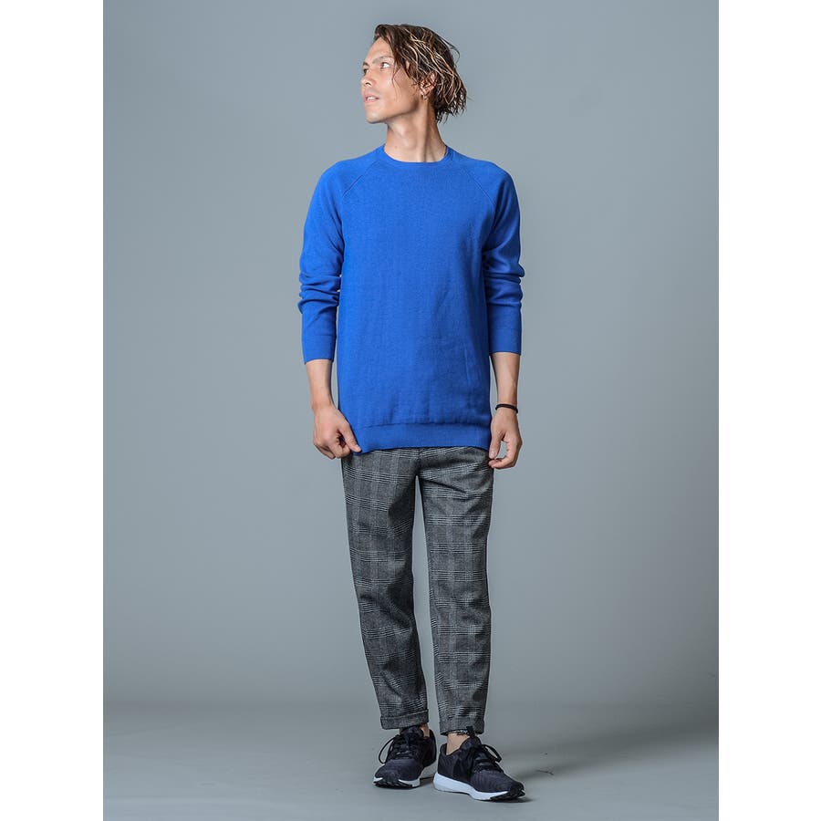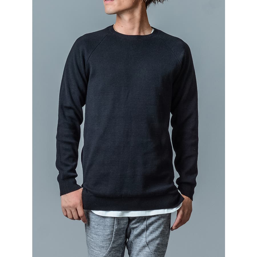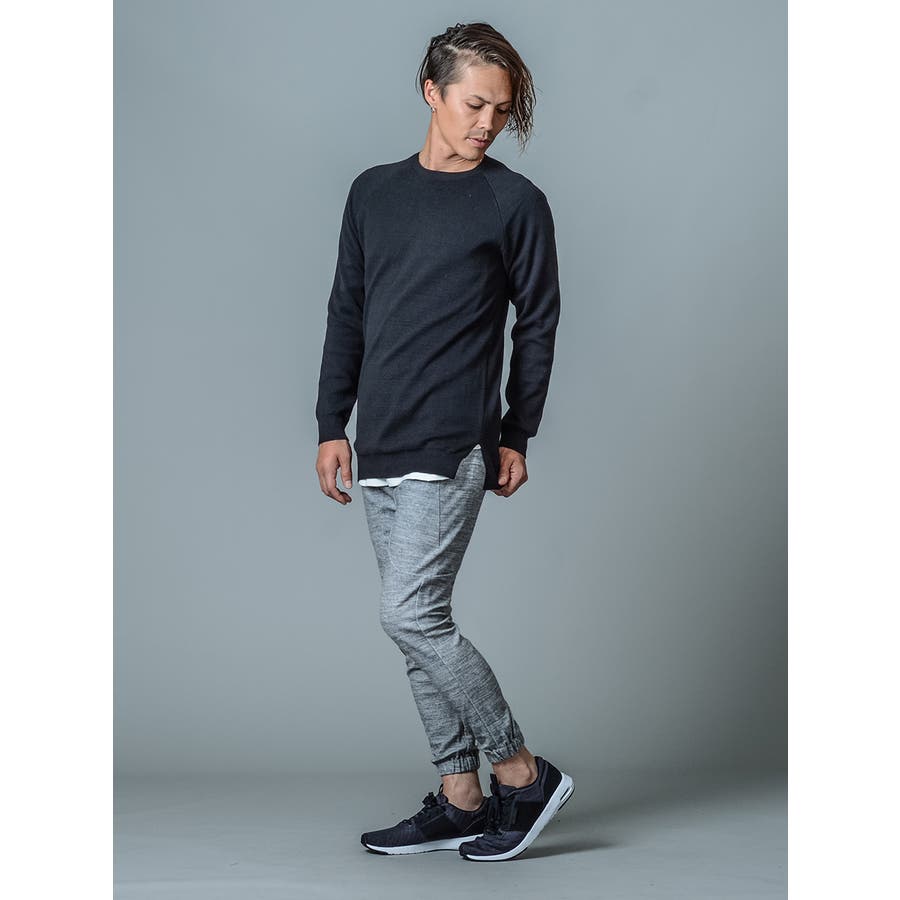 ドロップショルダー風にゆとりのあるラグランスリーブで、アウターから裾が出るやや長めのシルエットです。