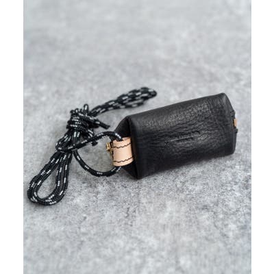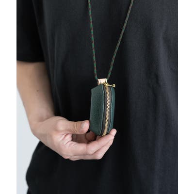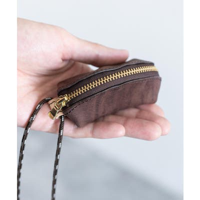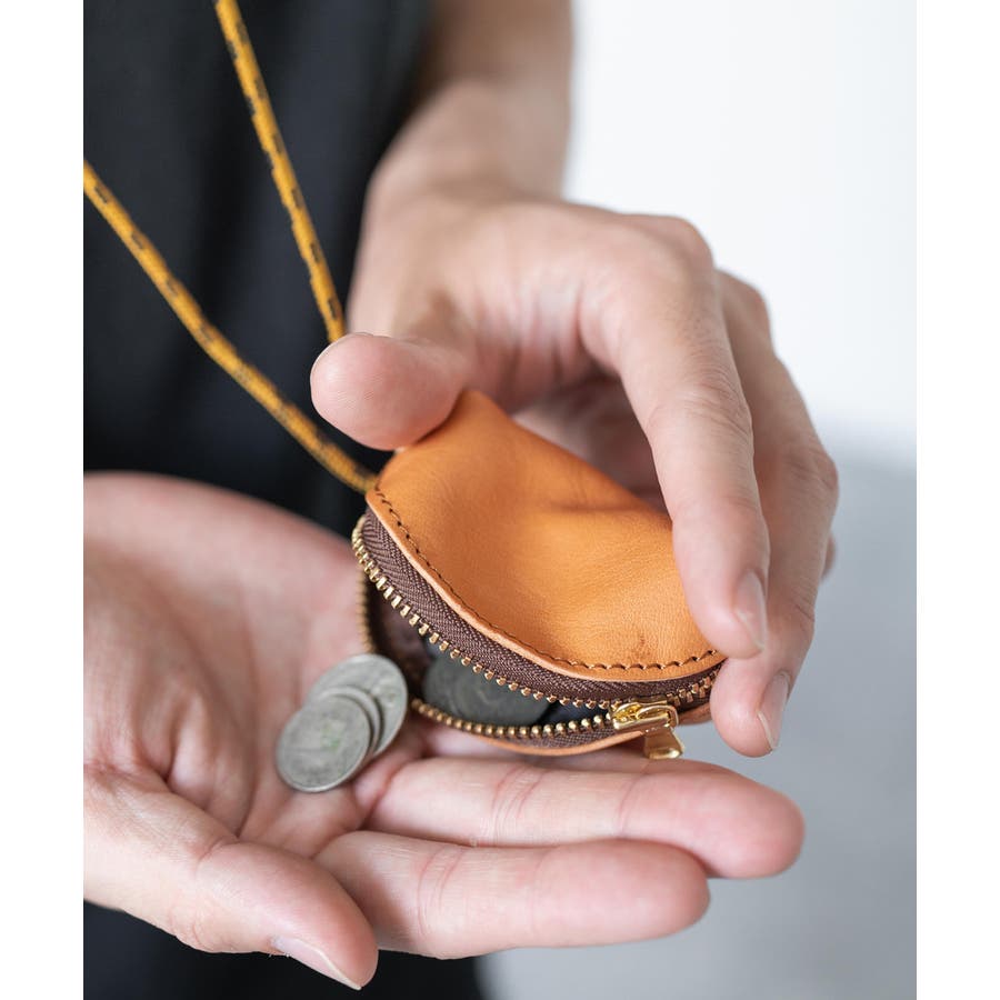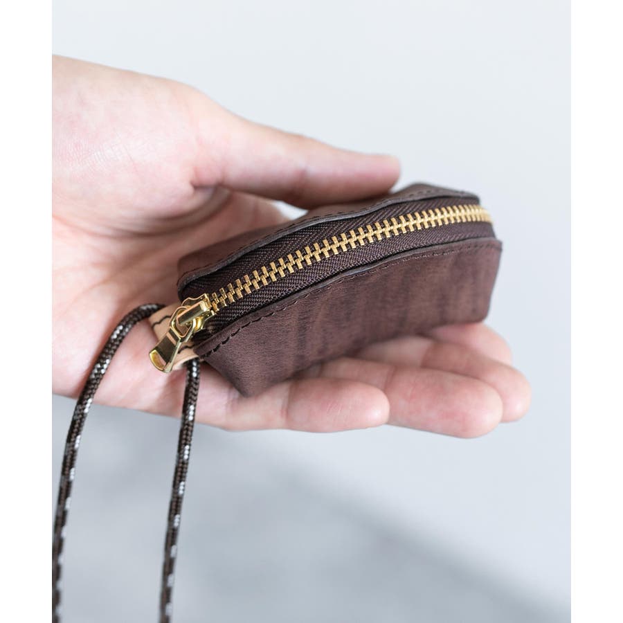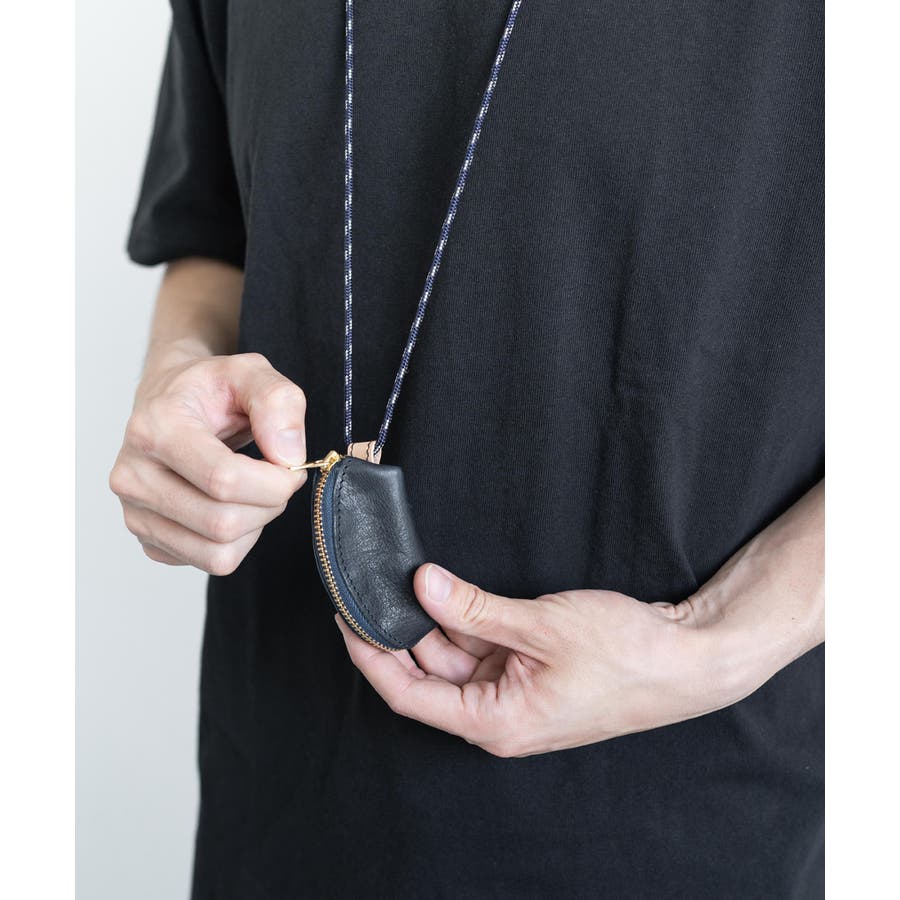 ファスナーサイドのヌメ革のループに、丸紐を通して首からぶら下げることができます。