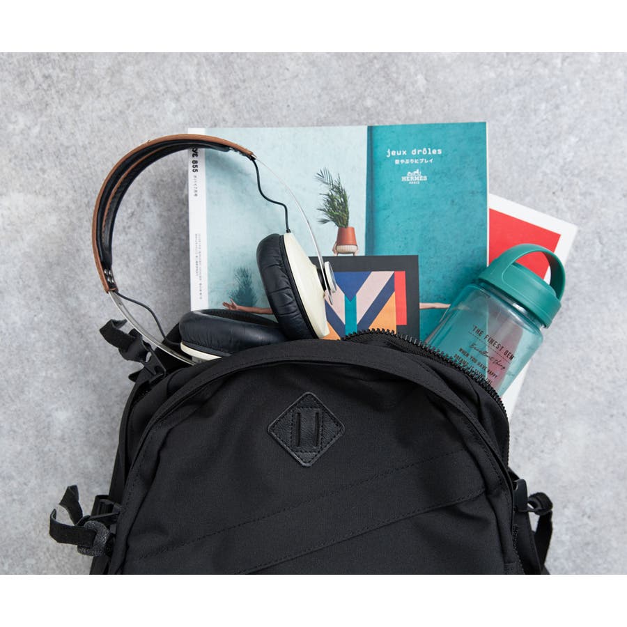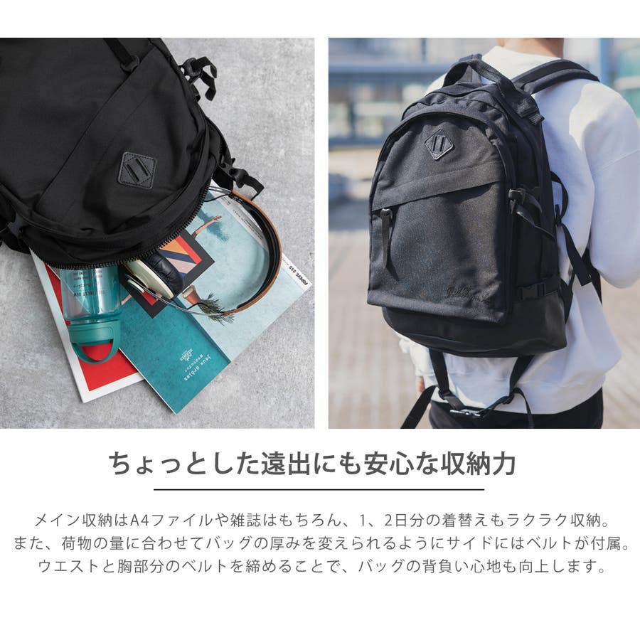 メイン収納はA4ファイルや雑誌はもちろん、1、2日分の着替えもラクラク収納。外ポケットはA4サイズの書類が入るくらいの大きさで頼もしいサイズ感です。また、荷物の量に合わせてバッグの厚みを変えられるようにサイドにはベルトが付属。ウエストと胸部分のベルトを締めることで、バッグの背負い心地も向上します。デザインだけではなく、使い勝手も良く、すべてのディテールにこだわったアイテムです。