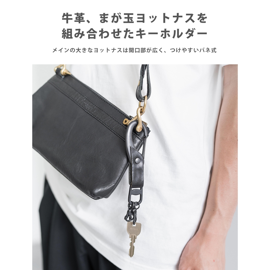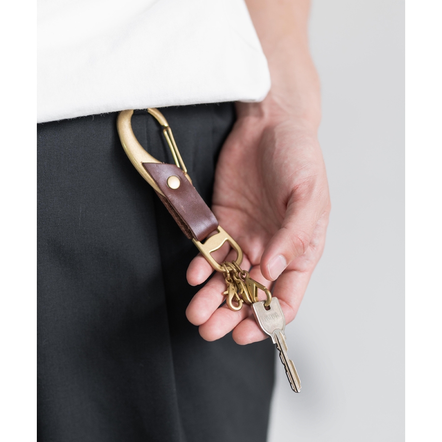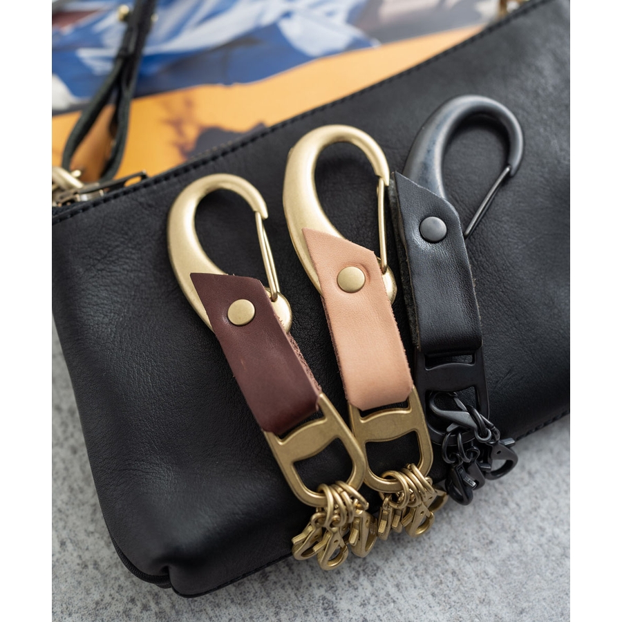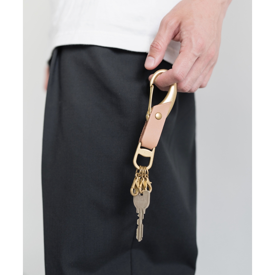 船具で使われる丈夫なマガタマ型の金具を使用した、4連キーホルダー。メインの大きなヨットナスは開口部が広く、装着しやすいバネ式になっています。ハードな作りでありながら、丸みのある形でどんな服装にもマッチします。ボトムスのベルトループや鞄に取り付け、アクセサリーとしても存在感を発揮!