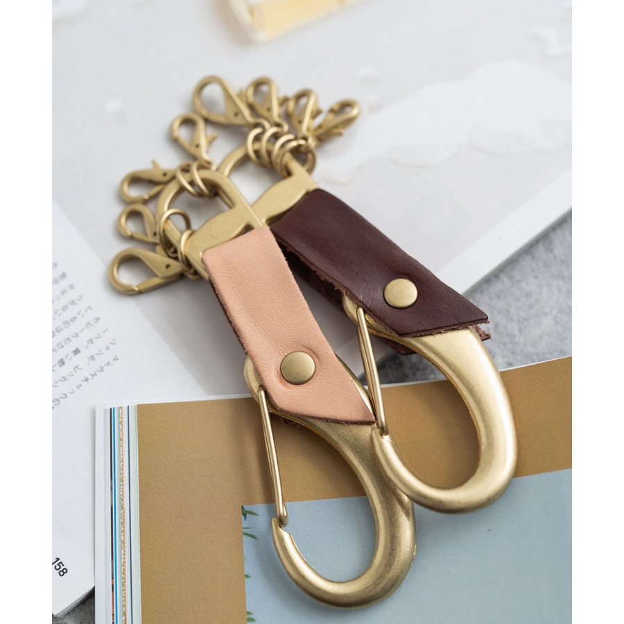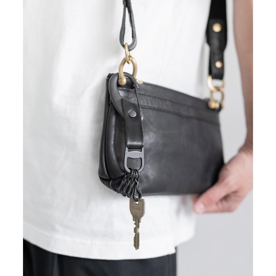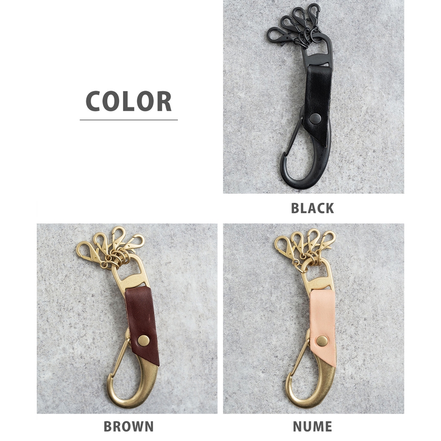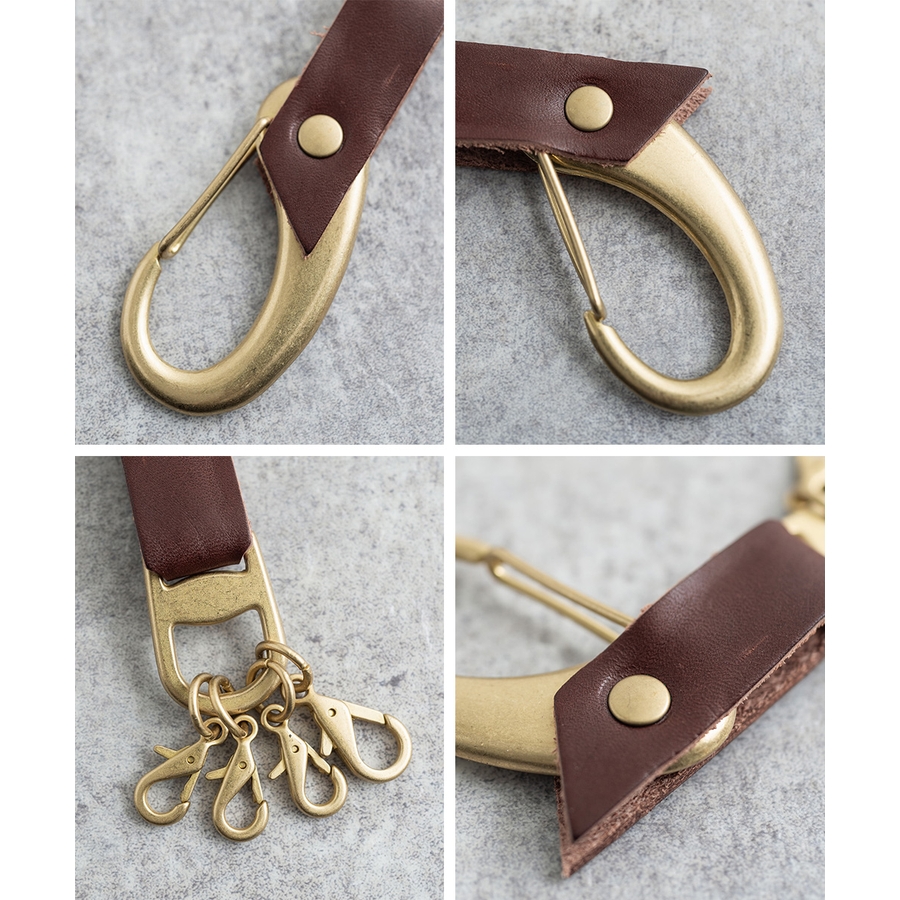 船具で使われる丈夫なマガタマ型の金具を使用した、4連キーホルダー。メインの大きなヨットナスは開口部が広く、装着しやすいバネ式になっています。ハードな作りでありながら、丸みのある形でどんな服装にもマッチします。ボトムスのベルトループや鞄に取り付け、アクセサリーとしても存在感を発揮!