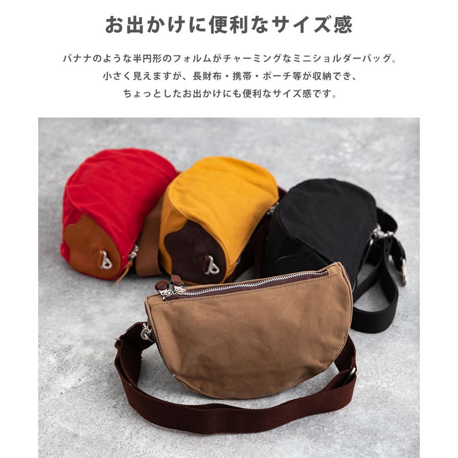 バナナのような半円形のフォルムがチャーミングなミニショルダーバッグ。小さく見えますが、タウンでの使用には十分に対応できる大きさがあります。長財布・携帯・ポーチ等が収納でき、ちょっとしたお出かけにも便利なサイズ感です。メイン口は荷物の出し入れがしやすいダブルファスナー開閉式です。内側にも小物収納に便利な小さめのオープンポケットを2つ配置しています。