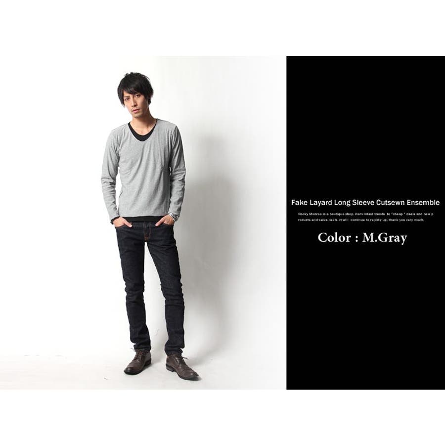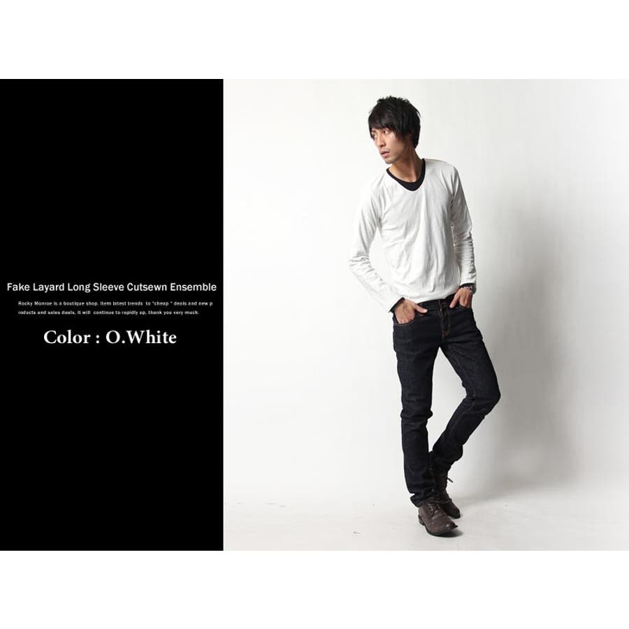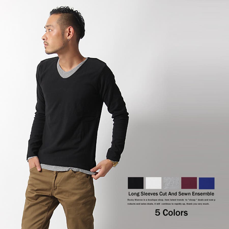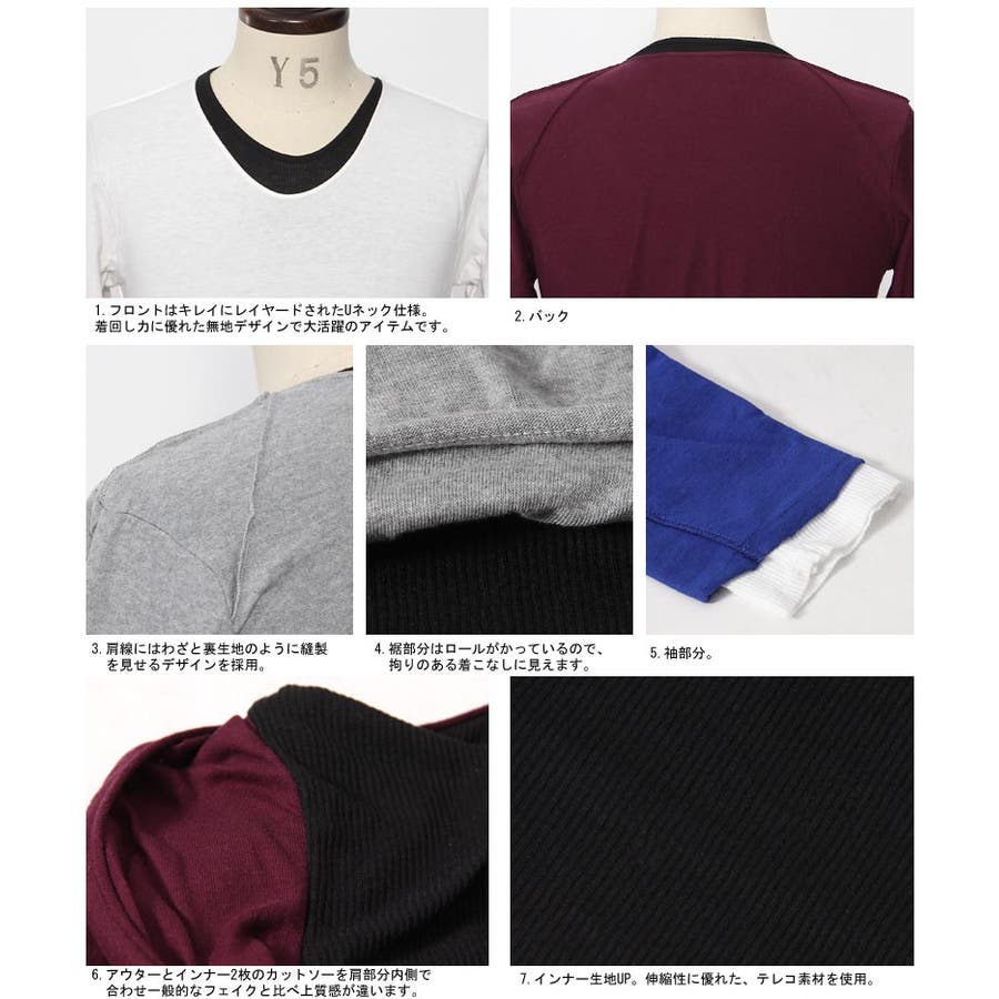 フェイクレイヤード長袖無地Uネックカットソー メンズ ロンTシャツ